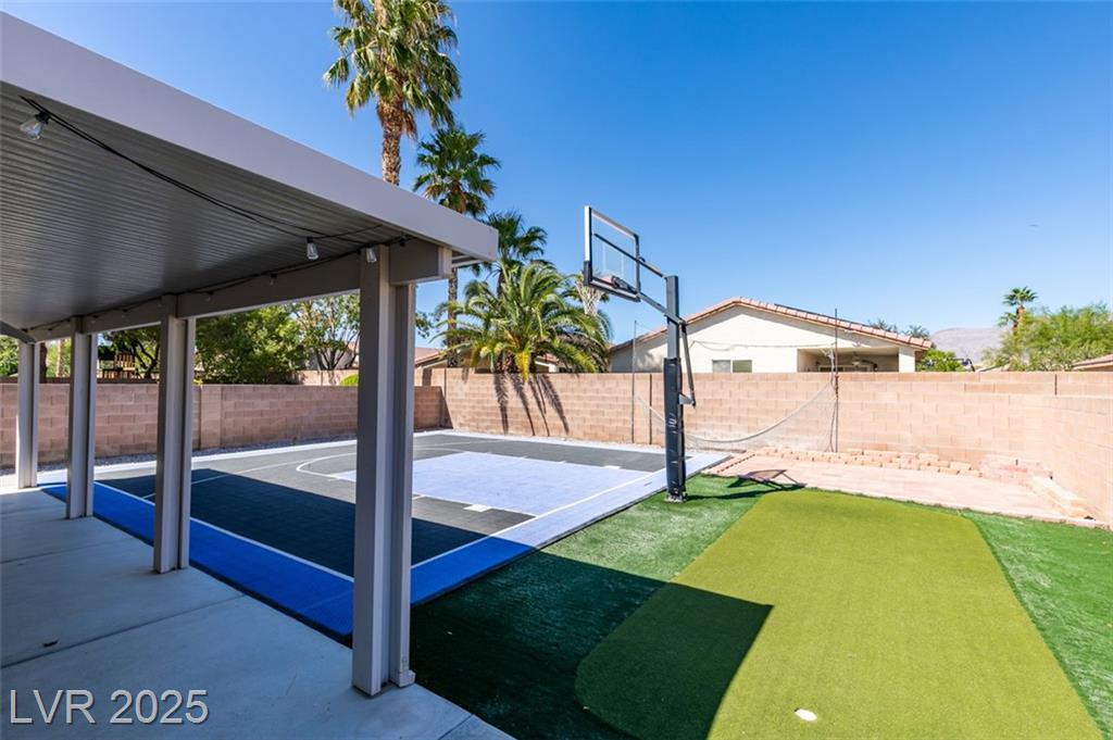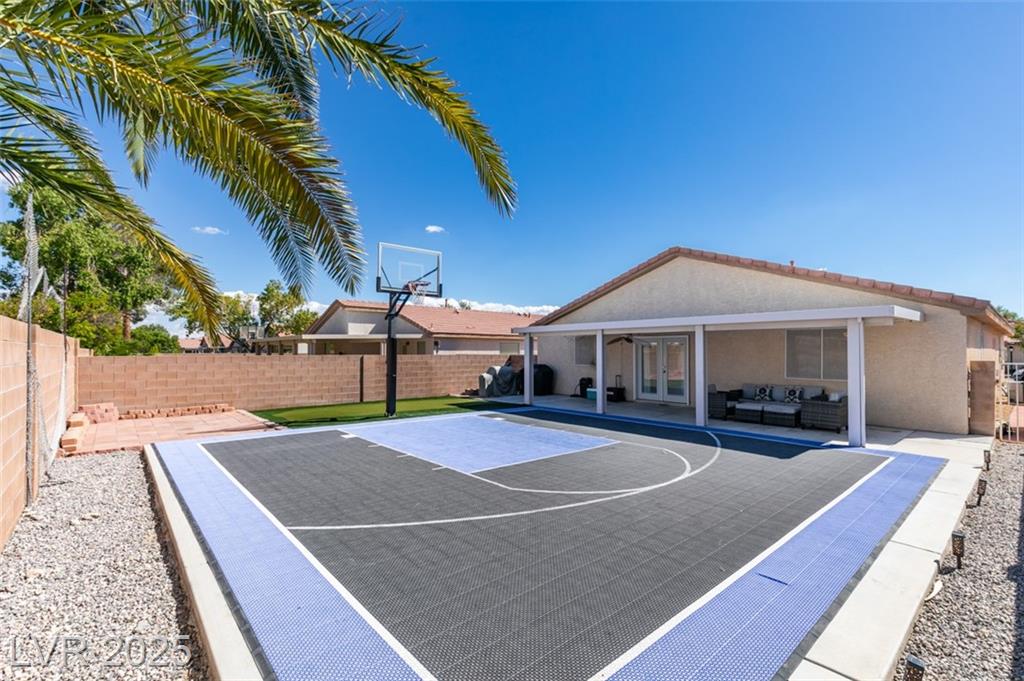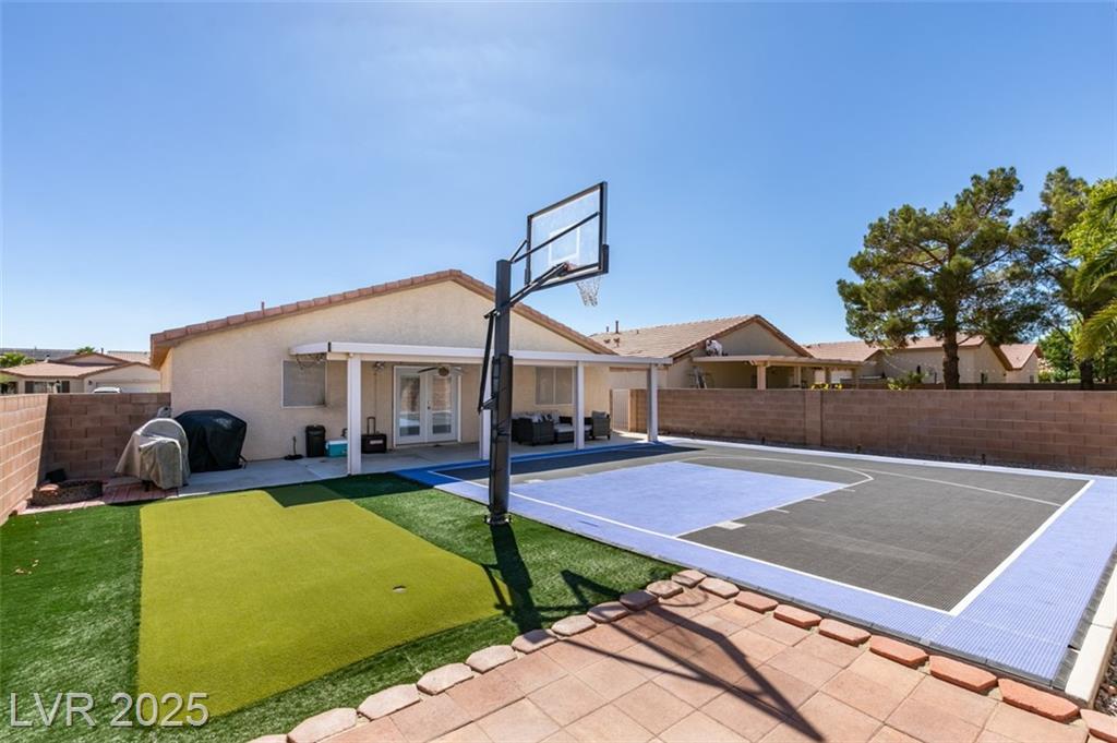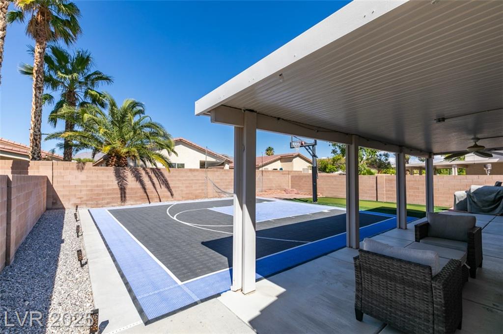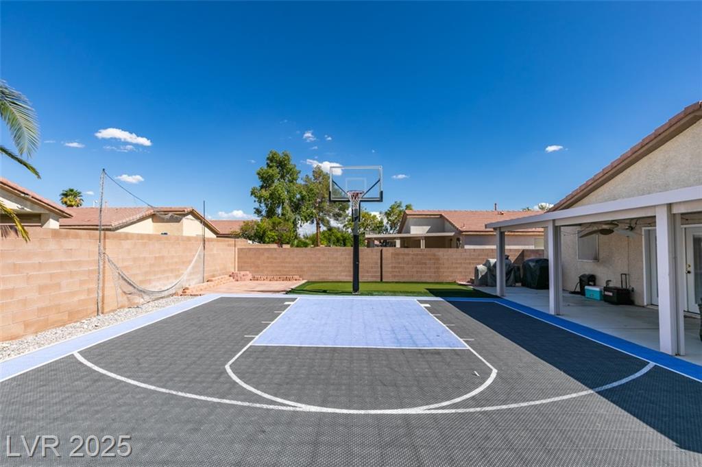 SINGLE STORY HOME IN GATED COMMUNITY!! BACKYARD FEATURES A CUSTOM BASKETBALL COURT AND ENTERTAINMENT AREA W/ GAS GRILL STUB OUT READY FOR THOSE FUN SUMMER EVENINGS! LARGE COVERED PATIO!! GREAT OPEN FLOOR PLAN!! SPACIOUS WALK-IN MASTER CLOSET..DUAL SINKS IN MASTER BATH!! PROGRAMMABLE THERMOSTAT, SOLAR SCREENS, ENERGY EFFICIENT DOOR TO PATIO, NEW HOT WATER HEATER & GARAGE DOOR OPENER! WINDOW COVERINGS THRU-OUT. HONEY MAPLE CABINETS.