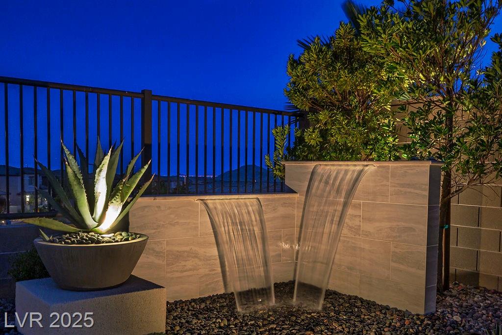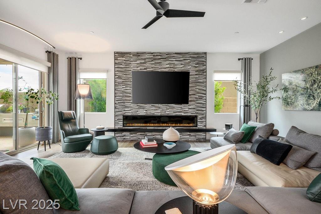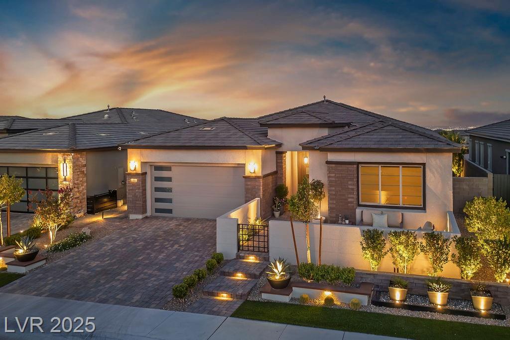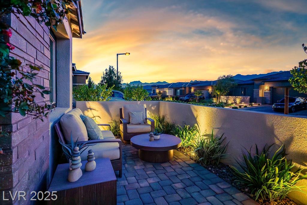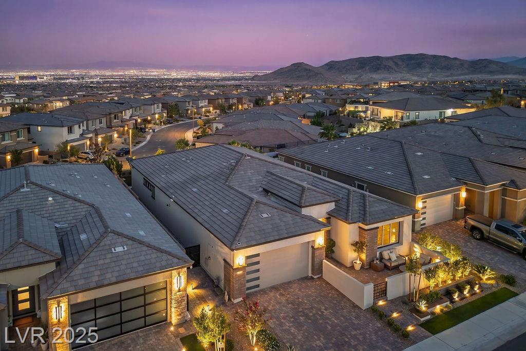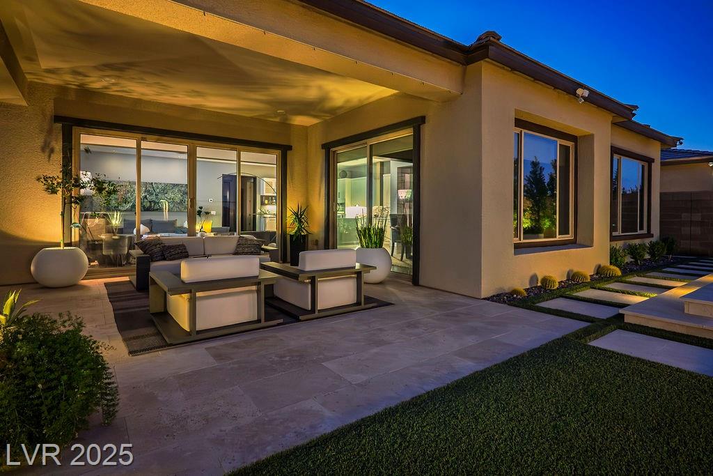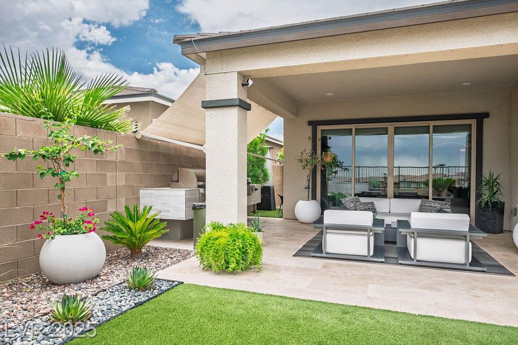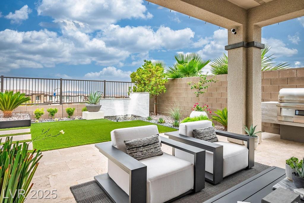 UNBELIEVABLE 3 bedroom, 3 bath single-story home with den and 3-car garage in a gated community, showcasing custom upgrades inside and out! This home has been elevated to the Xtreme with a resort-style backyard featuring a full outdoor kitchen with pellet grill, EVO skillet, electric awning, professional misting system, fire pit, and waterfall. Enjoy breathtaking sunsets with sweeping mountain and Strip views. Home includes hardwood floors, wood-accented archways, a dramatic 101” linear fireplace, and custom cabinetry/closets throughout. The kitchen includes an extended pantry, roll-out drawers, built-in island storage, under-cabinet lighting, a custom bistro bar with beverage fridge, and a wine cooler. Perfect for enjoying your morning cappuccino at home! The luxurious primary suite boasts an oversized low-threshold glass shower and a California Closets build-out. With too many upgrades to list, this stunning home is truly one-of-a-kind and waiting for you to call it home!