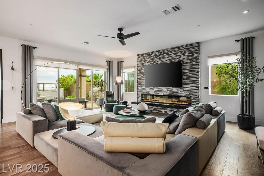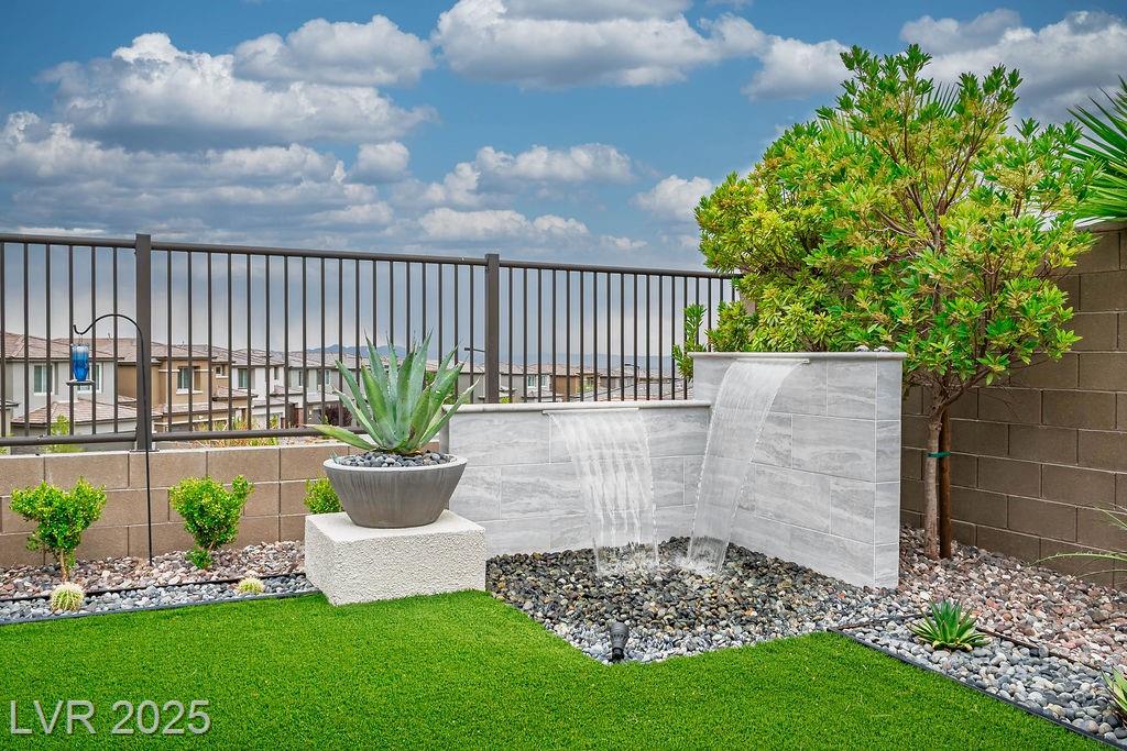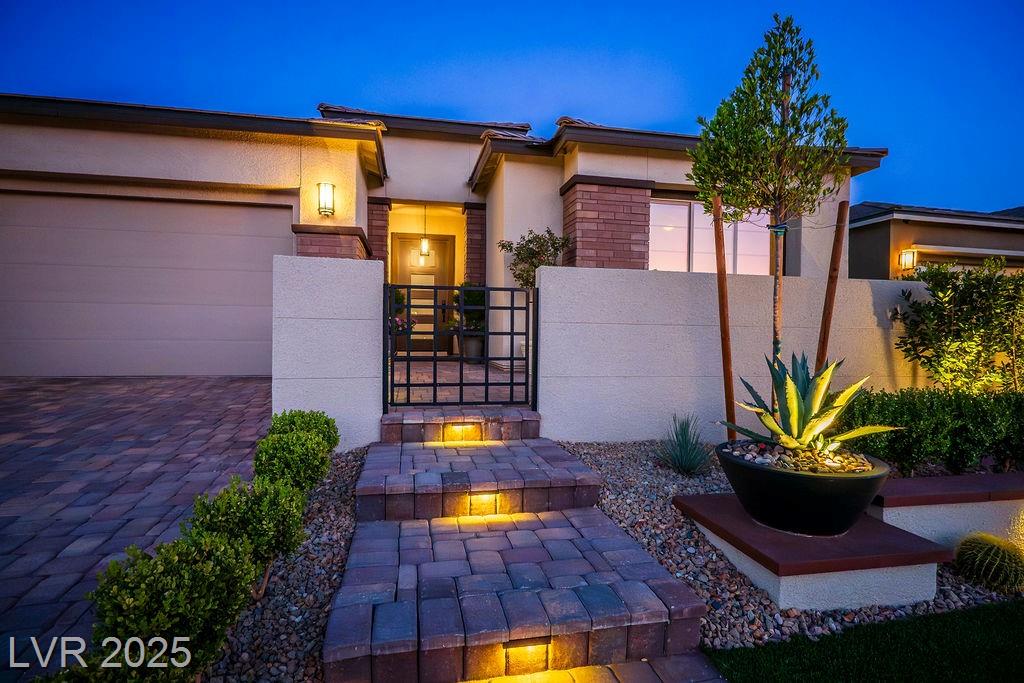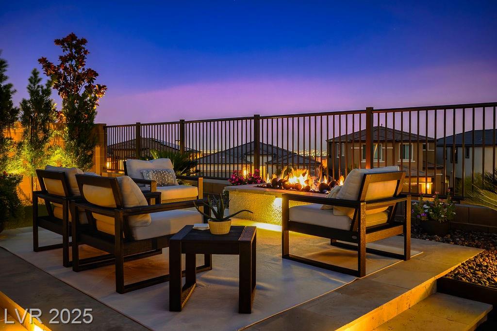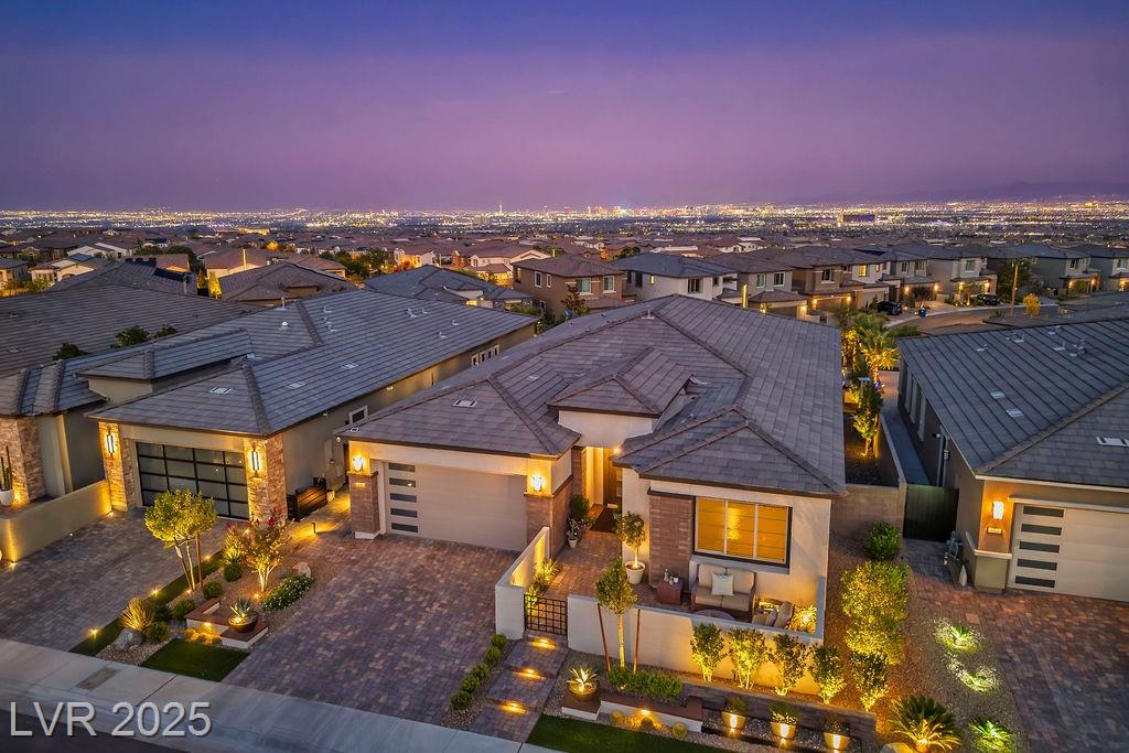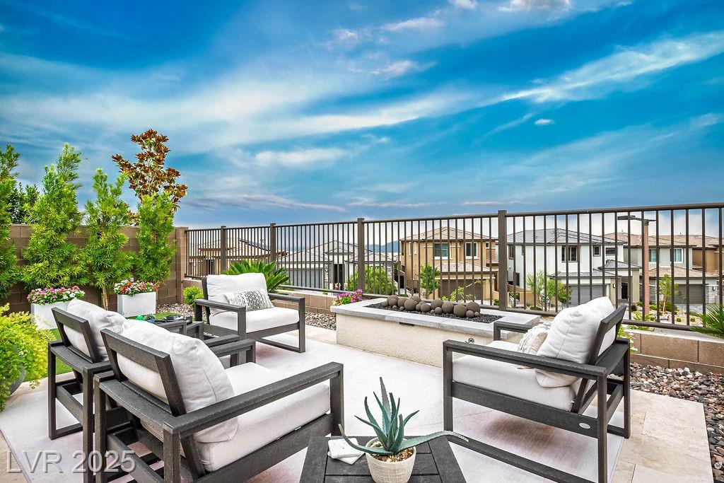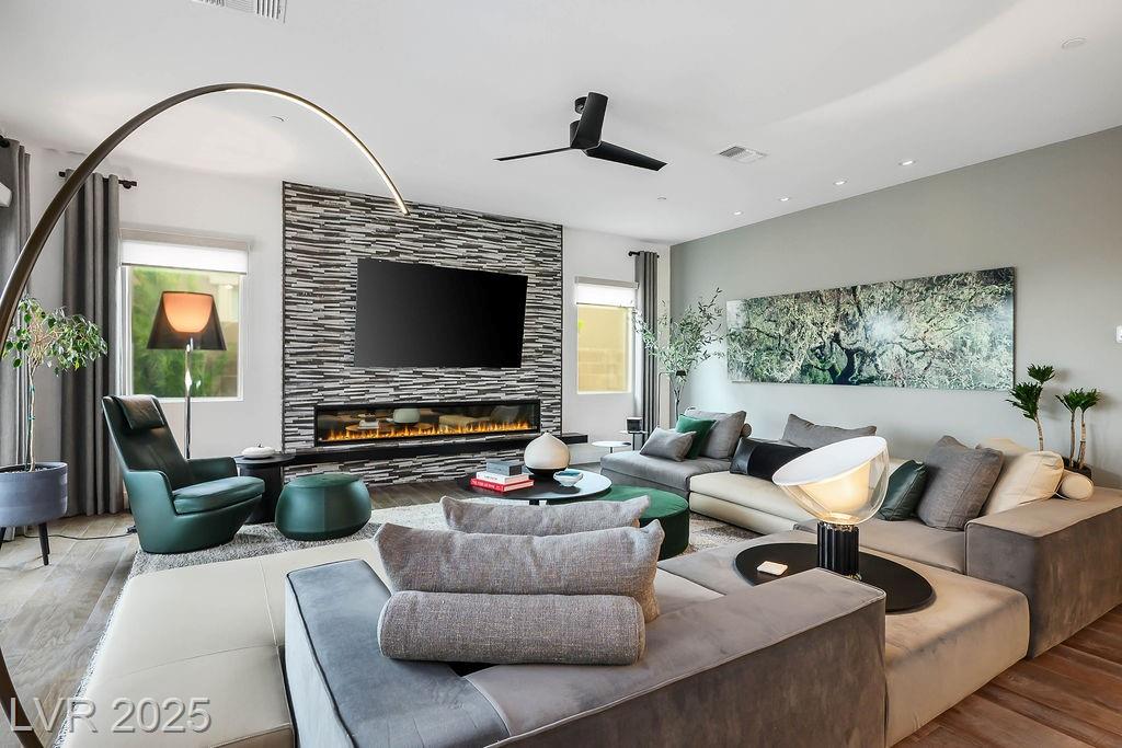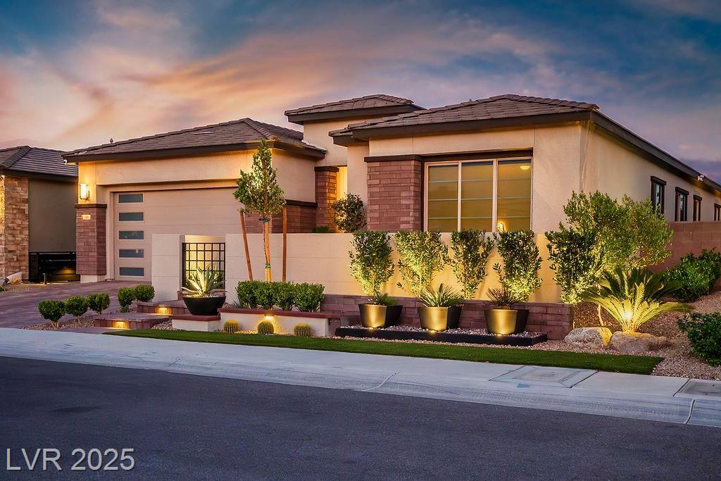 UNBELIEVABLE 3 bedroom, 3 bath single-story home with den and 3-car garage in a gated community, showcasing custom upgrades inside and out! This home has been elevated to the Xtreme with a resort-style backyard featuring a full outdoor kitchen with pellet grill, EVO skillet, electric awning, professional misting system, fire pit, and waterfall. Enjoy breathtaking sunsets with sweeping mountain and Strip views. Home includes hardwood floors, wood-accented archways, a dramatic 101” linear fireplace, and custom cabinetry/closets throughout. The kitchen includes an extended pantry, roll-out drawers, built-in island storage, under-cabinet lighting, a custom bistro bar with beverage fridge, and a wine cooler. Perfect for enjoying your morning cappuccino at home! The luxurious primary suite boasts an oversized low-threshold glass shower and a California Closets build-out. With too many upgrades to list, this stunning home is truly one-of-a-kind and waiting for you to call it home!