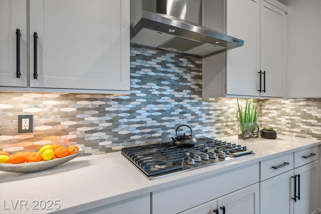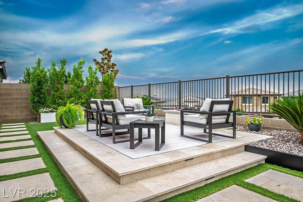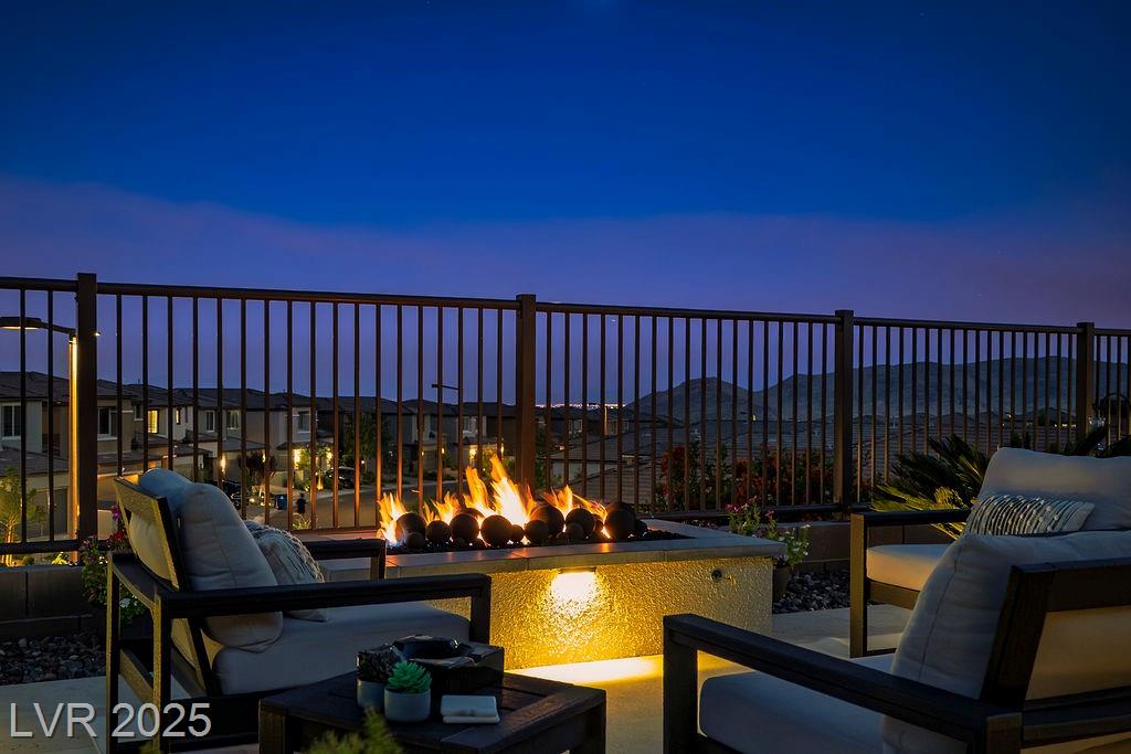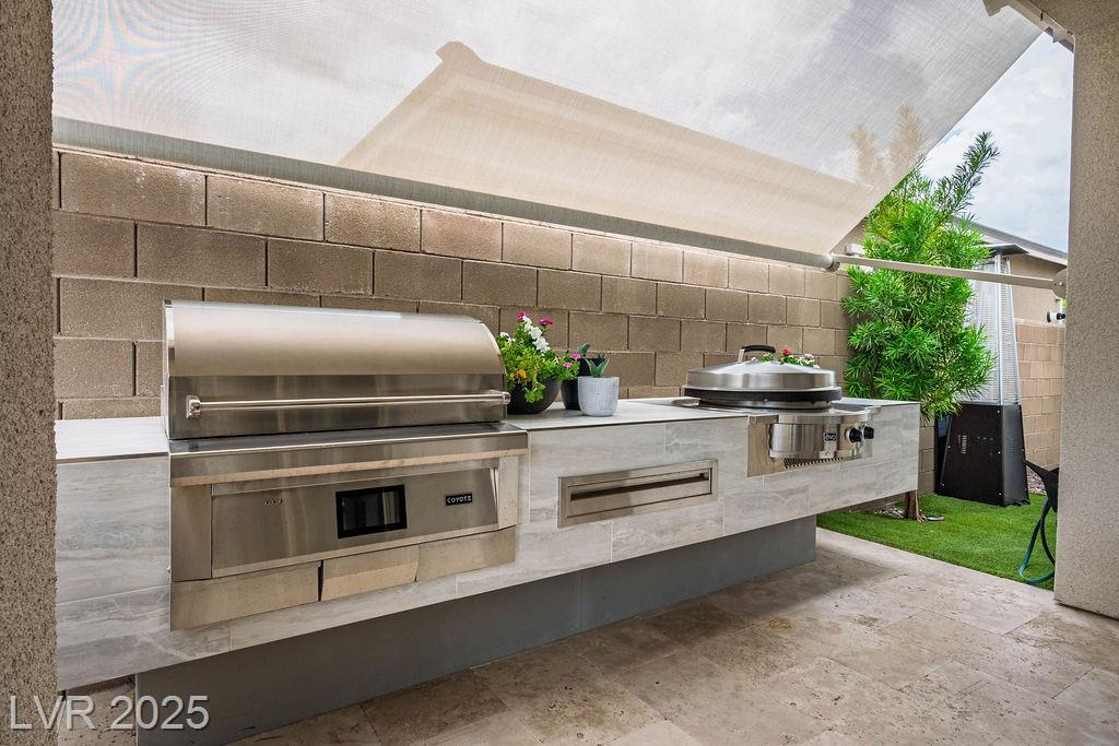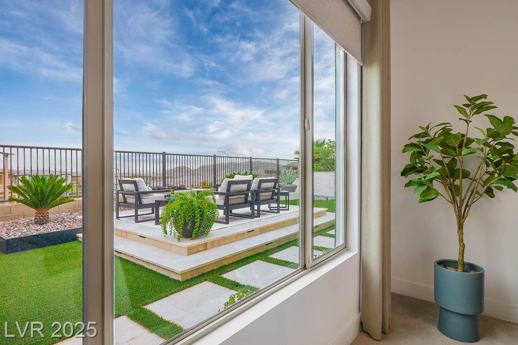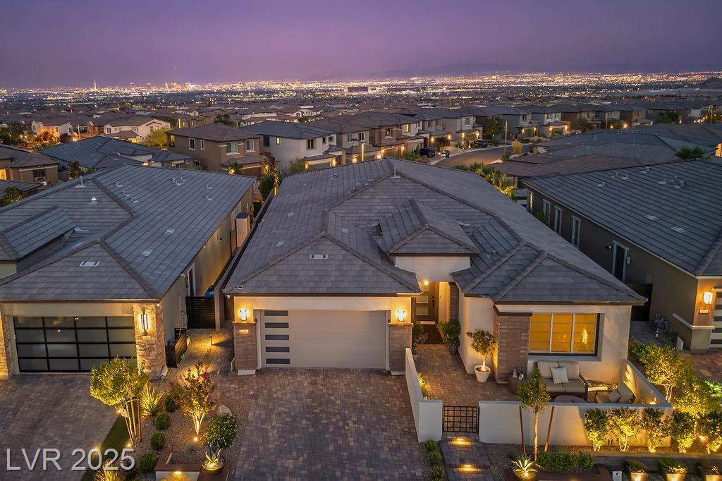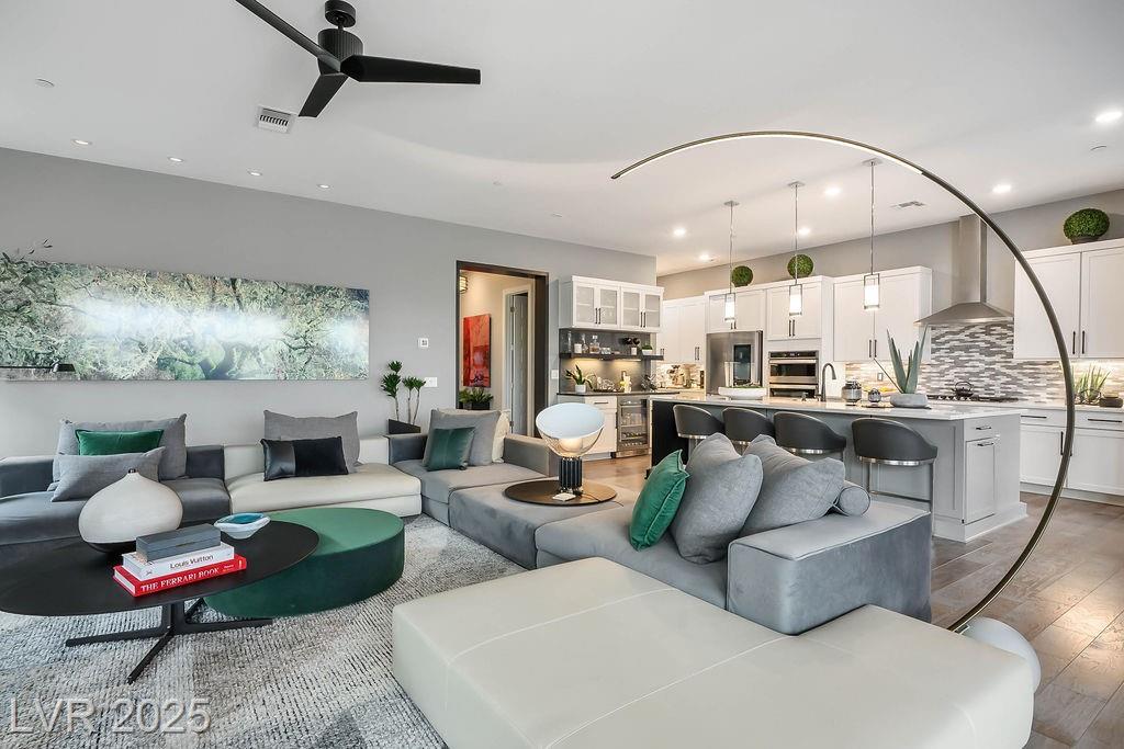 UNBELIEVABLE 3 bedroom, 3 bath single-story home with den and 3-car garage in a gated community, showcasing custom upgrades inside and out! This home has been elevated to the Xtreme with a resort-style backyard featuring a full outdoor kitchen with pellet grill, EVO skillet, electric awning, professional misting system, fire pit, and waterfall. Enjoy breathtaking sunsets with sweeping mountain and Strip views. Home includes hardwood floors, wood-accented archways, a dramatic 101” linear fireplace, and custom cabinetry/closets throughout. The kitchen includes an extended pantry, roll-out drawers, built-in island storage, under-cabinet lighting, a custom bistro bar with beverage fridge, and a wine cooler. Perfect for enjoying your morning cappuccino at home! The luxurious primary suite boasts an oversized low-threshold glass shower and a California Closets build-out. With too many upgrades to list, this stunning home is truly one-of-a-kind and waiting for you to call it home!