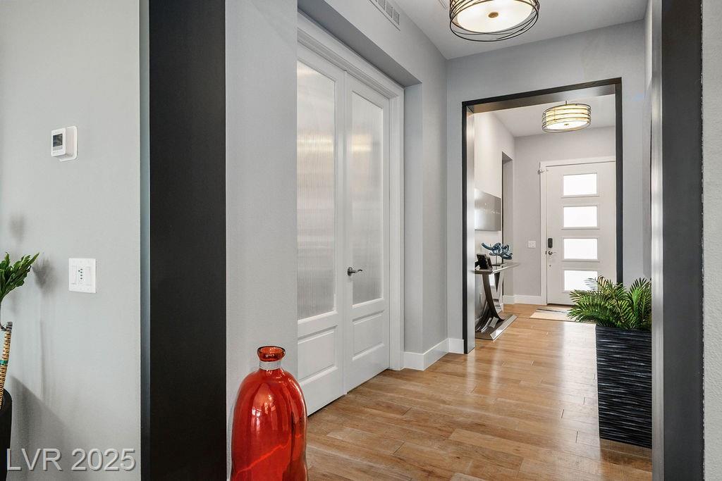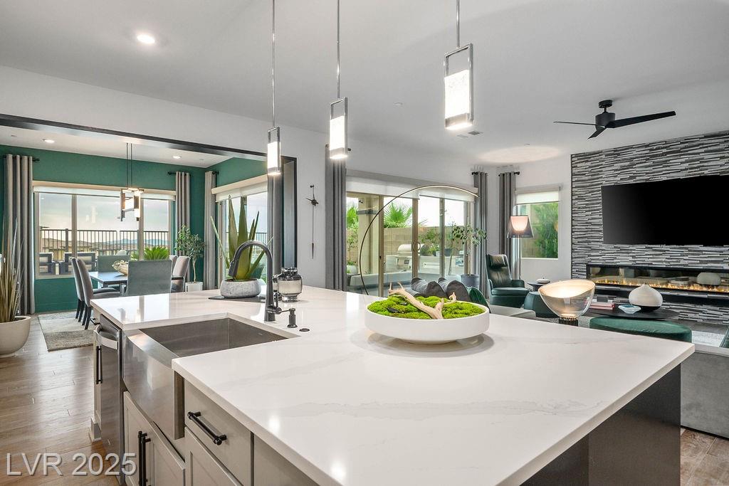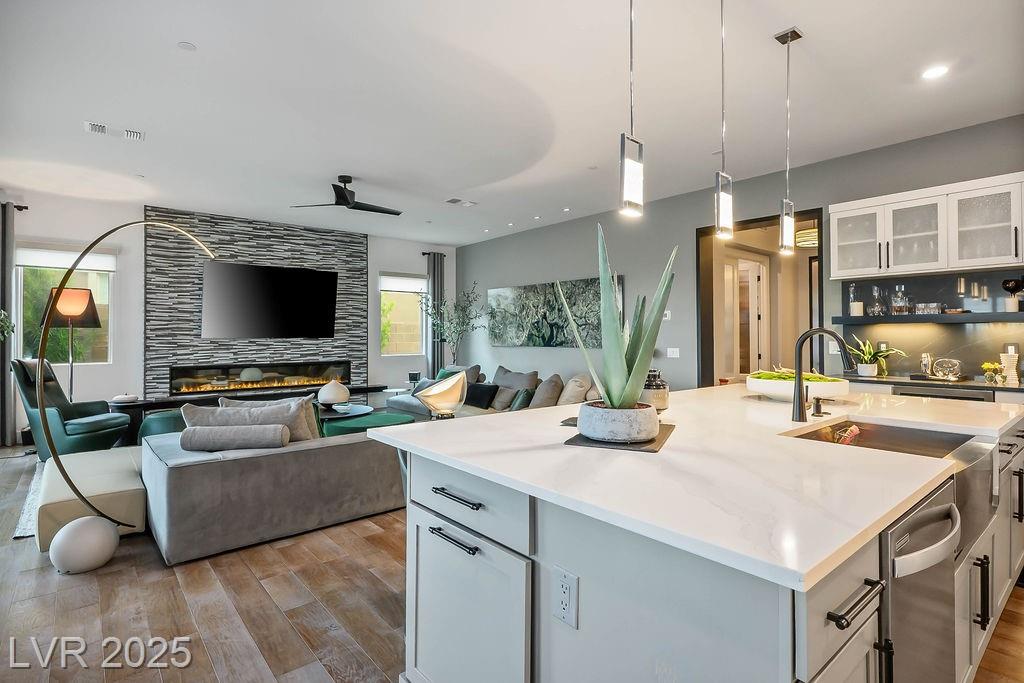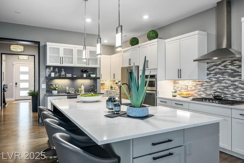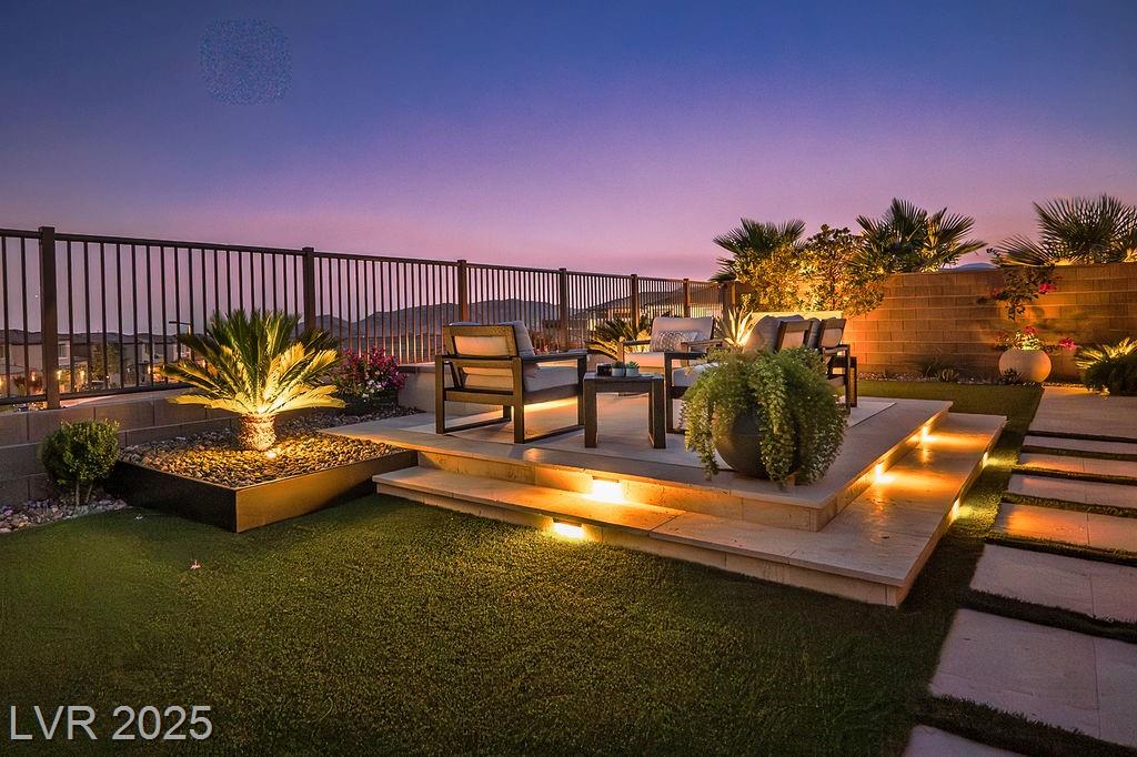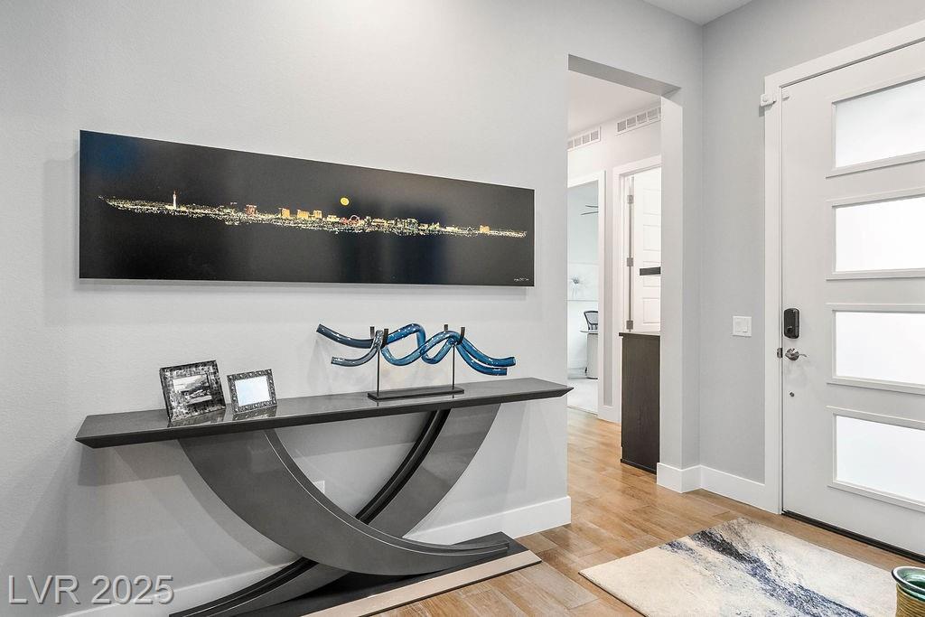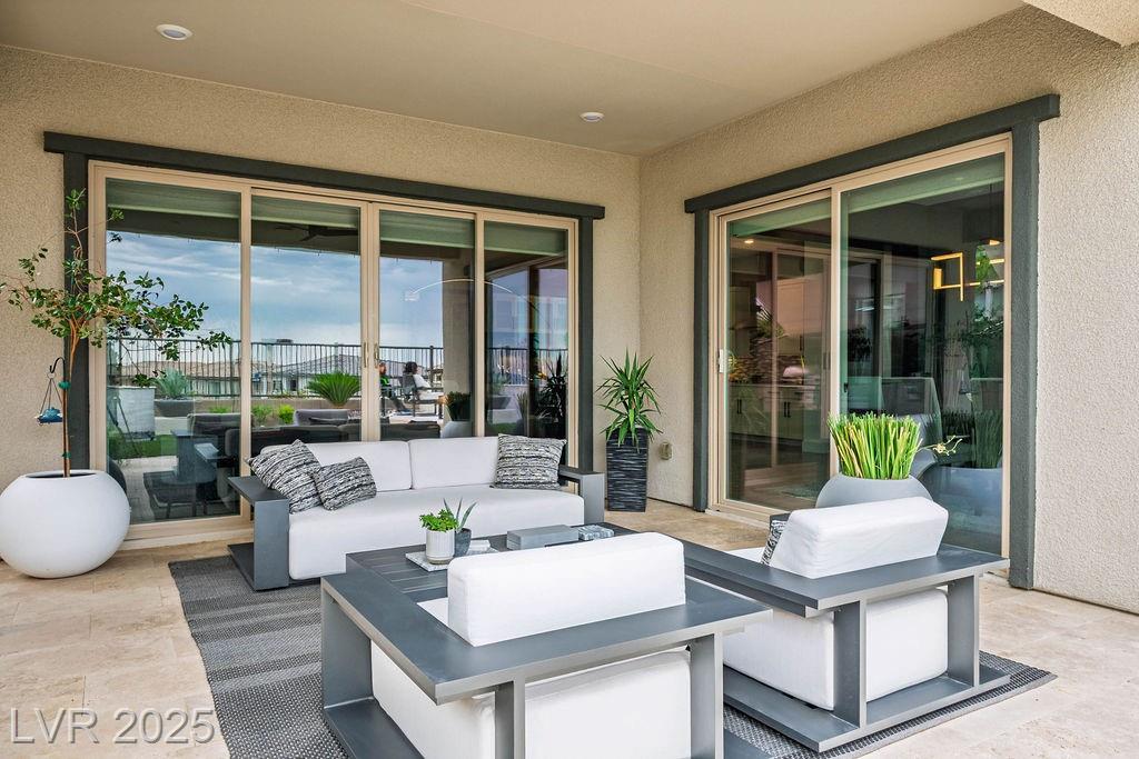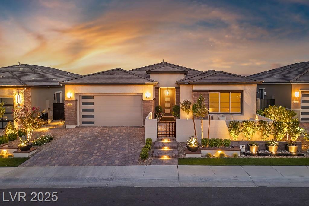 UNBELIEVABLE 3 bedroom, 3 bath single-story home with den and 3-car garage in a gated community, showcasing custom upgrades inside and out! This home has been elevated to the Xtreme with a resort-style backyard featuring a full outdoor kitchen with pellet grill, EVO skillet, electric awning, professional misting system, fire pit, and waterfall. Enjoy breathtaking sunsets with sweeping mountain and Strip views. Home includes hardwood floors, wood-accented archways, a dramatic 101” linear fireplace, and custom cabinetry/closets throughout. The kitchen includes an extended pantry, roll-out drawers, built-in island storage, under-cabinet lighting, a custom bistro bar with beverage fridge, and a wine cooler. Perfect for enjoying your morning cappuccino at home! The luxurious primary suite boasts an oversized low-threshold glass shower and a California Closets build-out. With too many upgrades to list, this stunning home is truly one-of-a-kind and waiting for you to call it home!