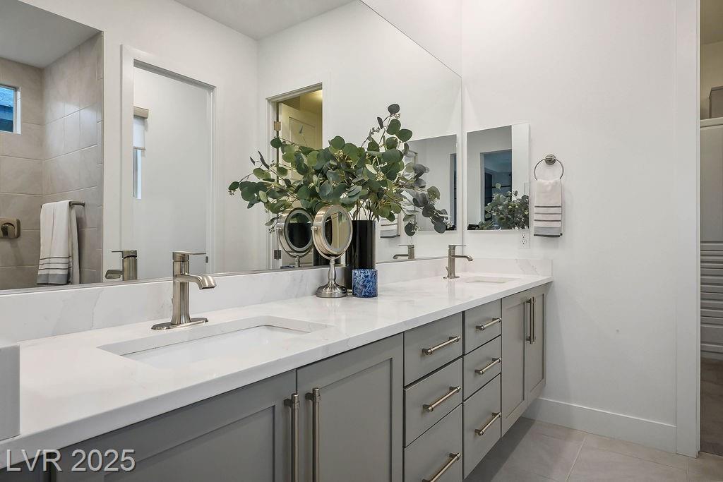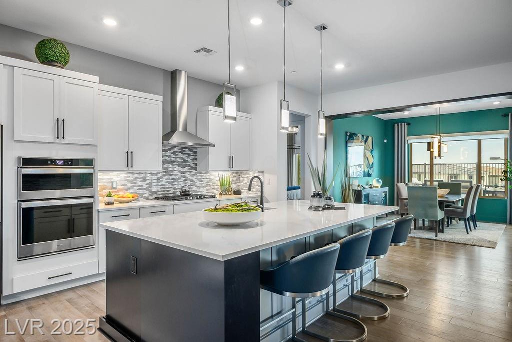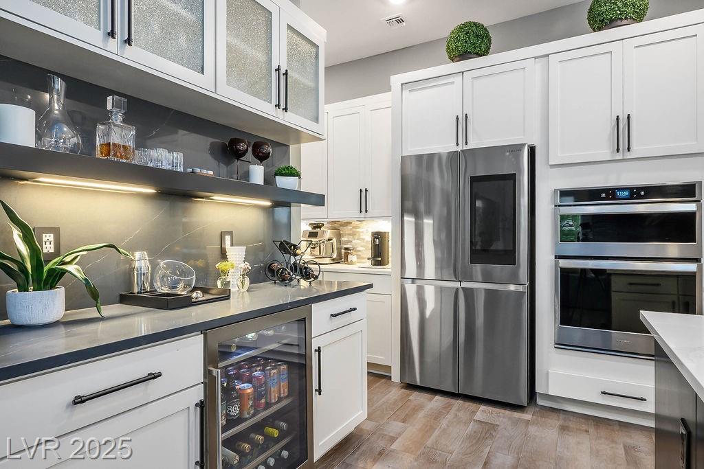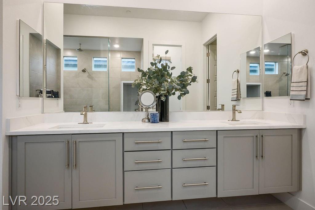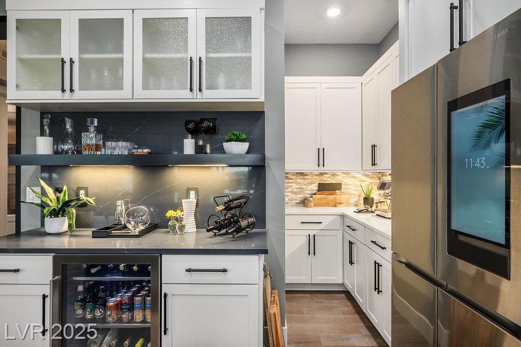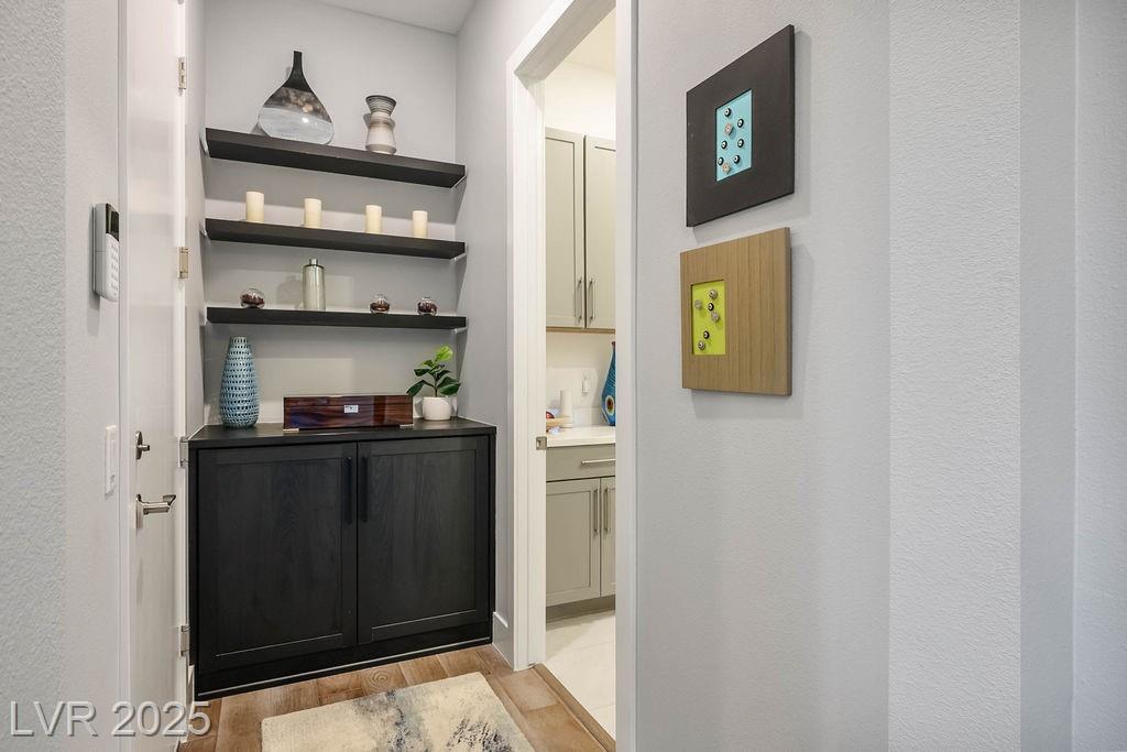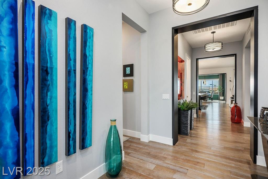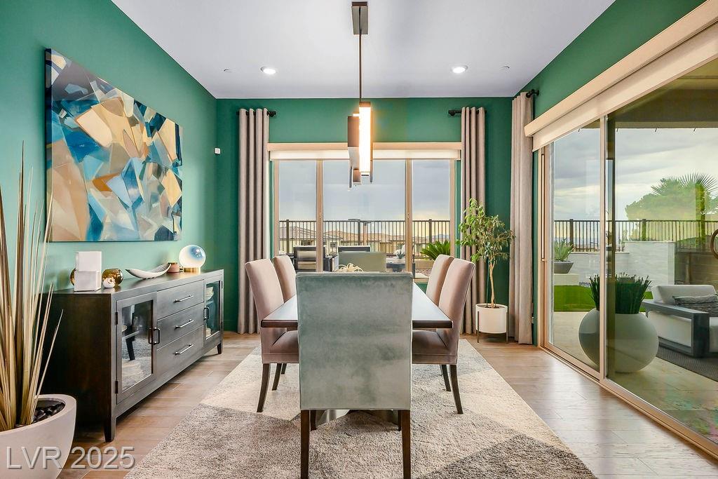 UNBELIEVABLE 3 bedroom, 3 bath single-story home with den and 3-car garage in a gated community, showcasing custom upgrades inside and out! This home has been elevated to the Xtreme with a resort-style backyard featuring a full outdoor kitchen with pellet grill, EVO skillet, electric awning, professional misting system, fire pit, and waterfall. Enjoy breathtaking sunsets with sweeping mountain and Strip views. Home includes hardwood floors, wood-accented archways, a dramatic 101” linear fireplace, and custom cabinetry/closets throughout. The kitchen includes an extended pantry, roll-out drawers, built-in island storage, under-cabinet lighting, a custom bistro bar with beverage fridge, and a wine cooler. Perfect for enjoying your morning cappuccino at home! The luxurious primary suite boasts an oversized low-threshold glass shower and a California Closets build-out. With too many upgrades to list, this stunning home is truly one-of-a-kind and waiting for you to call it home!