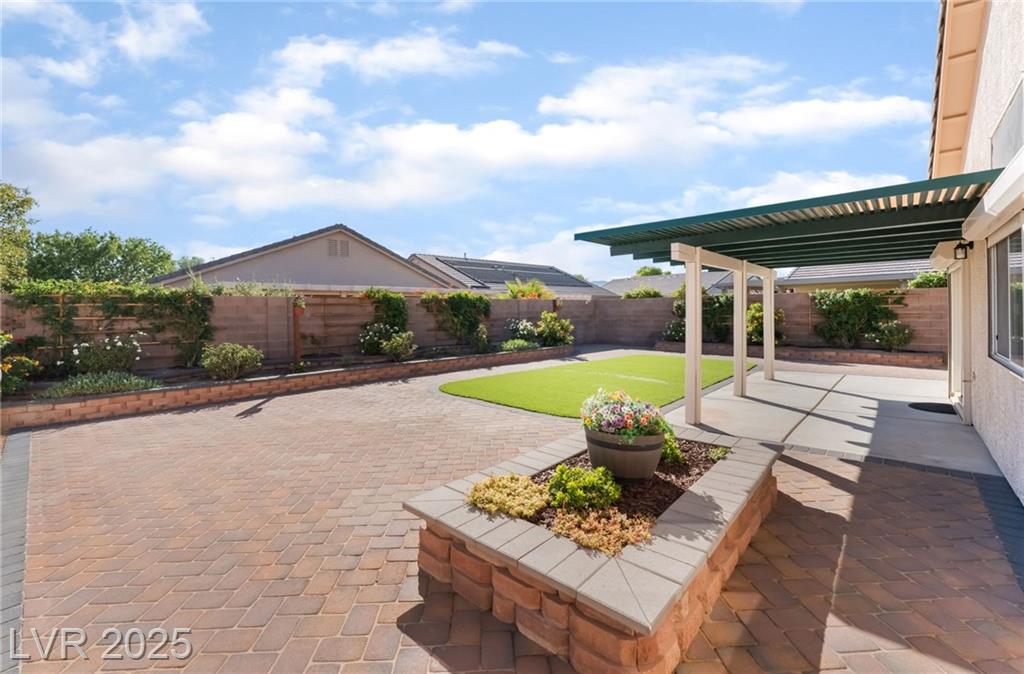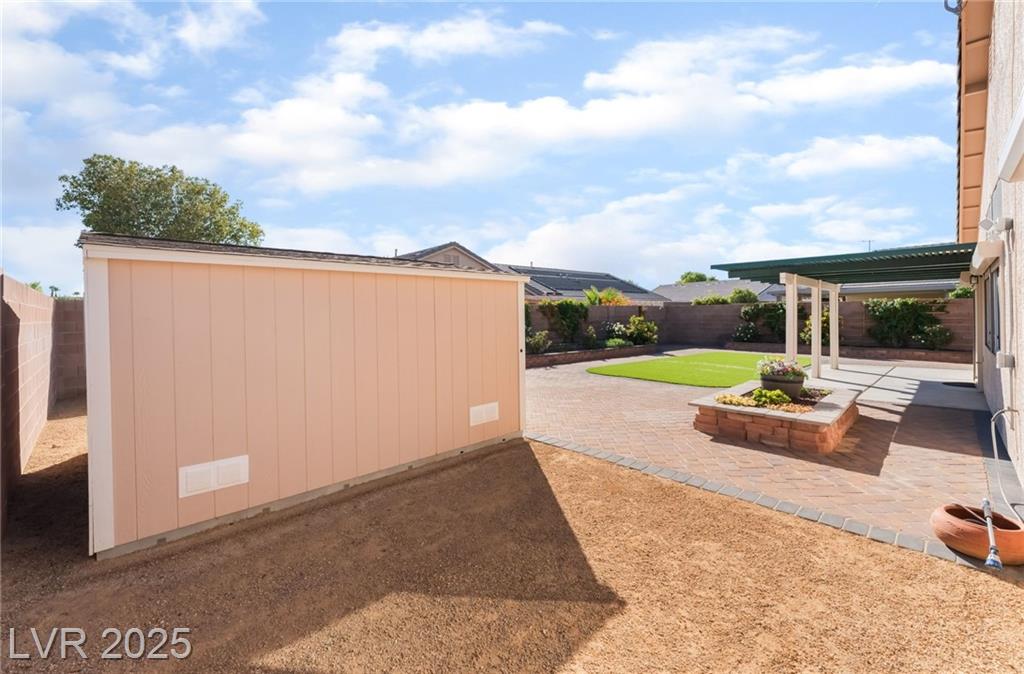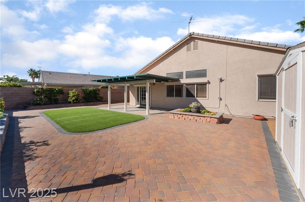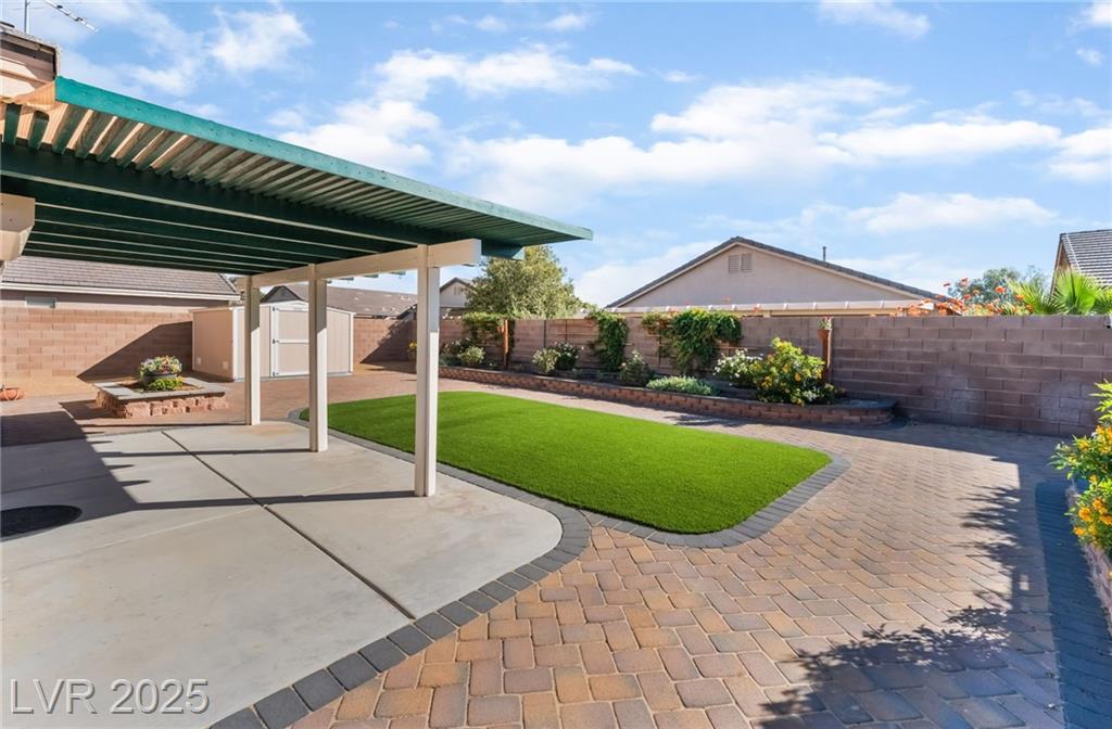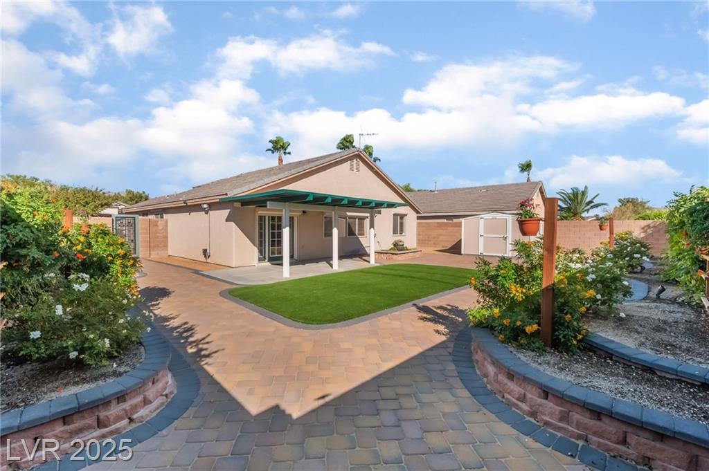 Adorable single-story home tucked inside the gated community of Lynbrook! This 3-bedroom, 2-bath beauty boasts an inviting open floor plan designed for both everyday comfort and effortless entertaining. Inside, you’ll find a stylish mix of wood and ceramic flooring, all appliances included, plus a brand-new stainless steel refrigerator, and ceiling fans in every room for year-round comfort. The spacious primary suite is thoughtfully separated from the secondary bedrooms and features dual sinks, a relaxing soaking tub, separate shower, and walk-in closet. Curb appeal shines with lush green grass in the front yard, while the backyard offers easy-maintenance synthetic grass, pavers, raised flowerbeds, and a covered patio perfect for relaxing or entertaining. A storage shed adds convenience, and security shutters provide both energy efficiency and peace of mind.