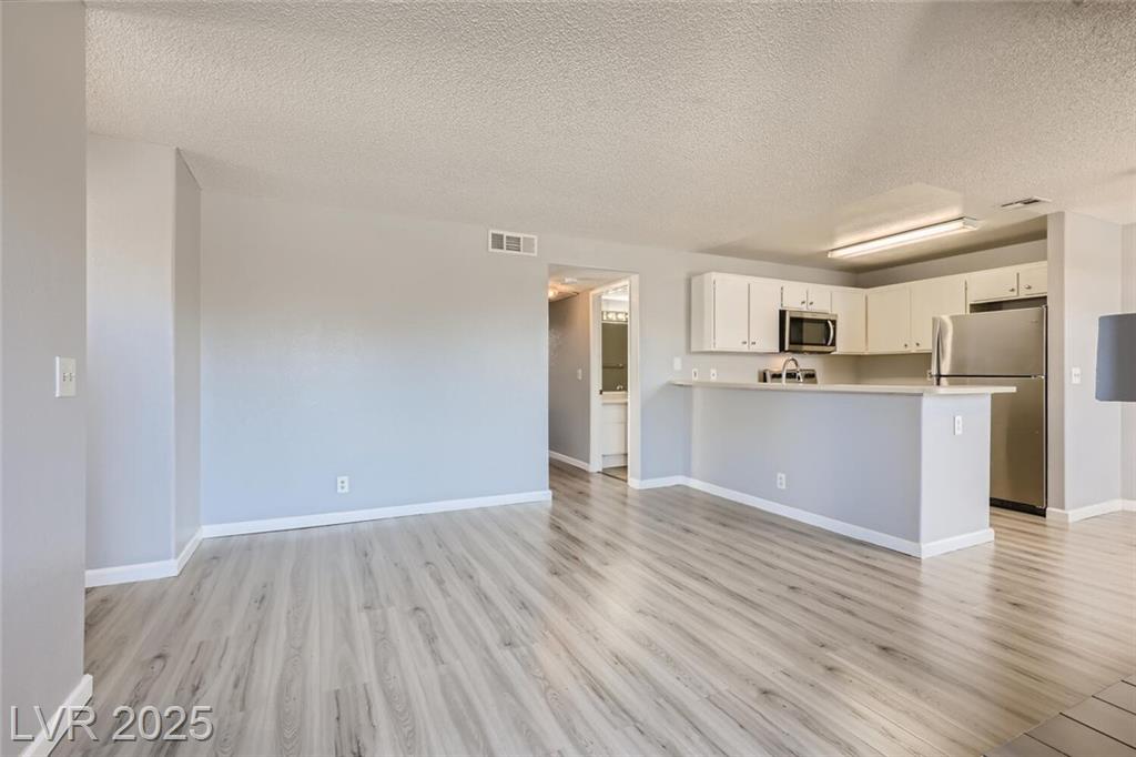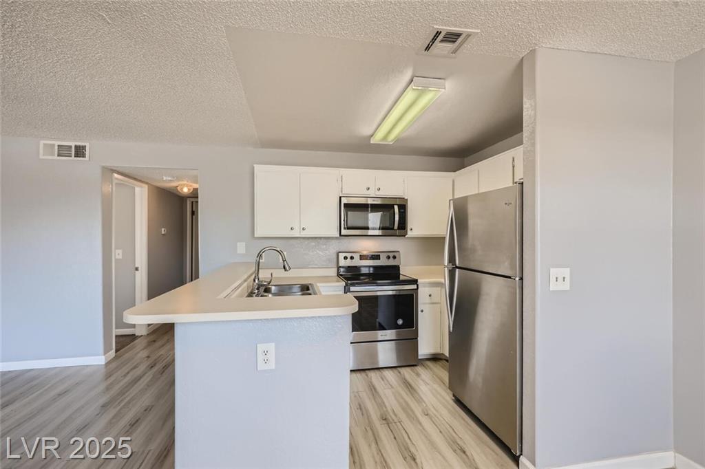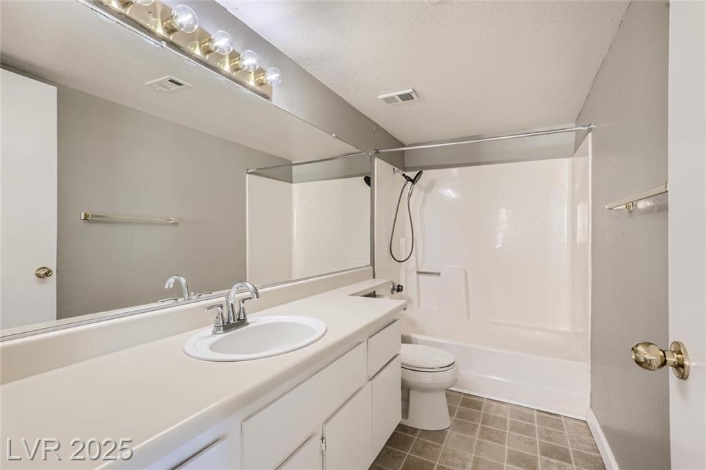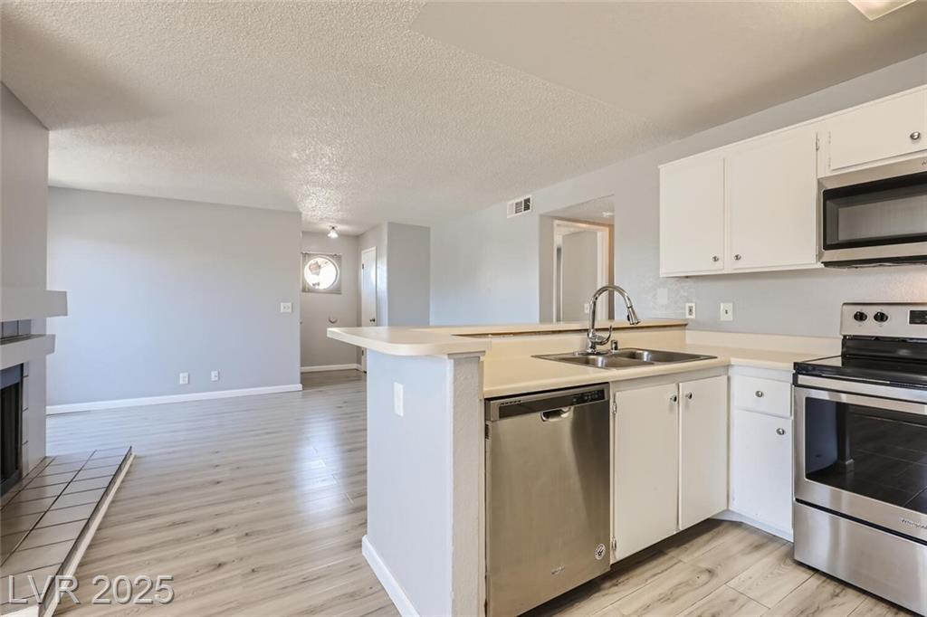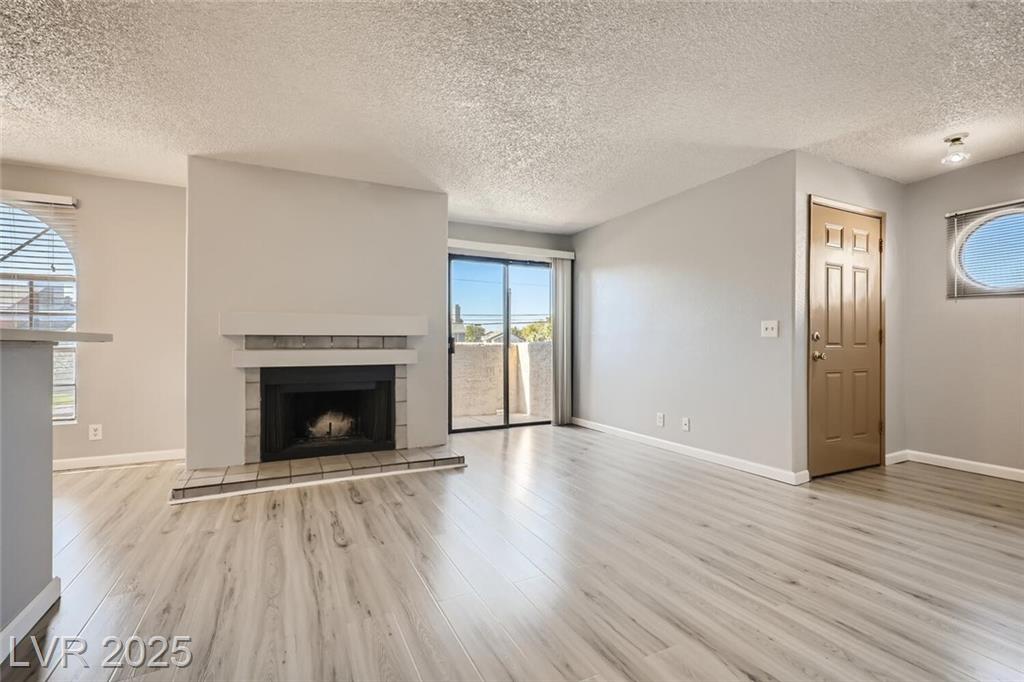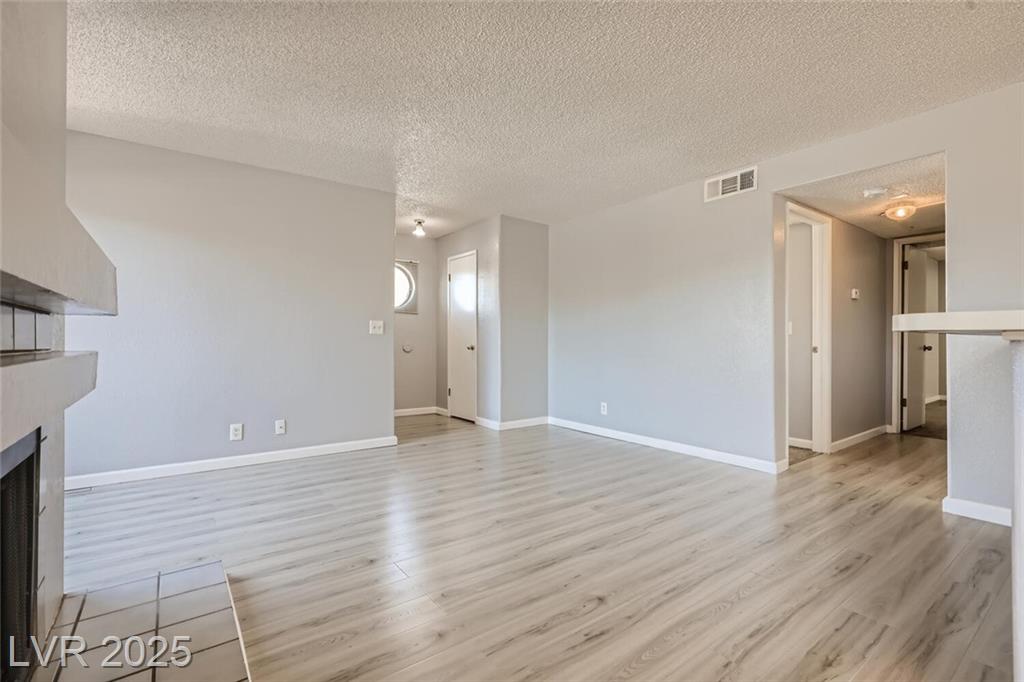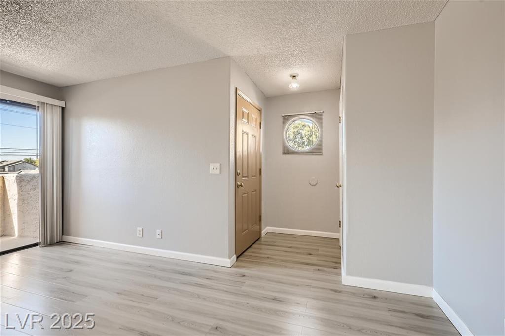 Charming 2nd-story condo in Las Vegas, NV. Situated in a gated community on the east side of the valley, residents enjoy access to a pool, spa, and convenient proximity to shopping, schools, and major highways. This 889 sq. ft. unit features an open floor plan with wood laminate flooring in the main living area, a cozy gas fireplace, ceiling fan with light, and window and door blinds throughout. The kitchen includes a breakfast bar, laminate countertops, and all brand-new appliances. The primary bedroom offers carpet flooring, mirrored closet doors, and a full en-suite bathroom with vinyl flooring and a tub/shower combo. The second bedroom is also carpeted with window blinds and is adjacent to a second full bathroom with similar finishes.