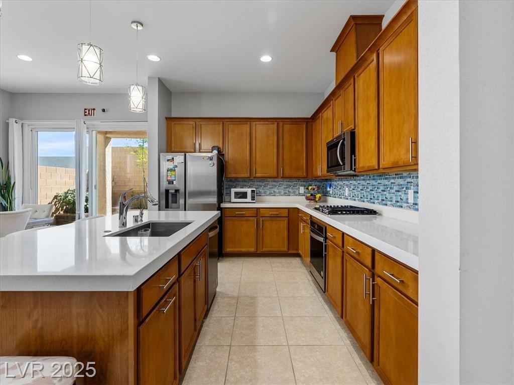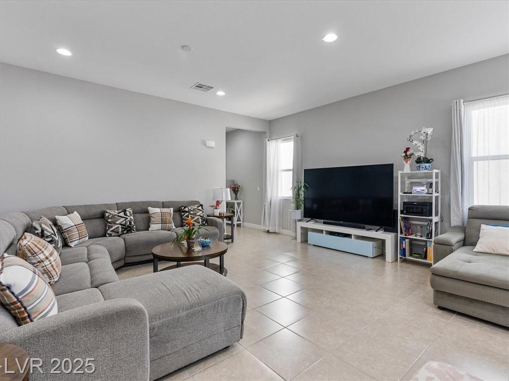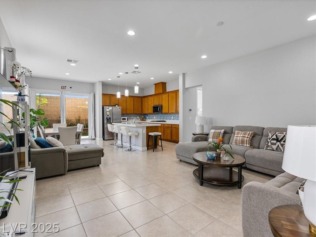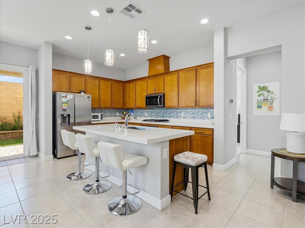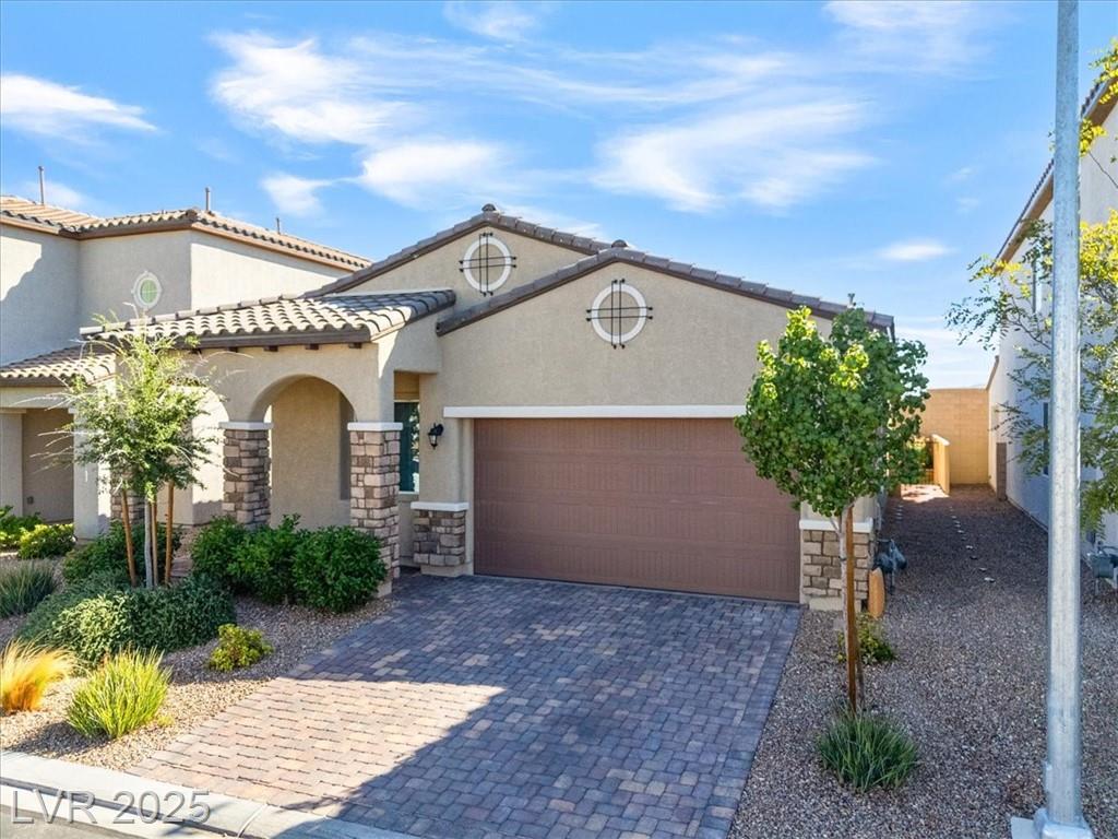 Beautifully maintained home in Southwest, Las Vegas next to Rhodes Ranch! Features include 10ft ceilings, quartz countertops with island, gas cooktop, plenty of cabinets, tile & LVP flooring, and a covered patio. Enjoy energy savings with leased solar. Prime location near Durango Casino, UnCommons, freeway 215, shopping, dining & more—a perfect blend of comfort and convenience!