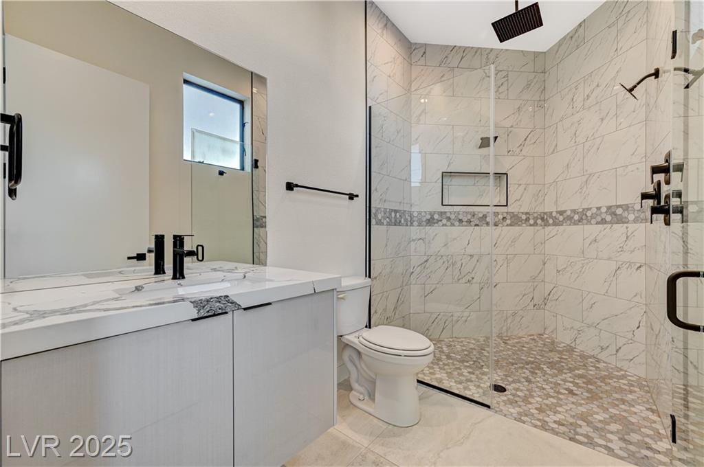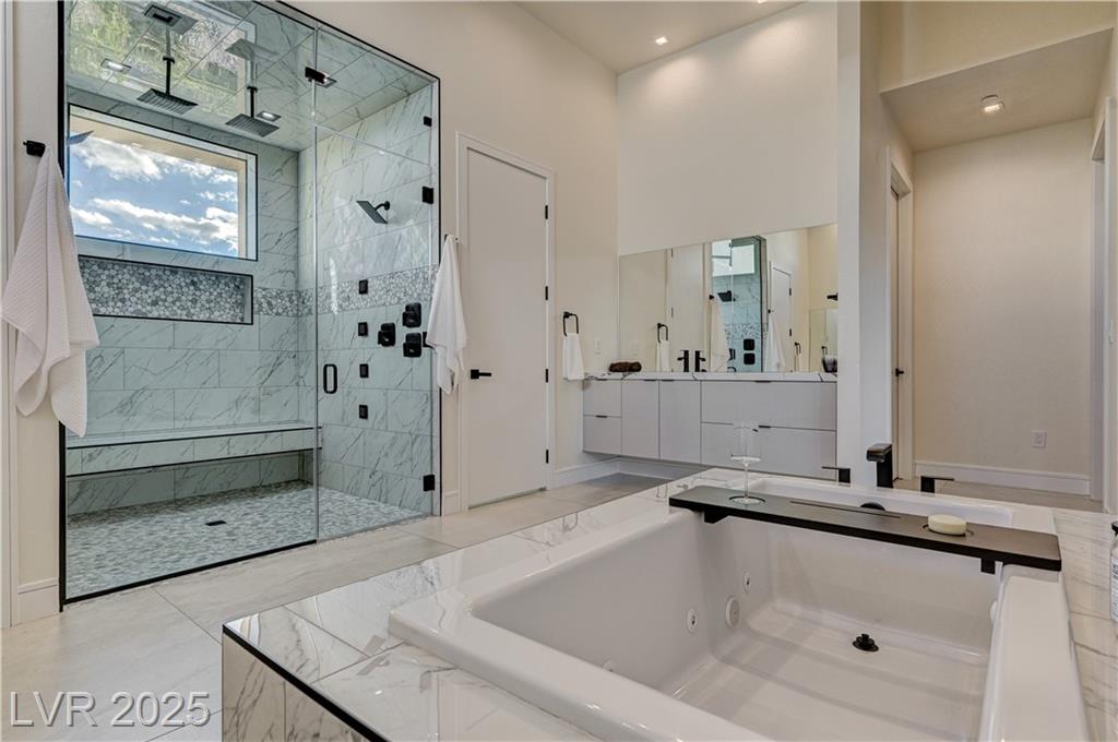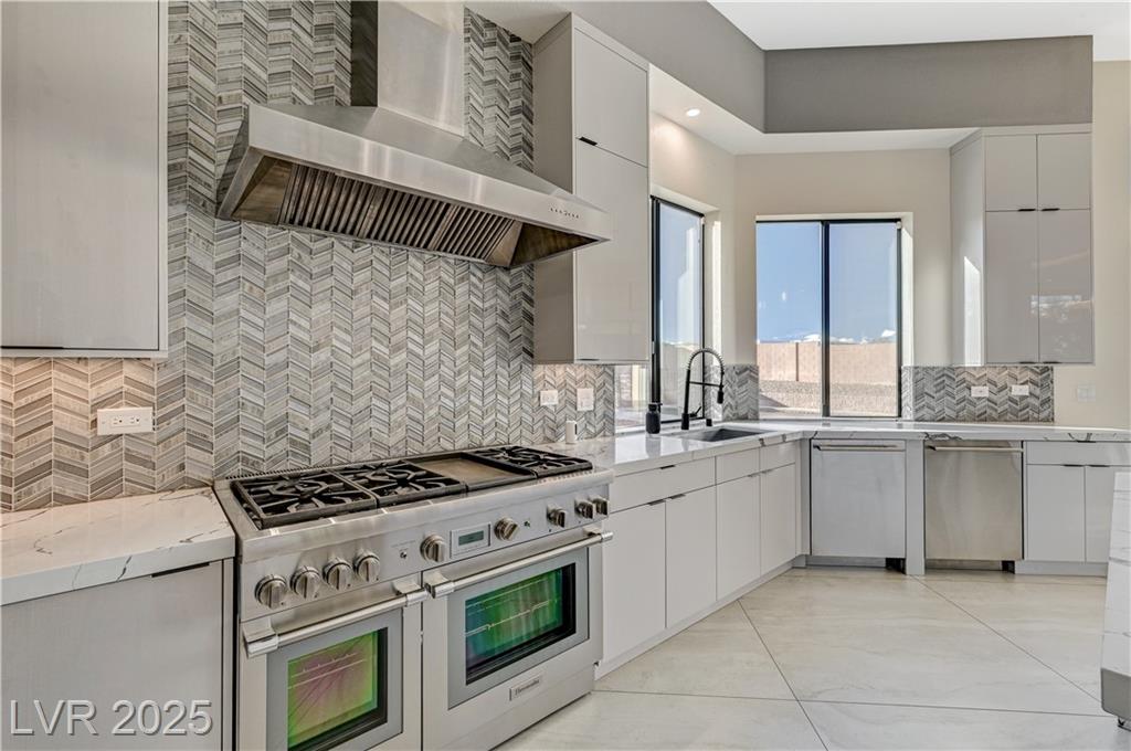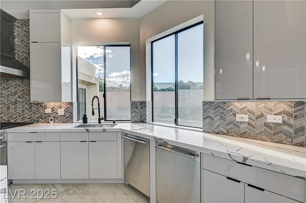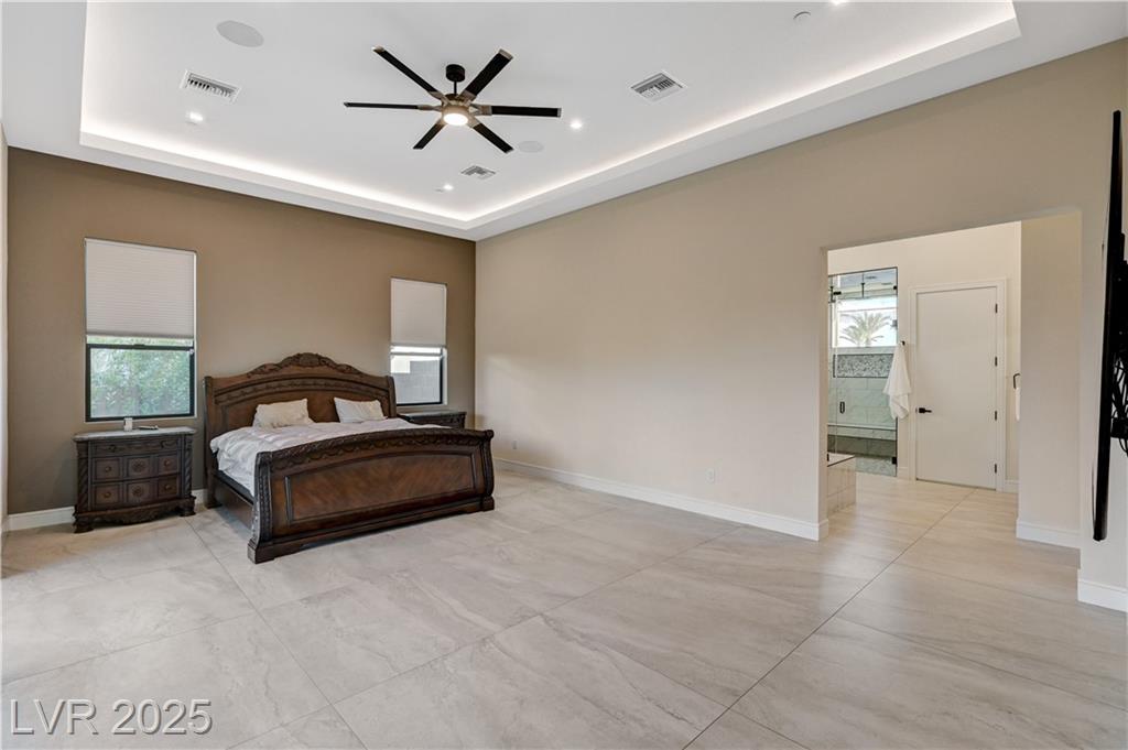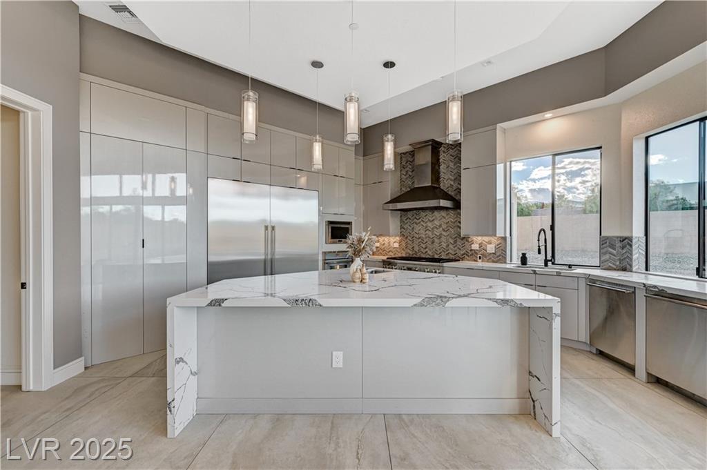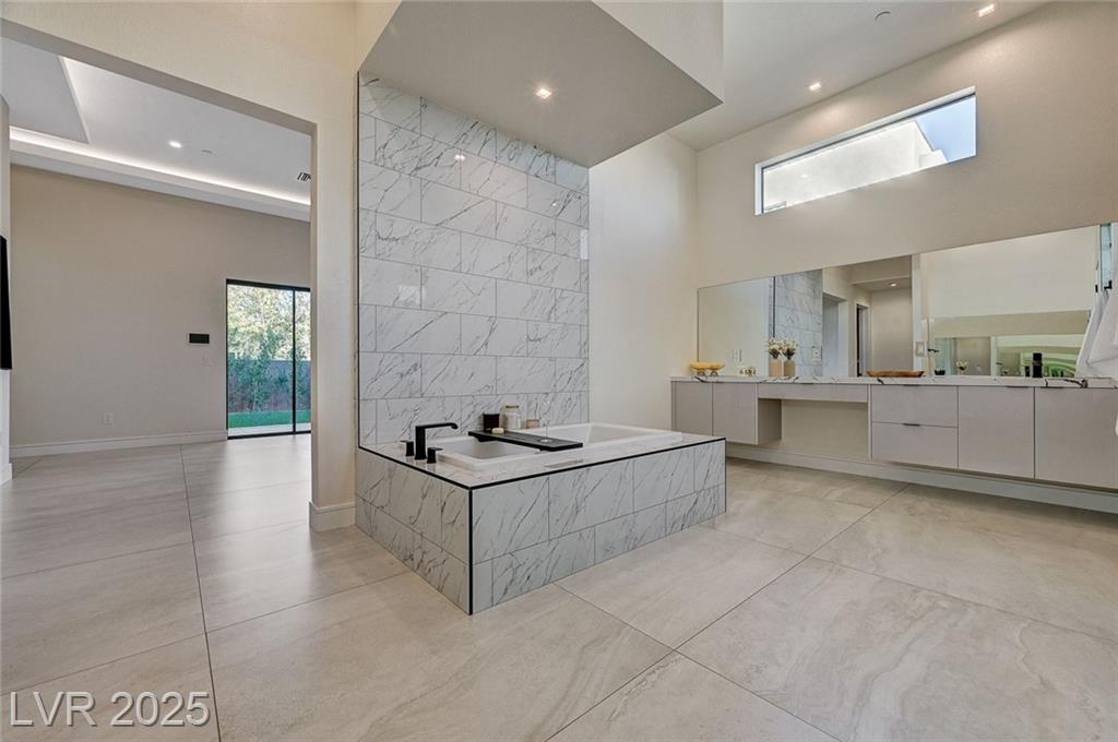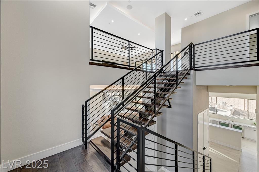 Behind private gates in Centennial Hills, this ultra-modern estate showcases Rose Builders’ coveted Rembrandt floorplan—one of only four in an exclusive gated enclave. Spanning almost 7,000 sq. ft. of sleek modrn living, this home features soaring ceilings, imported tile floors, and dramatic floor-to-ceiling windows throughout. The gourmet kitchen stuns with Thermador appliances, custom cabinetry, and a striking waterfall island. Additional highlights include a 100-bottle wine room, formal living room with linear fireplace, and a loft-style media room. The residence offers 7 ensuite bedrooms and 8 bathrooms, including a luxurious detached casita with washer and dryer and large walk in closet. The first level primary suite is a tranquil retreat with spa-inspired bath and jetted tub. Outside, the private yard frames a resort-style pool perfect for entertaining beneath the stars. Contemporary luxury, minutes from Downtown Summerlin, world class shopping, entertainment and fine dining.