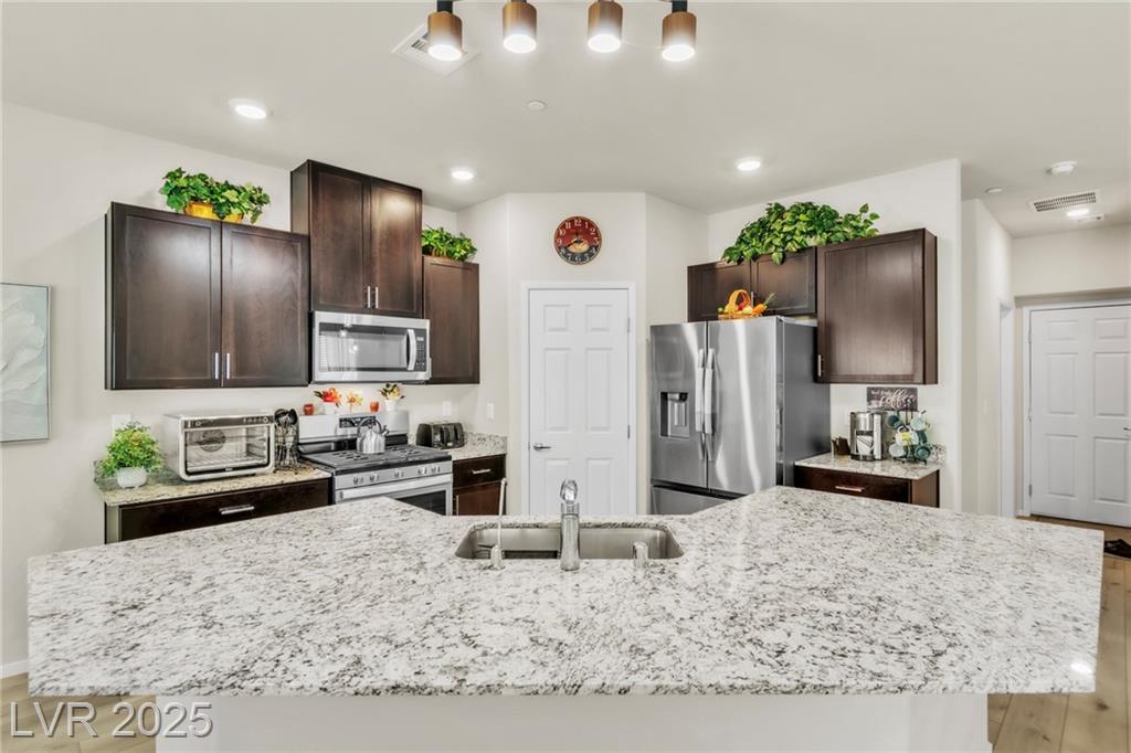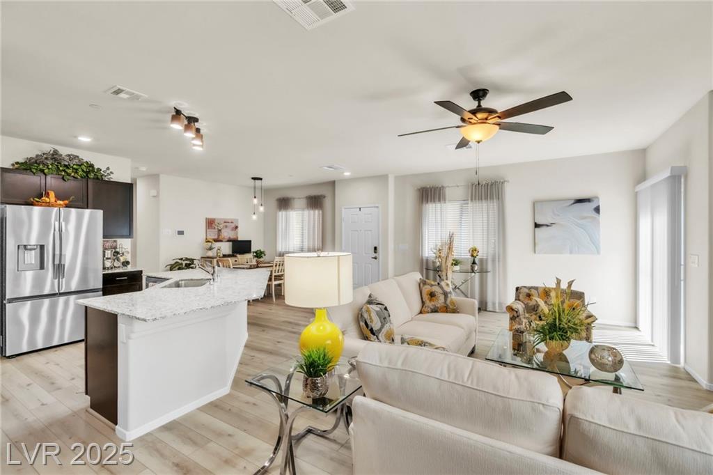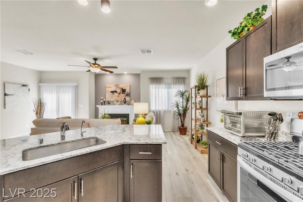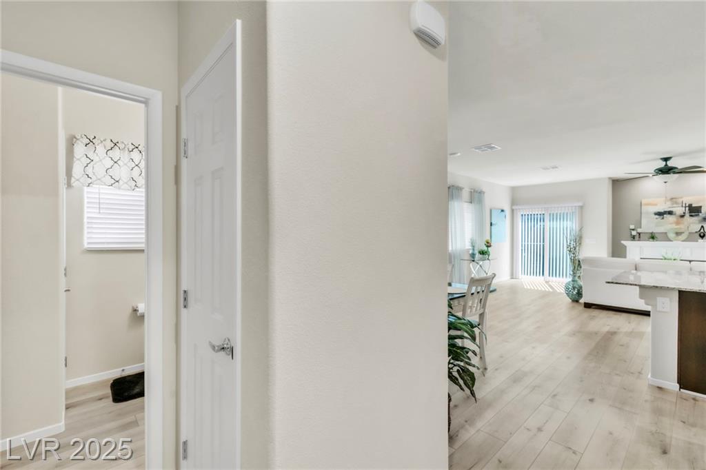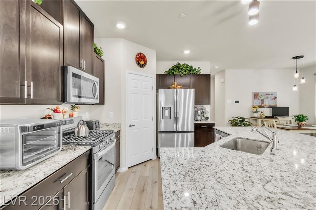 Stylish & turnkey Valley Vista townhome with $20K in upgraded flooring! This 3-bedroom, 2.5-bath, 2-car garage home offers a bright, inviting layout with a generous living area, flexible dining space, and a well-appointed kitchen featuring granite counters, upgraded cabinetry, stainless appliances, and an oversized prep island. Upstairs, all bedrooms are thoughtfully placed for privacy, including a comfortable primary suite. Outside, enjoy a low-maintenance backyard with pavers, turf, and a gazebo — perfect for weekend gatherings or quiet evenings. The gated neighborhood includes a pool, playground, dog park, and direct access to Galaxy Park with sports courts (including the rising trend of pickellball courts), picnic spots, and play areas. Conveniently close to shopping, dining, Aliante Casino, and quick 215 access.
