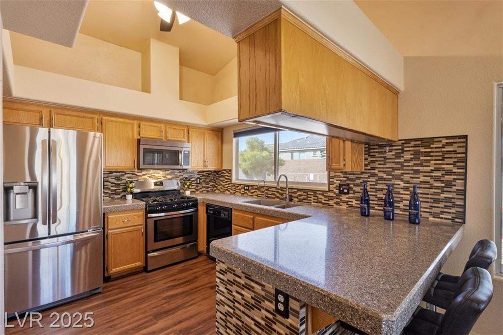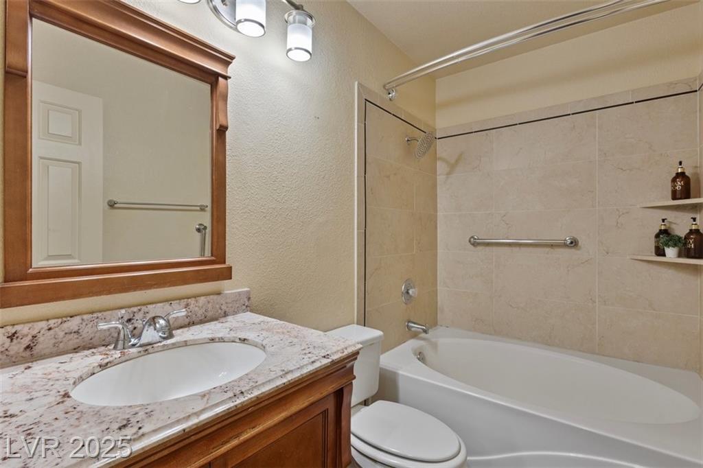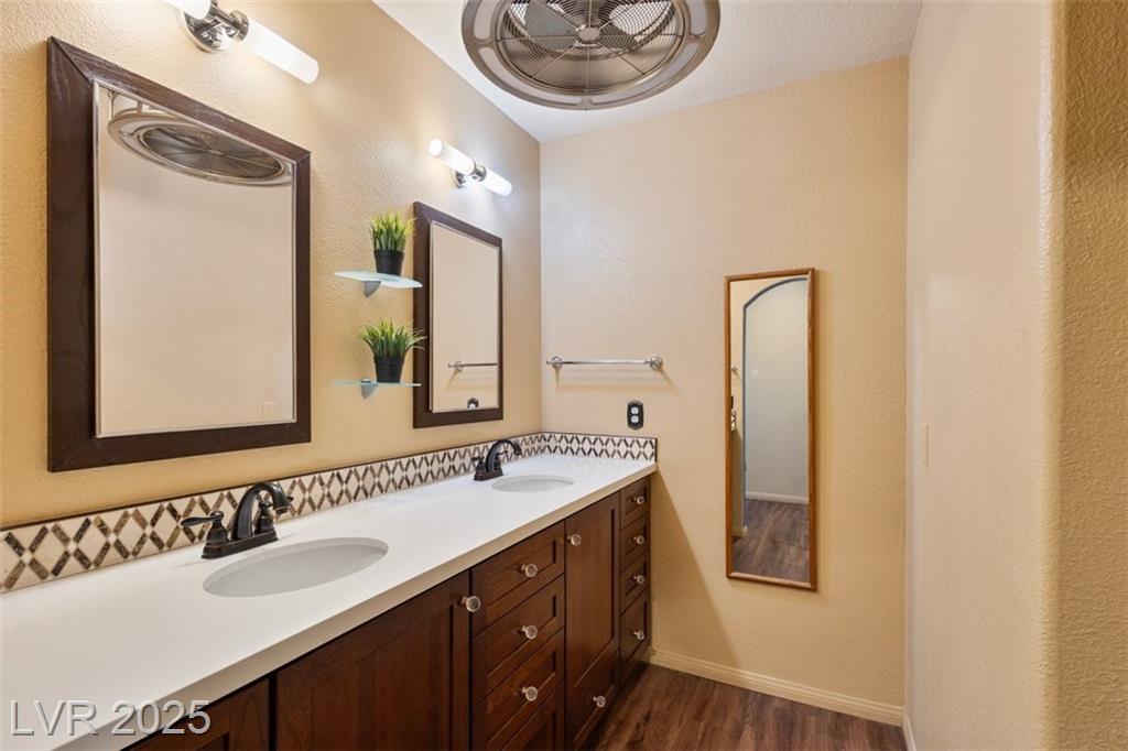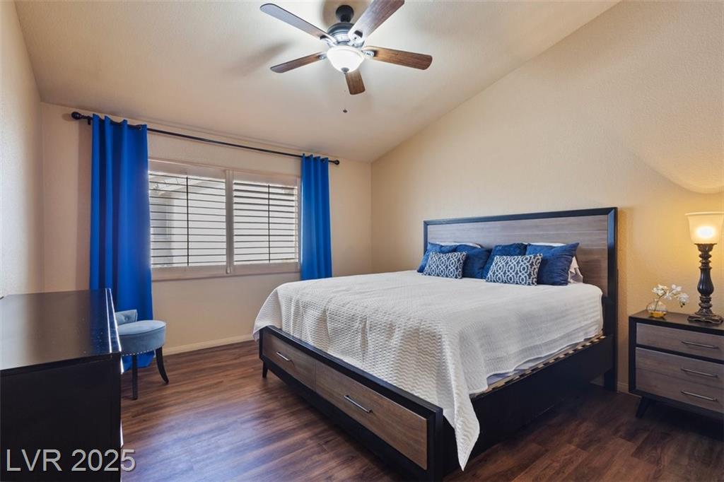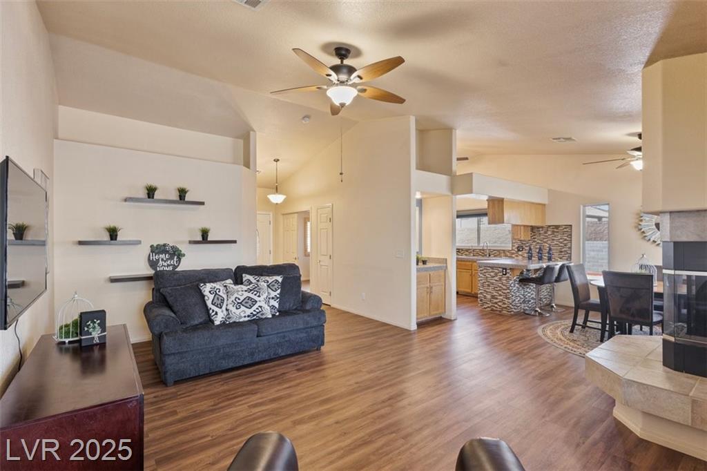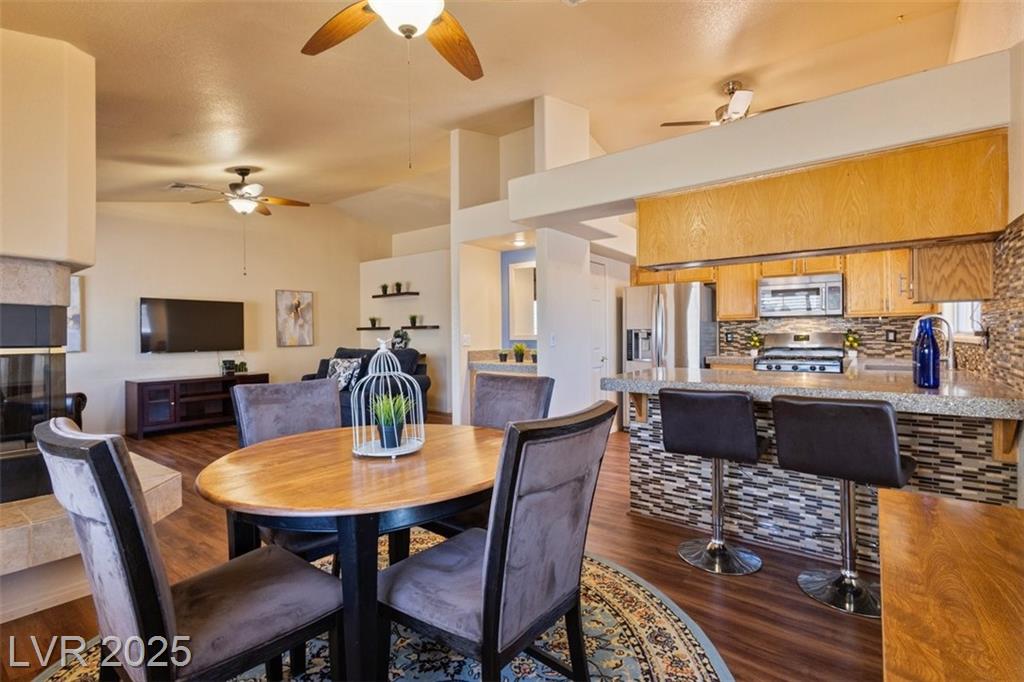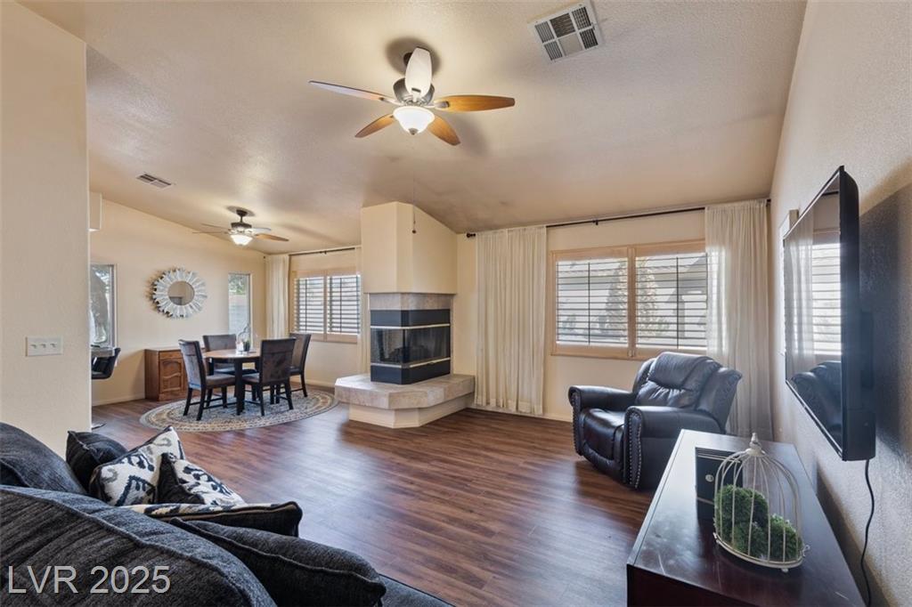 Charming single-story townhome featuring 3 bedrooms, 2 bathrooms, and a 2 car garage in a well-kept community w/ pool, spa, guest parking, and BBQ/picnic area. Bright, open floor plan showcases luxury vinyl plank flooring, ceiling fans, and upgraded light fixtures throughout. The kitchen offers granite countertops, stainless steel appliances, a pantry, and a custom backsplash. Enjoy the two-way gas fireplace and elegant wood plantation shutters. Both bathrooms have been fully remodeled with quartz and stone countertops, new vanities, updated fixtures, and custom tile surrounds. Step outside to a private tiled courtyard with doggy door access. Additional highlights include a water softener system, new water heater, and low-maintenance landscaping, fully furnished and turnkey ready! Conveniently located near Downtown, the Strip, airport, shopping, restaurants, parks, and freeways. Assumable VA loan at 5.3% available (with VA/lender approval). Move-in ready schedule your showing today!