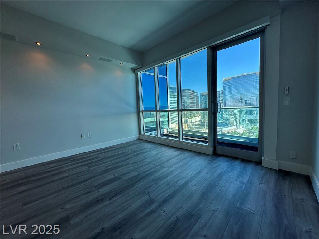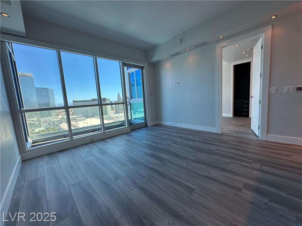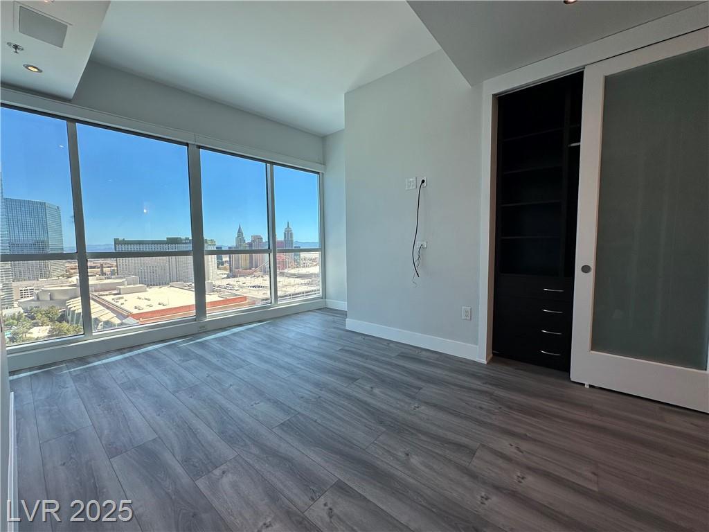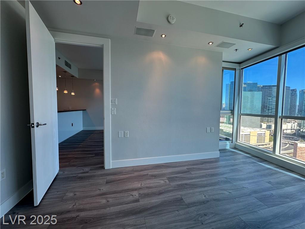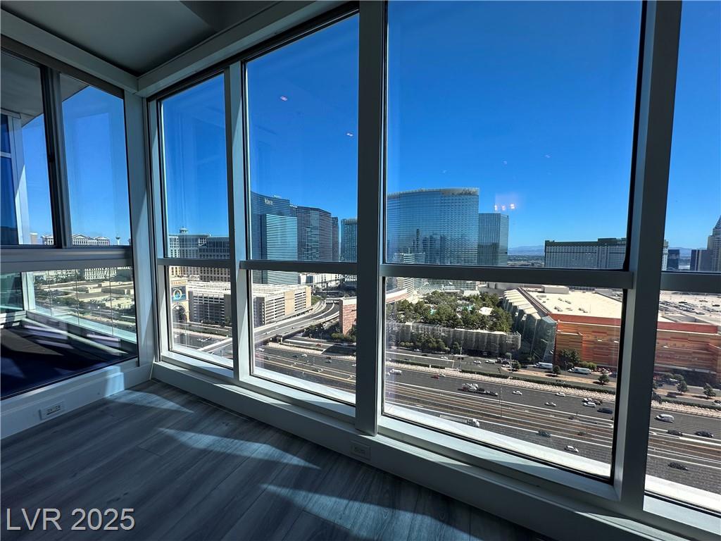 Beautifully renovated 1 master bedroom with a den, 1.5 baths. All hardwood floor and motorized window shades throughout. Free Cox cable TV and Internet. Kitchen features marble flooring, granite countertops, and stainless steel appliances. Fitness center with spa and steam room, valet, swimming pool house limousines service. All located within minutes of the Strip. Absolutely Stunning!