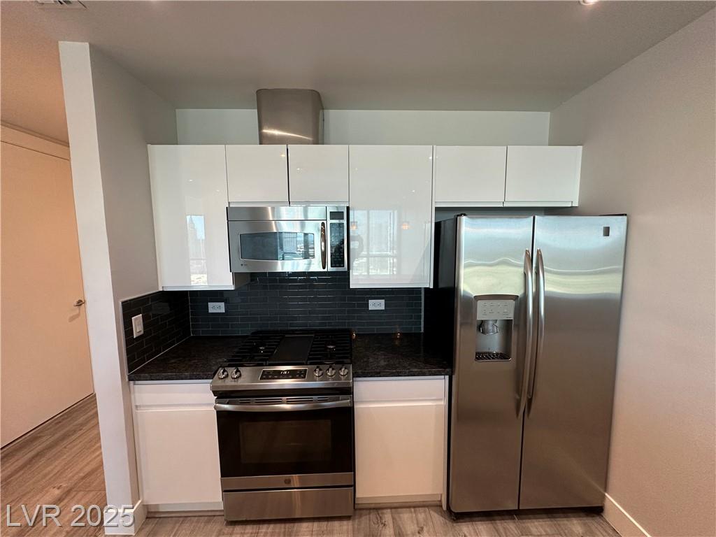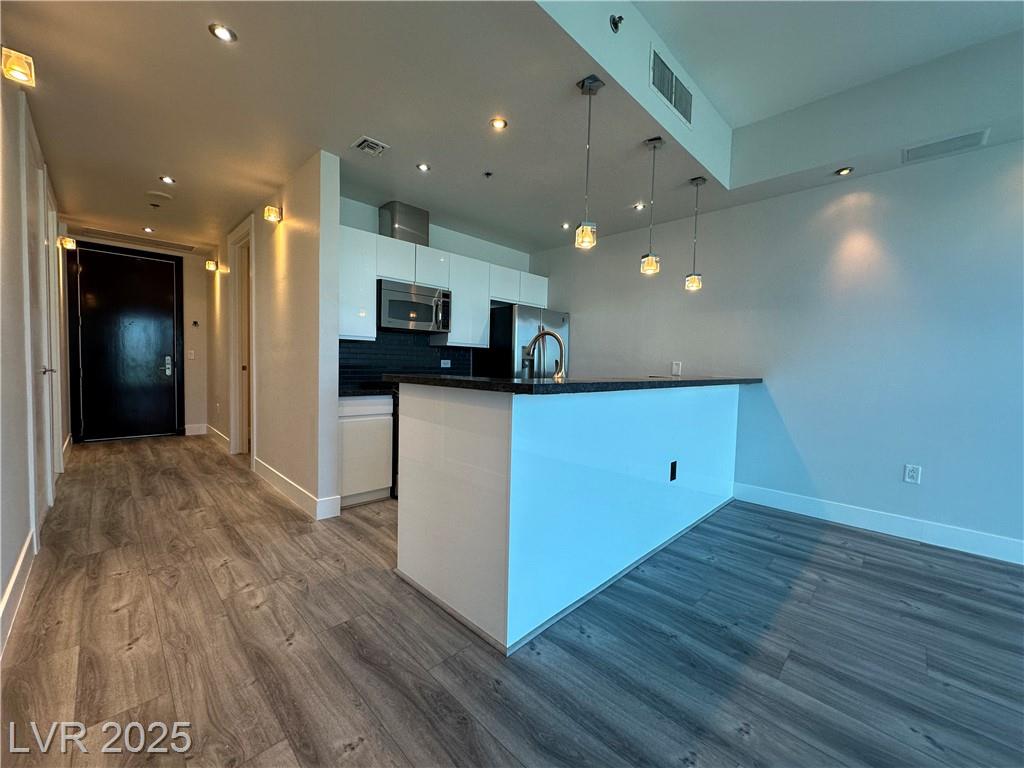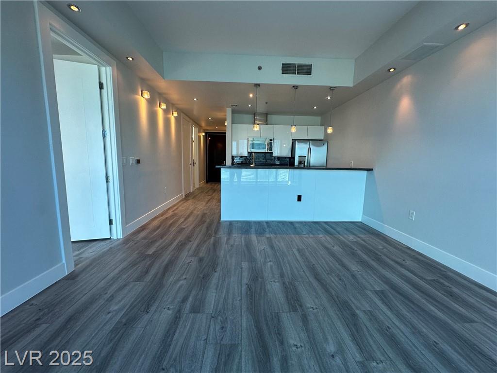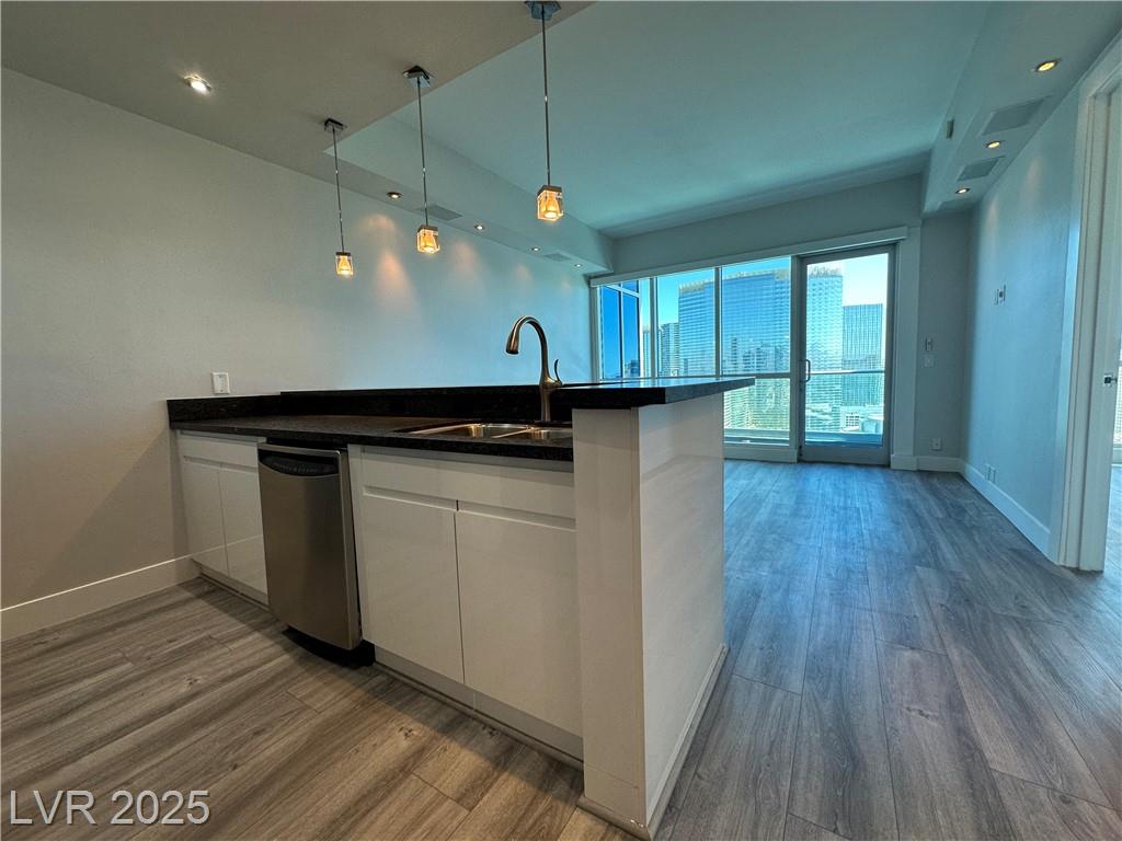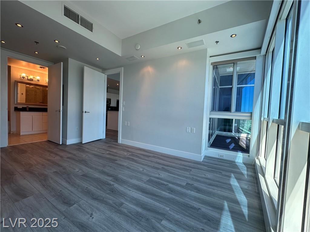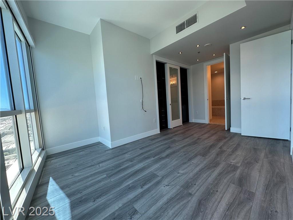 Beautifully renovated 1 master bedroom with a den, 1.5 baths. All hardwood floor and motorized window shades throughout. Free Cox cable TV and Internet. Kitchen features marble flooring, granite countertops, and stainless steel appliances. Fitness center with spa and steam room, valet, swimming pool house limousines service. All located within minutes of the Strip. Absolutely Stunning!