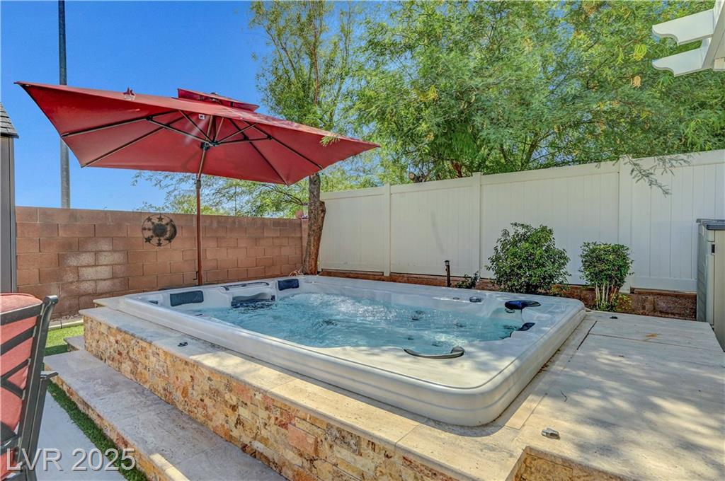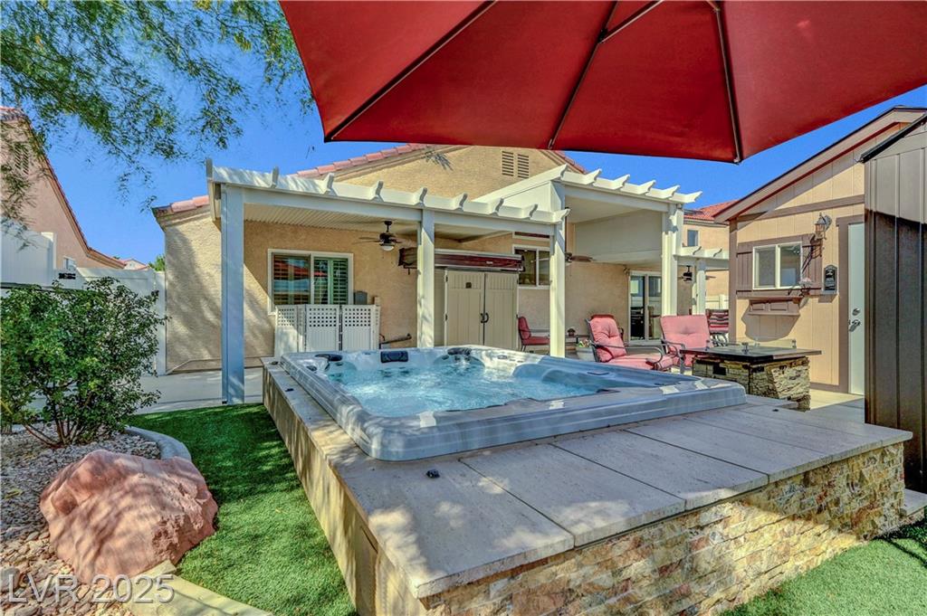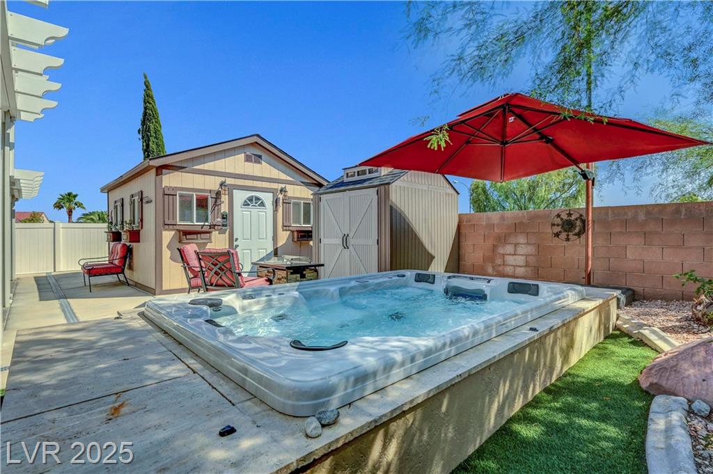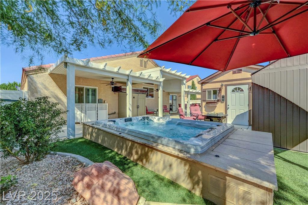 Gorgeous Single-Story Home in Gated Community! Beautifully maintained 4-bed, 2-bath home that's move-in ready & shows like a model. Both baths fully remodeled with modern finishes. Open-concept layout features vaulted ceilings & electric fireplace that adds warmth & style to the living area. Upgrades include: Custom dual-door iron entrance – elegant & secure. New windows & shutters throughout. New backyard sliding door. Modern paint, updated flooring & baseboards. New ceiling fans in all rooms. Mini-split in Bedroom 2. Stylish kitchen w/ SS appliances, high-end cabinetry & sleek island. Reverse osmosis & water softener included. Backyard boasts a large, well-maintained spa fitting 6–10 people—perfect for relaxing or entertaining. Additional features: all-new locks & knobs, new water heater w/ expansion tank, new garage opener motor. Detached workshop has its own power source, 50-amp plug & dedicated electrical panel. This home is virtually brand new—bring your buyer today!