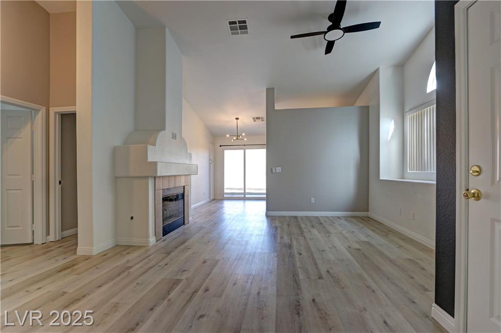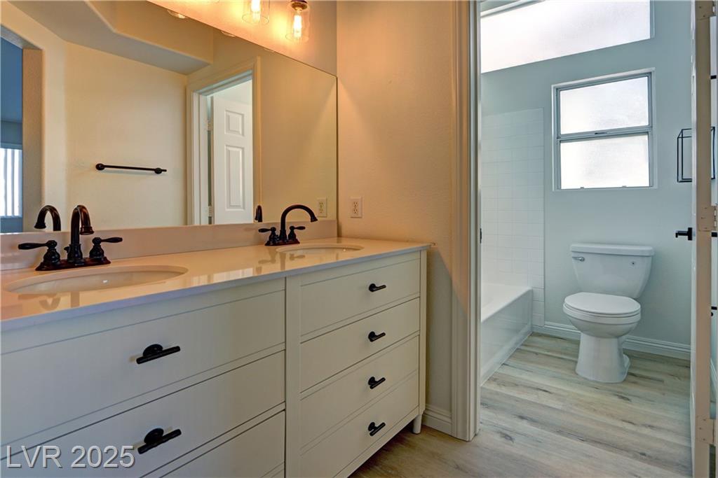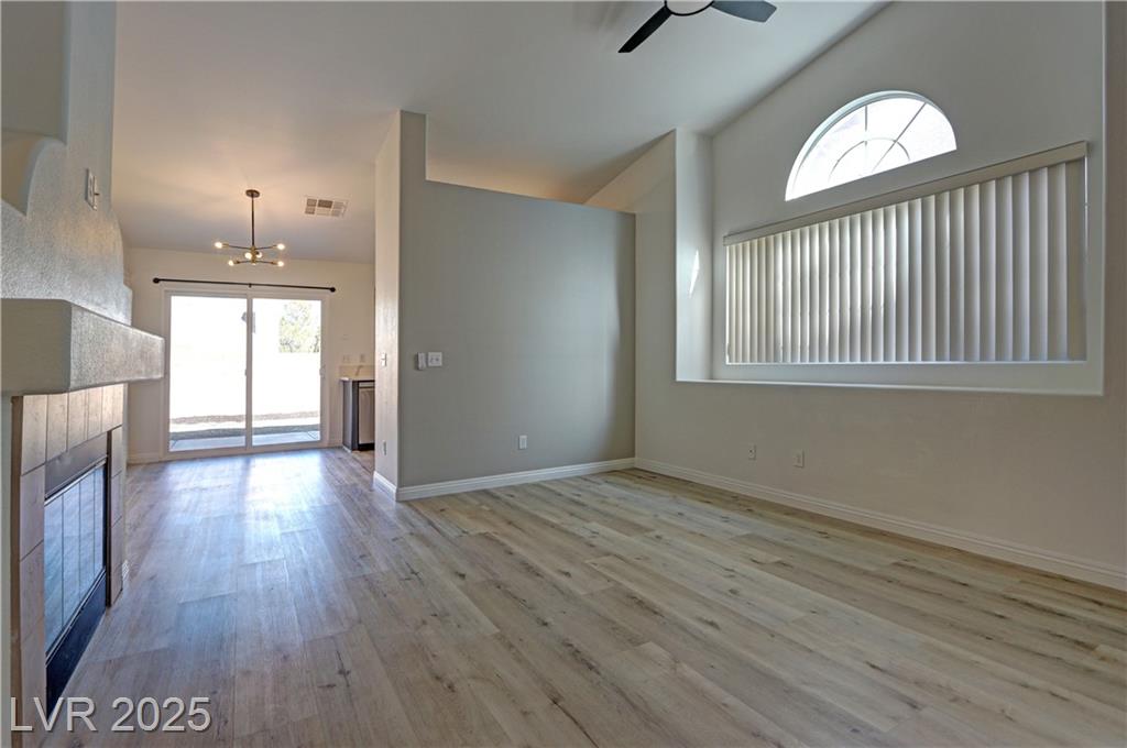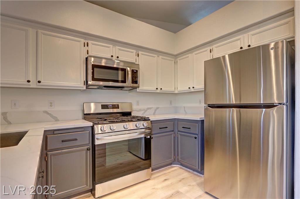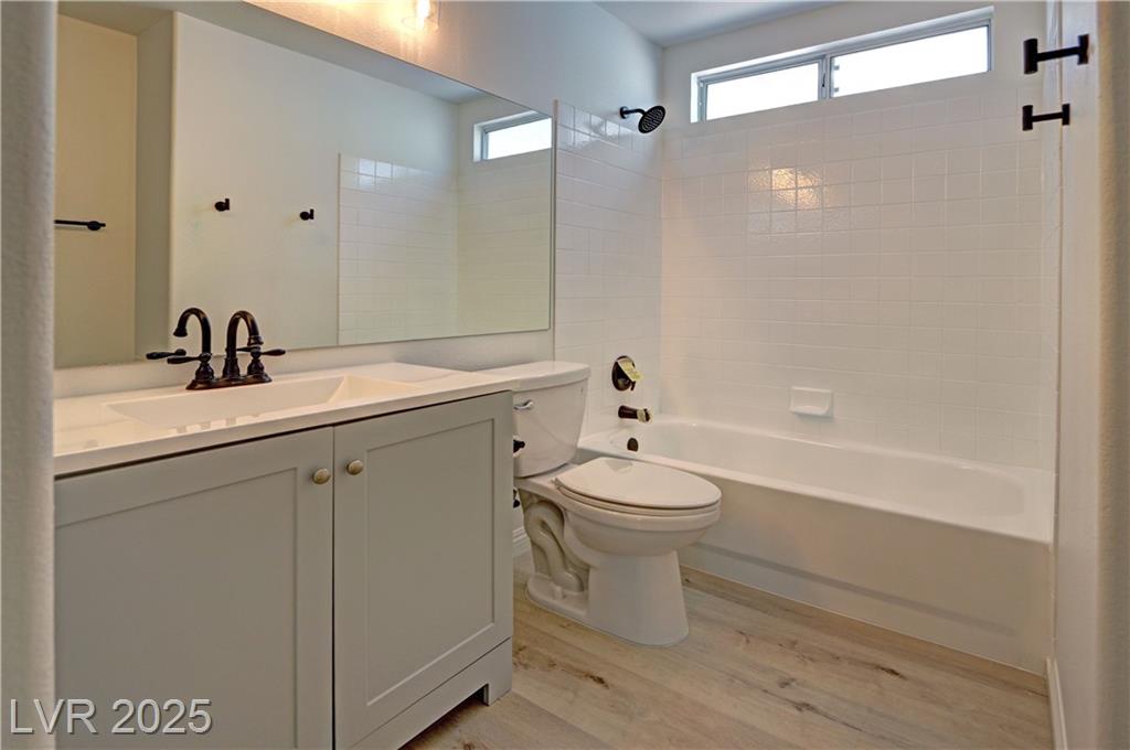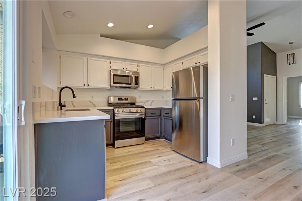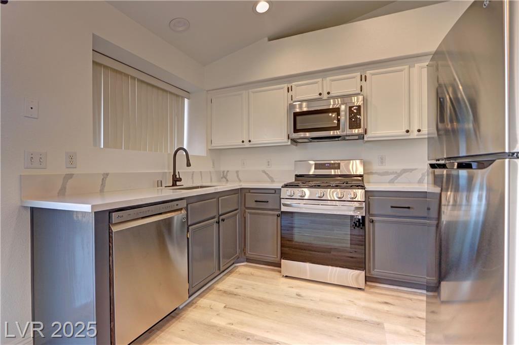 Stylishly Renovated 3BR/2BA Summerlin Home –AVAILABLE NOW! The home features NEW luxury vinyl plank flooring, upgraded baseboards, and a three-tone interior that brings a fresh, modern feel to every room. The kitchen stands out with NEW cabinetry, sleek quartz countertops, custom backsplash, stainless steel sink and faucet, garbage disposal, and recessed lighting- a perfect blend of style and practicality. Enjoy a bright and open living room, ideal for entertaining or relaxing, complemented by updated ceiling fans and energy-efficient lighting fixtures throughout the home. Both bathrooms have been upgraded with refinished tub and shower walls, modern vanities, updated fixtures and hardware, and toilets. Upgraded washer and dryer with multiple linen closets providing ample storage space. Step outside through a double-pane sliding glass door into a private, tranquil backyard—perfect for enjoying the outdoors.Conveniently located minutes from DTS, parks, schools, shopping, dining, & golf.
