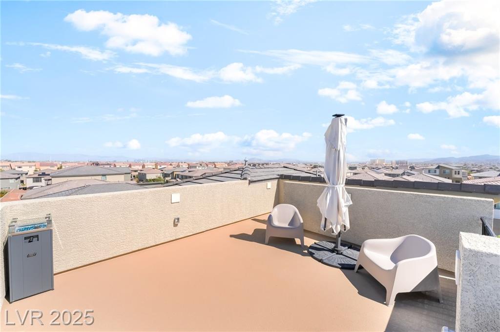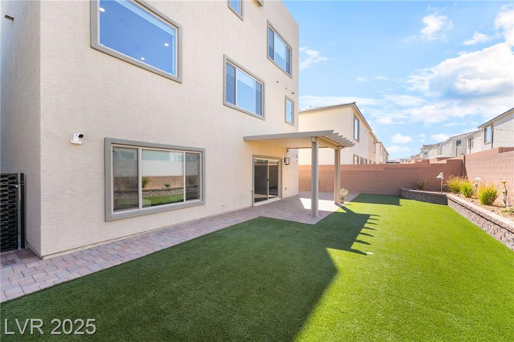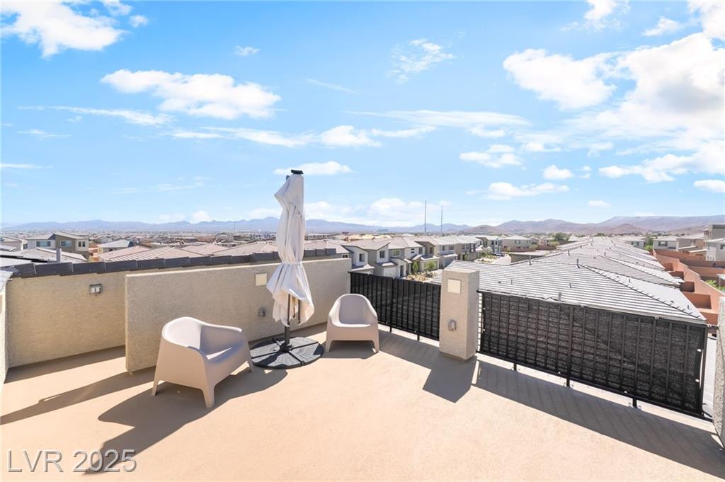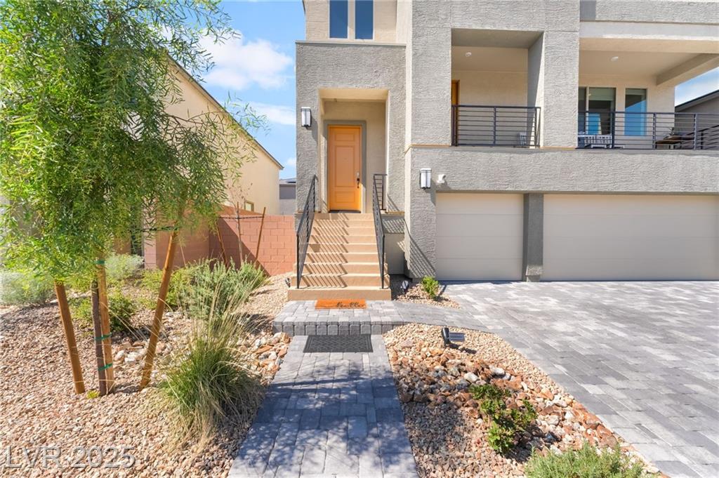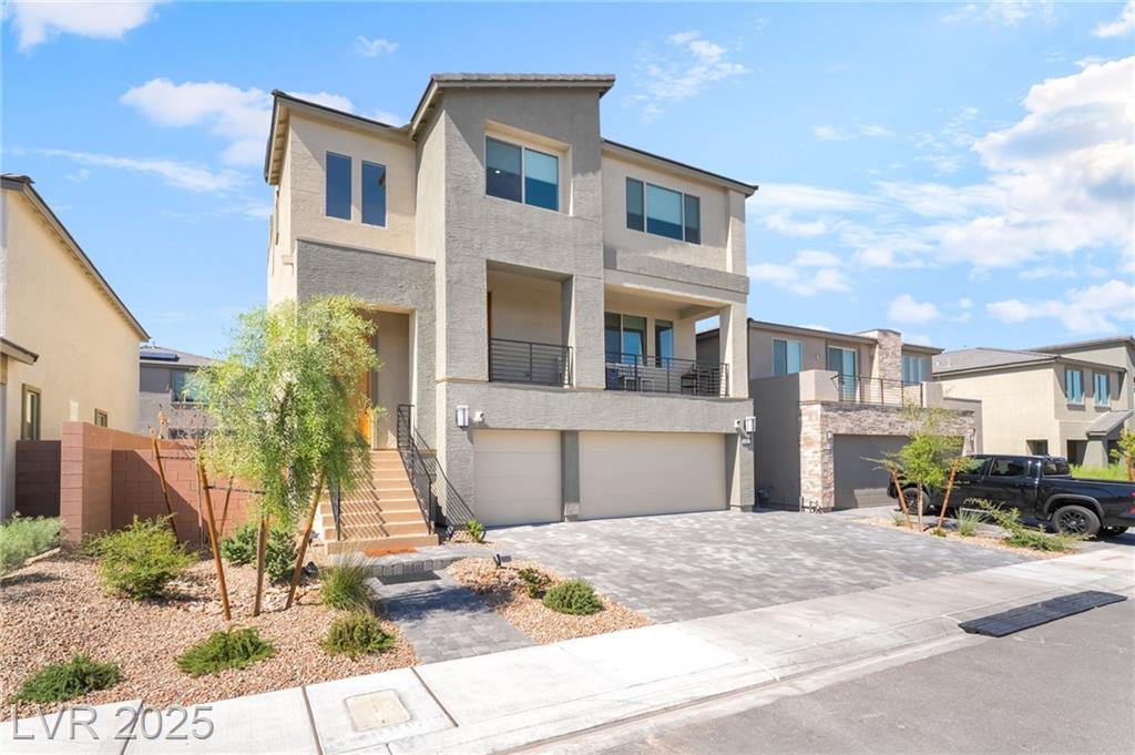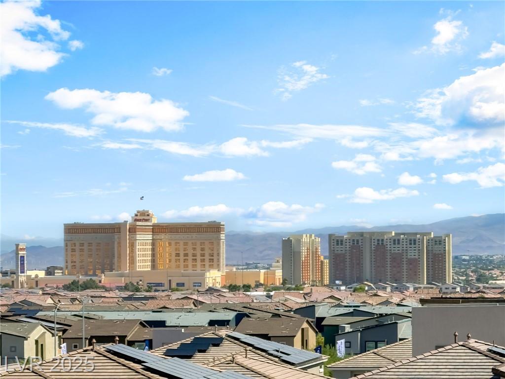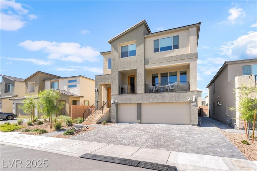 Beautiful 3-story gem with rooftop deck in a desirable neighborhood! This 2024-built 5 bed, 4.5 bath, 4,108 sq. ft. home features over $60K in upgrades and a 3-car garage. Designed for flexibility, it offers dual owner’s suites—one on the first level with a private living room and direct access to a finished backyard with turf, misters, and covered awning. The main level boasts an open kitchen, dining, and living area that flows to a large patio for indoor-outdoor entertaining. Upstairs, the second owner’s suite and additional spacious bedrooms provide comfort and privacy. The crown jewel is the rooftop deck with panoramic mountain and Strip views. Low monthly HOA, close to top-rated schools, shopping, dining, and freeway access. A rare opportunity blending style, convenience, and value—schedule your private tour today!