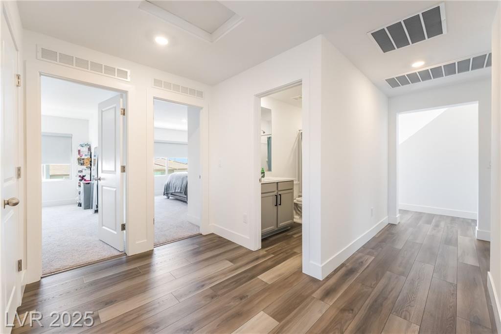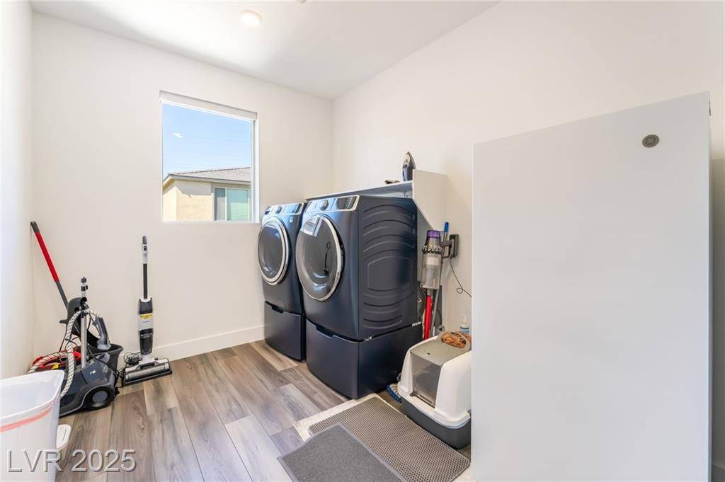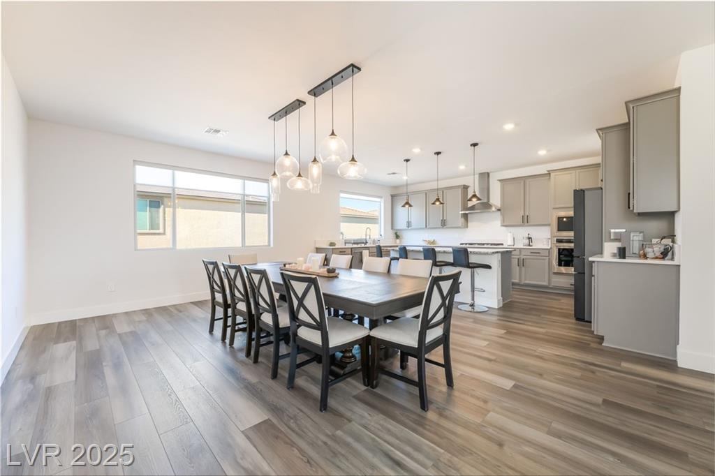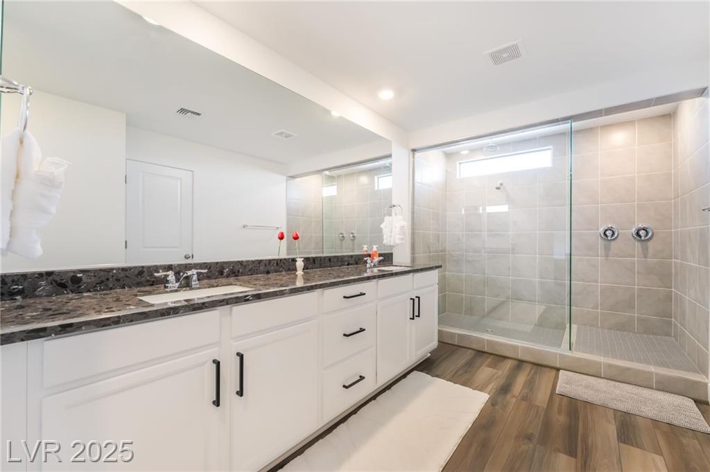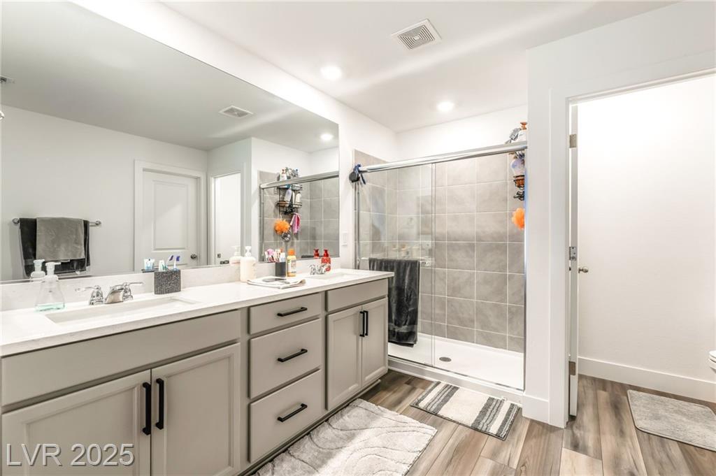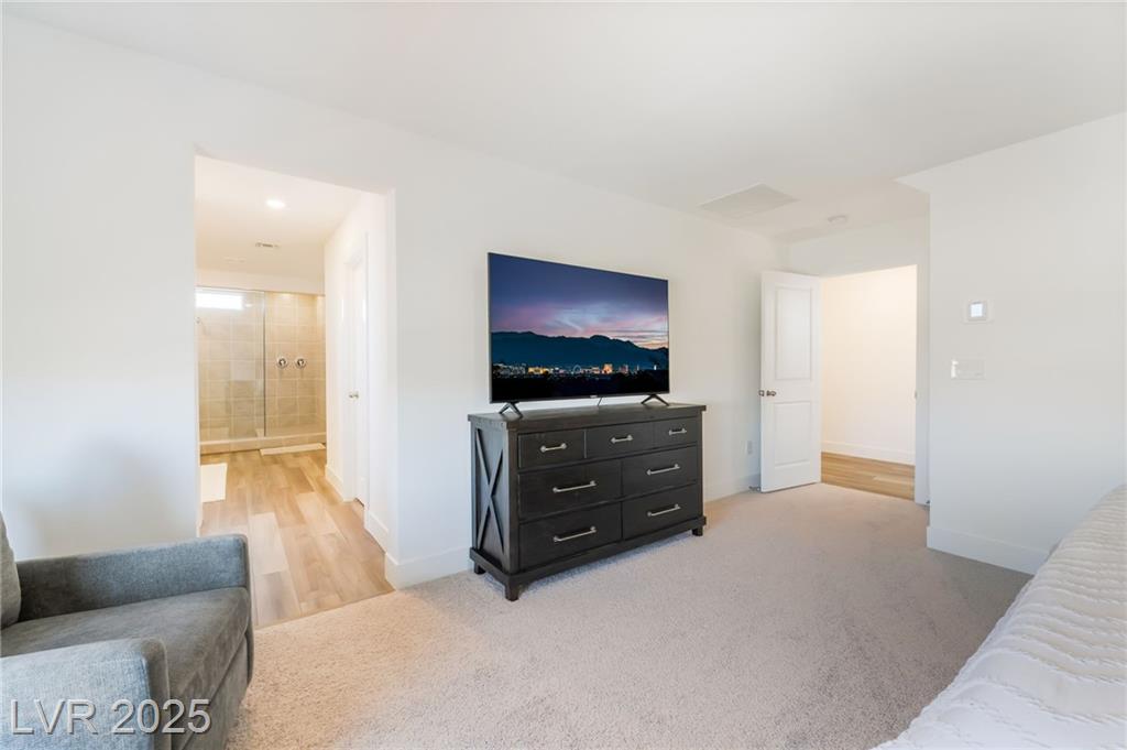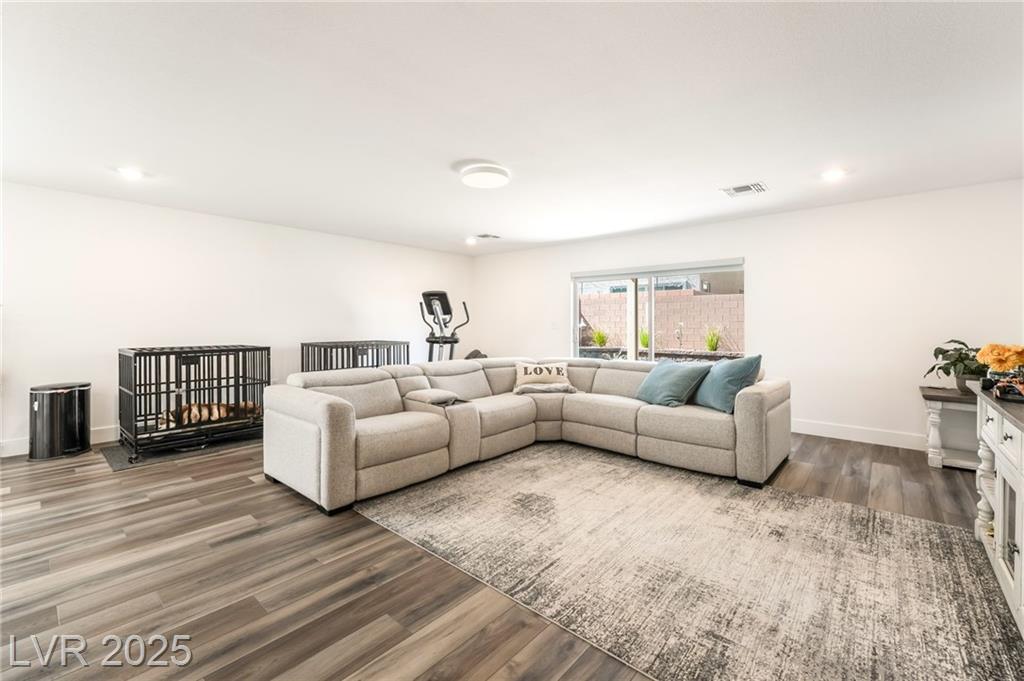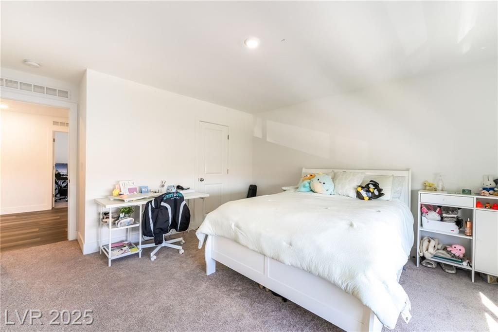 Beautiful 3-story gem with rooftop deck in a desirable neighborhood! This 2024-built 5 bed, 4.5 bath, 4,108 sq. ft. home features over $60K in upgrades and a 3-car garage. Designed for flexibility, it offers dual owner’s suites—one on the first level with a private living room and direct access to a finished backyard with turf, misters, and covered awning. The main level boasts an open kitchen, dining, and living area that flows to a large patio for indoor-outdoor entertaining. Upstairs, the second owner’s suite and additional spacious bedrooms provide comfort and privacy. The crown jewel is the rooftop deck with panoramic mountain and Strip views. Low monthly HOA, close to top-rated schools, shopping, dining, and freeway access. A rare opportunity blending style, convenience, and value—schedule your private tour today!