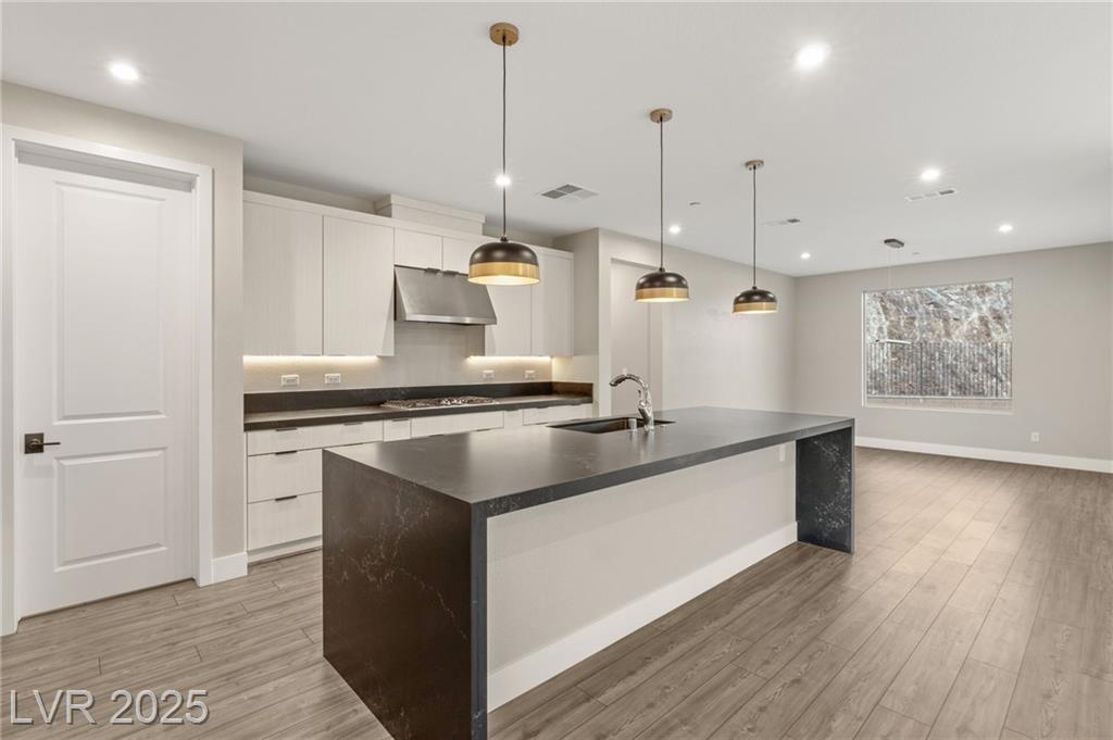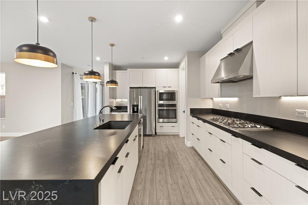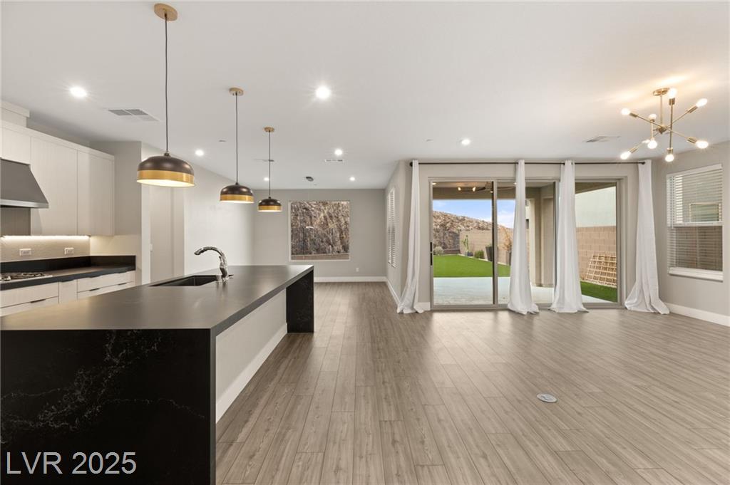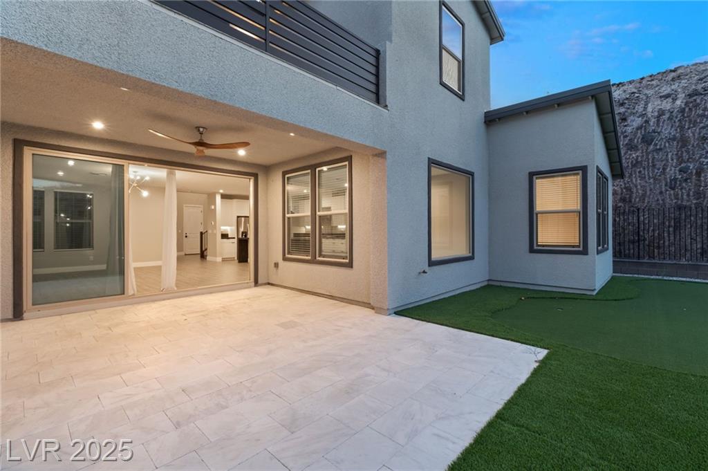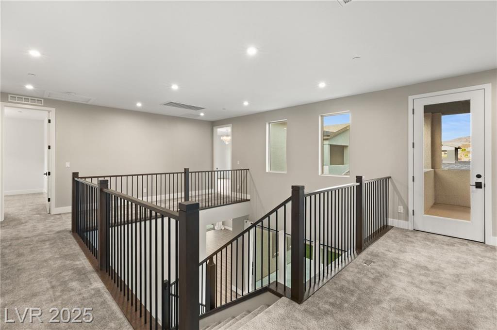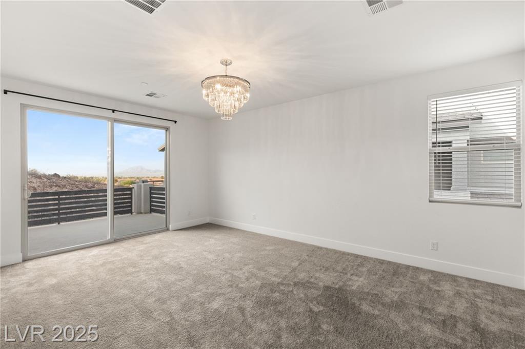 Luxury home in the gated community of Midnight Ridge, a secluded canyon surrounded by foothills and landscapes! Located at the end of a private cul-de-sac, this home offers unparalleled privacy. The expansive open floor plan features generously sized bedrooms and upgraded ceiling heights. Upon entering, you'll find a designer wall and modern fixture. The kitchen is a chef's dream with quartz countertops, a matte black island, stainless steel appliances & walk in pantry. Downstairs includes luxury vinyl flooring & full bedroom suite with a private bath. Upstairs, the primary bedroom features a balcony and a large walk-in closet. The primary bath offers a spa-like experience with a walk-in shower, dual sinks, quartz counters & rain shower. The home includes modern stair railing and smart home technology. With outdoor living spaces, including two balconies, a courtyard, stacking doors to the patio, a putting green, and a large lot, this home is your personal retreat atop the mountains!