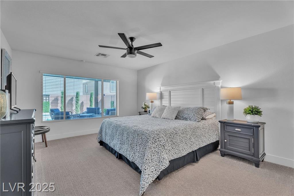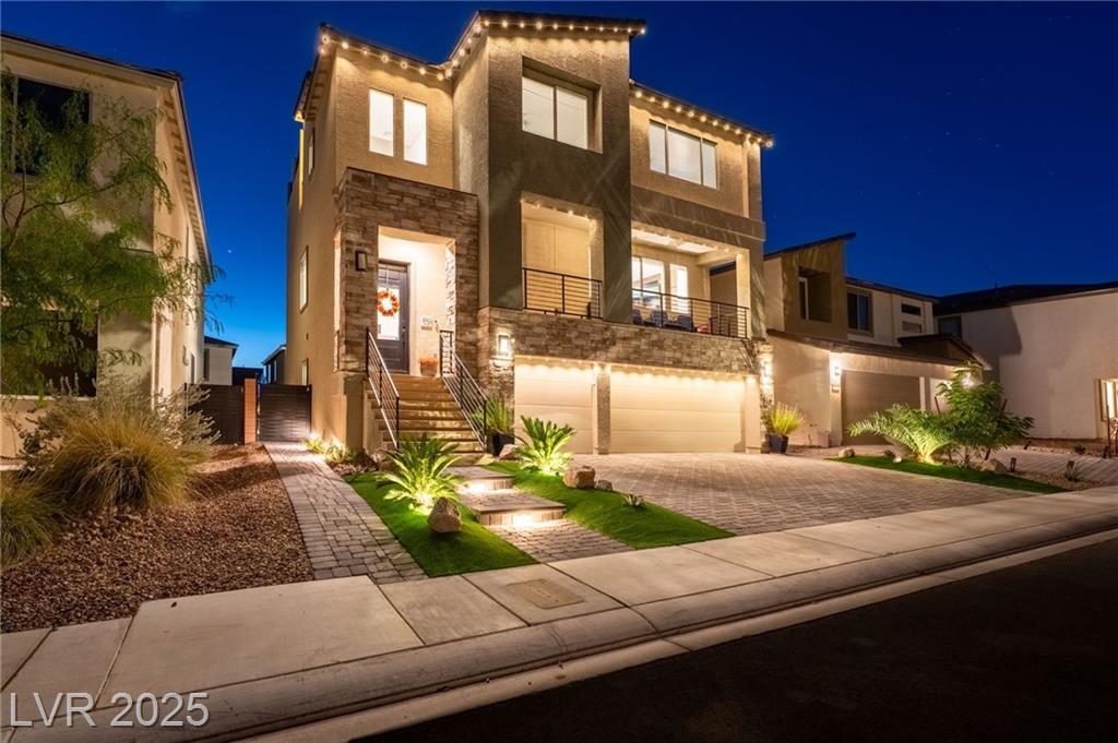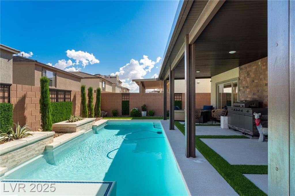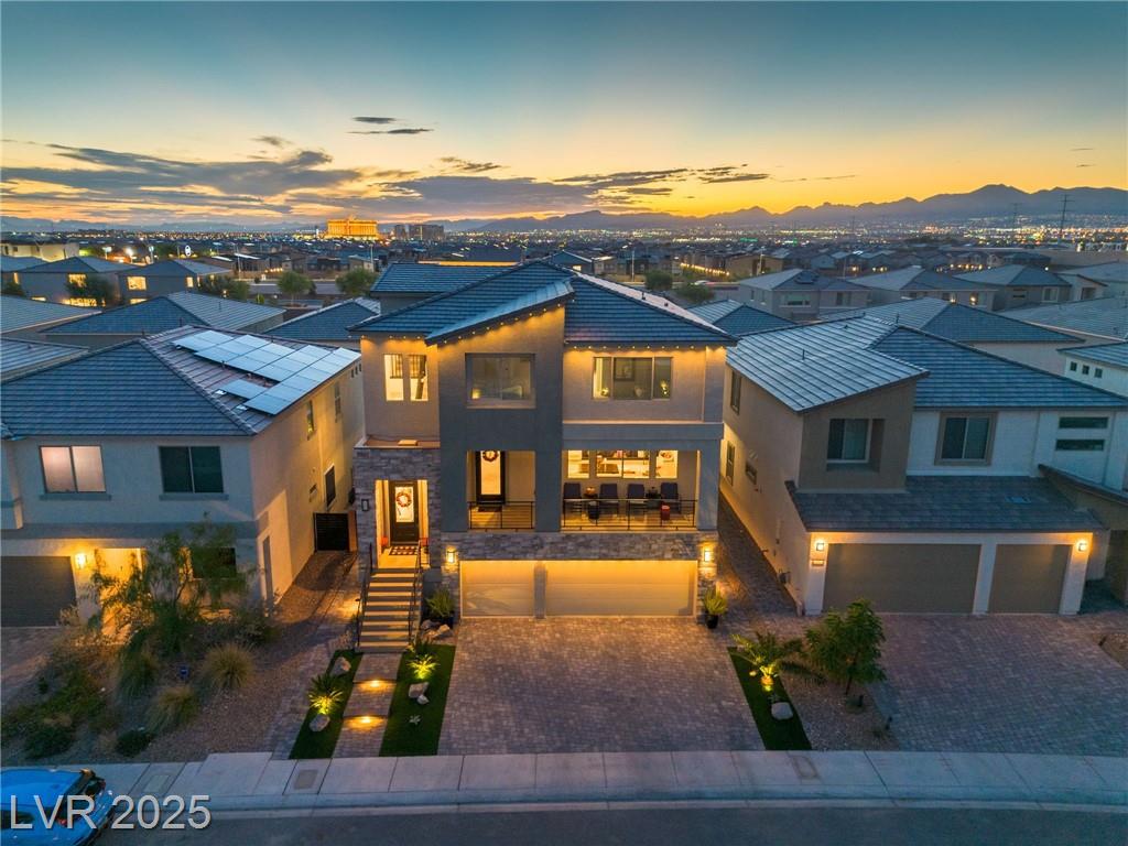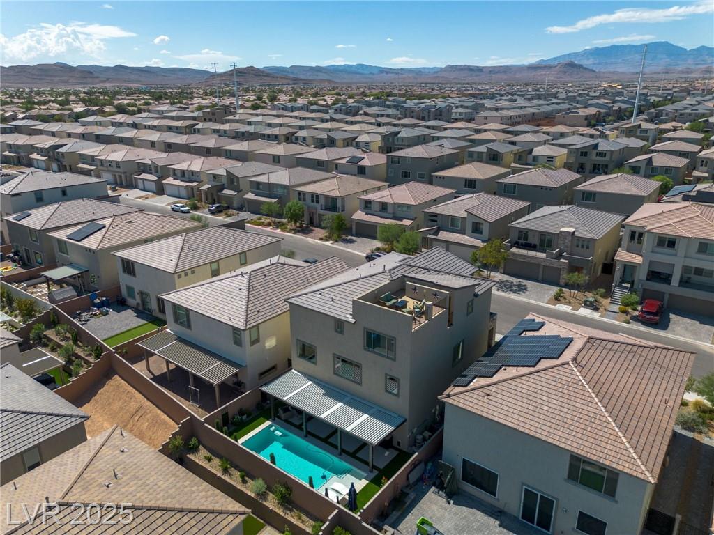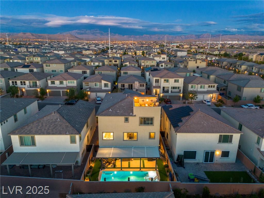 Fall in love with the home as you discover its unique features & be amazed! Rooftop deck has mountain and strip views. Enjoy the panoramic views all year. Less than six months old; upgraded carpet (50 year Mohawk) and front yard landscape. Custom pool, covered patio and backyard landscaping w/ accent lighting might make this your favorite vacation spot. First floor has a large gathering area and large bedroom suite, perfect for guests. All bedrooms have walk in closets. Extra cabinetry on first and main floor makes for abundant storage. Beautiful fans, mechanical blinds, designer lighting and more. Bookcases on main floor become an instant WOW feature and newer fireplace and custom walls are stunning. Oversize refrigerator was purchased and fitted a little over a year ago. Dedicated holiday lighting makes decorating easy, all year long. First floor gathering room and main floor are tile. Laundry has cabinets and a sink. Check out the custom closet in the primary..absolutely beautiful.