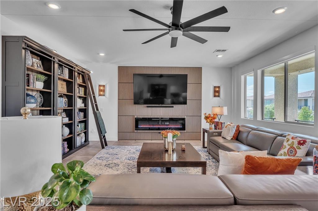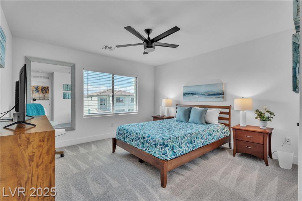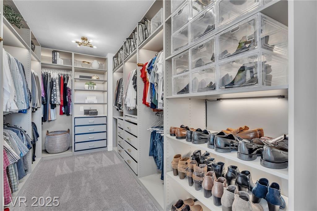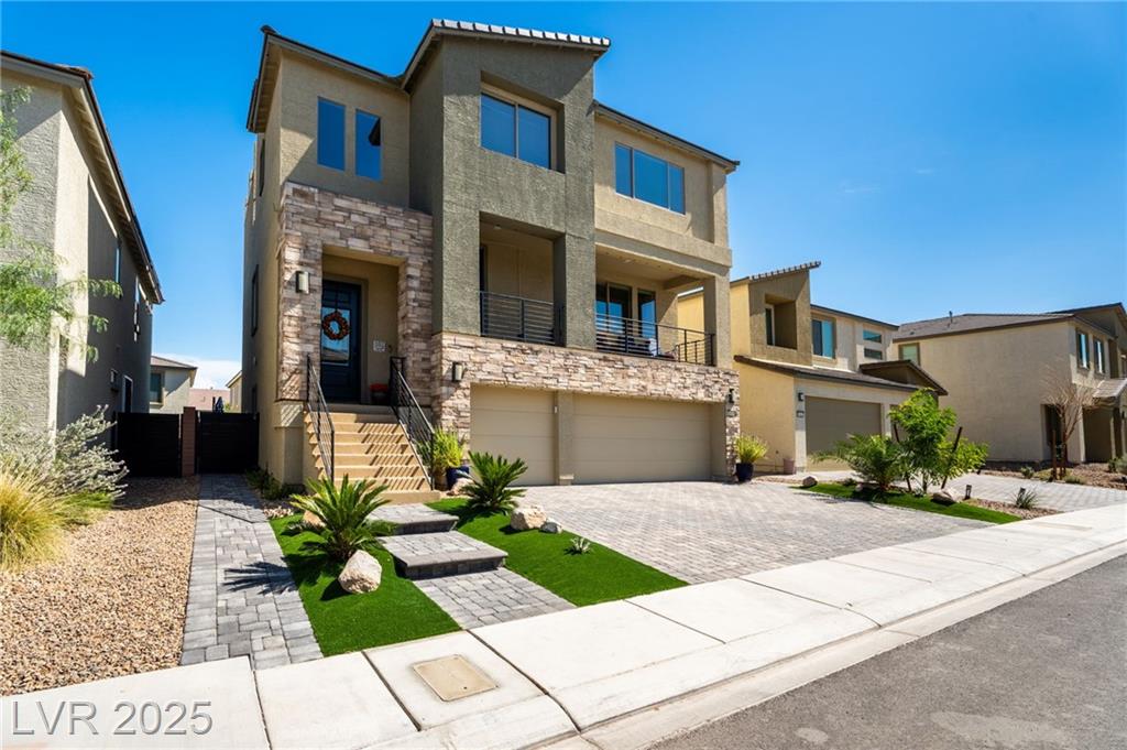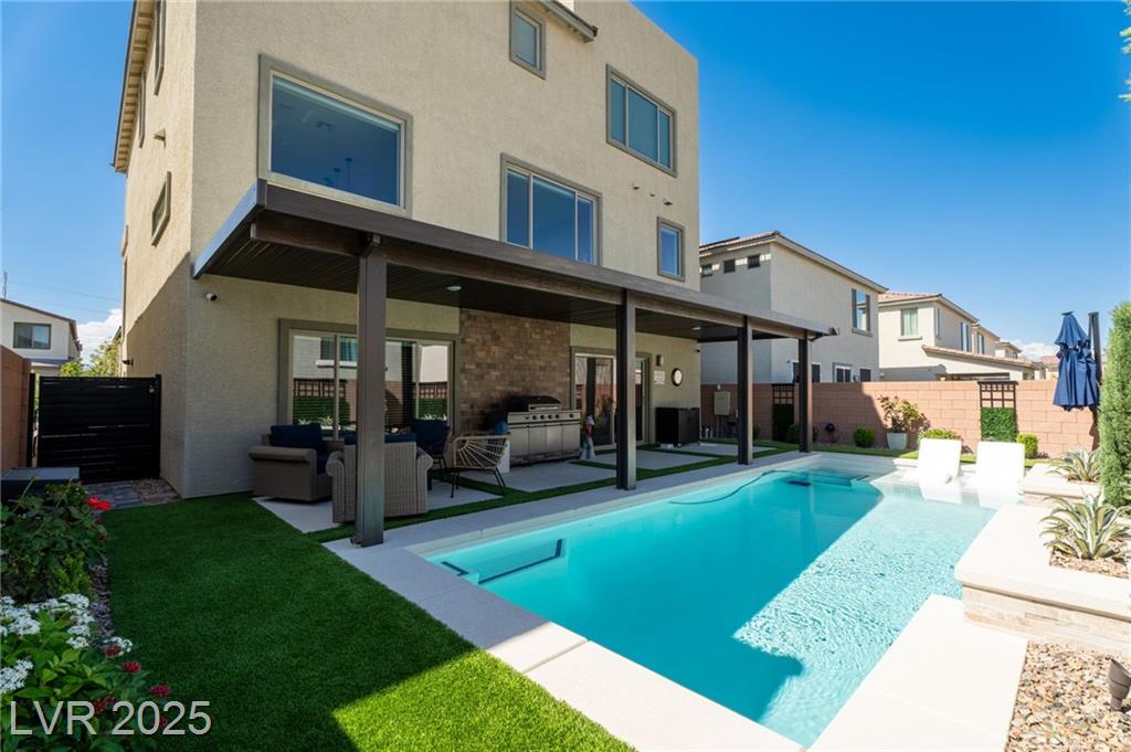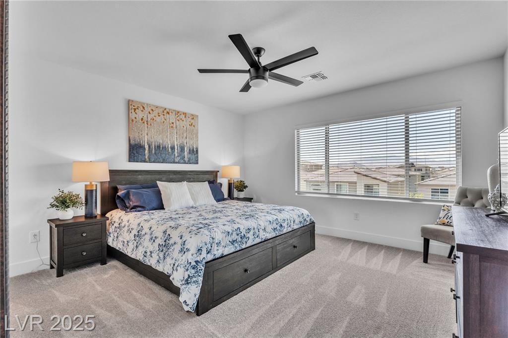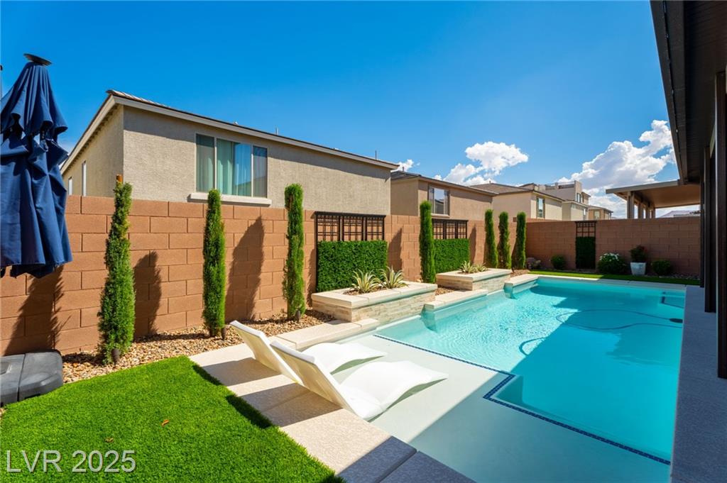 Fall in love with the home as you discover its unique features & be amazed! Rooftop deck has mountain and strip views. Enjoy the panoramic views all year. Less than six months old; upgraded carpet (50 year Mohawk) and front yard landscape. Custom pool, covered patio and backyard landscaping w/ accent lighting might make this your favorite vacation spot. First floor has a large gathering area and large bedroom suite, perfect for guests. All bedrooms have walk in closets. Extra cabinetry on first and main floor makes for abundant storage. Beautiful fans, mechanical blinds, designer lighting and more. Bookcases on main floor become an instant WOW feature and newer fireplace and custom walls are stunning. Oversize refrigerator was purchased and fitted a little over a year ago. Dedicated holiday lighting makes decorating easy, all year long. First floor gathering room and main floor are tile. Laundry has cabinets and a sink. Check out the custom closet in the primary..absolutely beautiful.