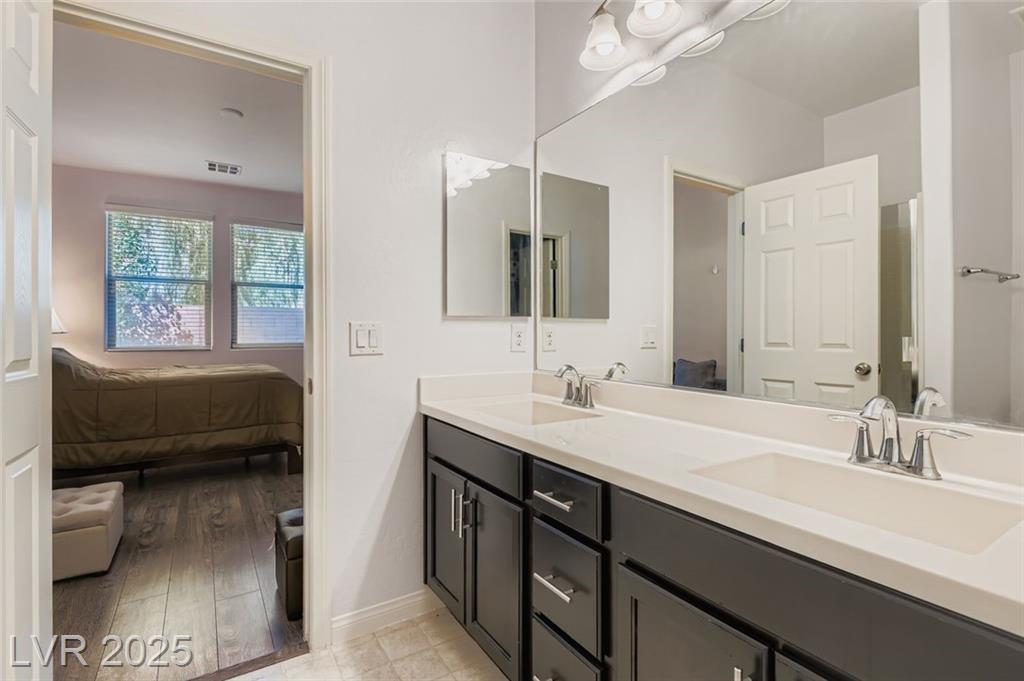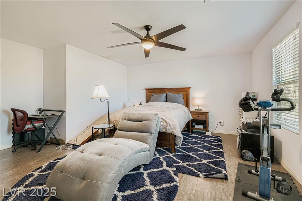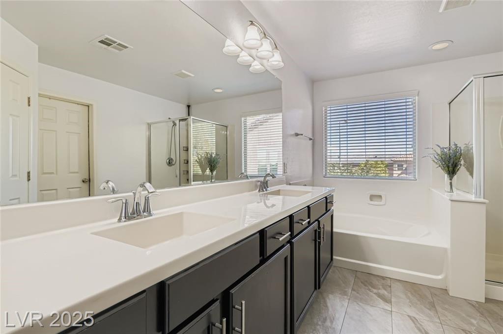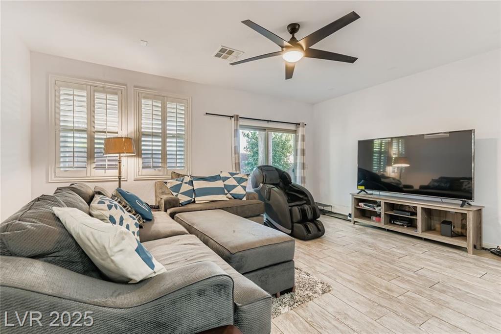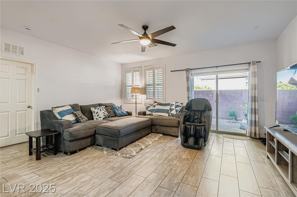 Location, location, location! Come check out this beautiful, well cared for home right outside of Summerlin—without the extra fees! Just 1.2 miles from Bishop Gorman High School this home puts you minutes from the airport, Allegiant Stadium, the Strip, major freeways, shopping, and dining. Inside, you’ll love the flexible layout featuring a large downstairs bedroom with a full bath and walk-in closet—perfect for guests or multi-gen living. Upstairs, the spacious primary suite includes a huge walk-in closet that’s sure to impress. Enjoy tons of natural light, stylish plantation shutters, and a modern kitchen with stainless steel appliances. Tranquil backyard with covered patio and no neighbors behind, great for peaceful mornings or family barbecues. This home has it all—style, space, and an unbeatable location. Come see it for yourself!