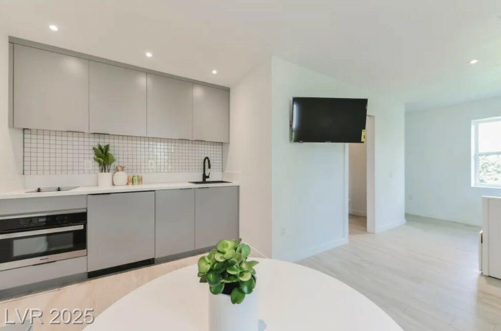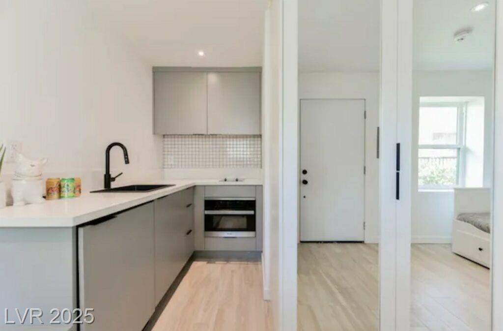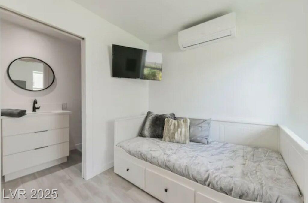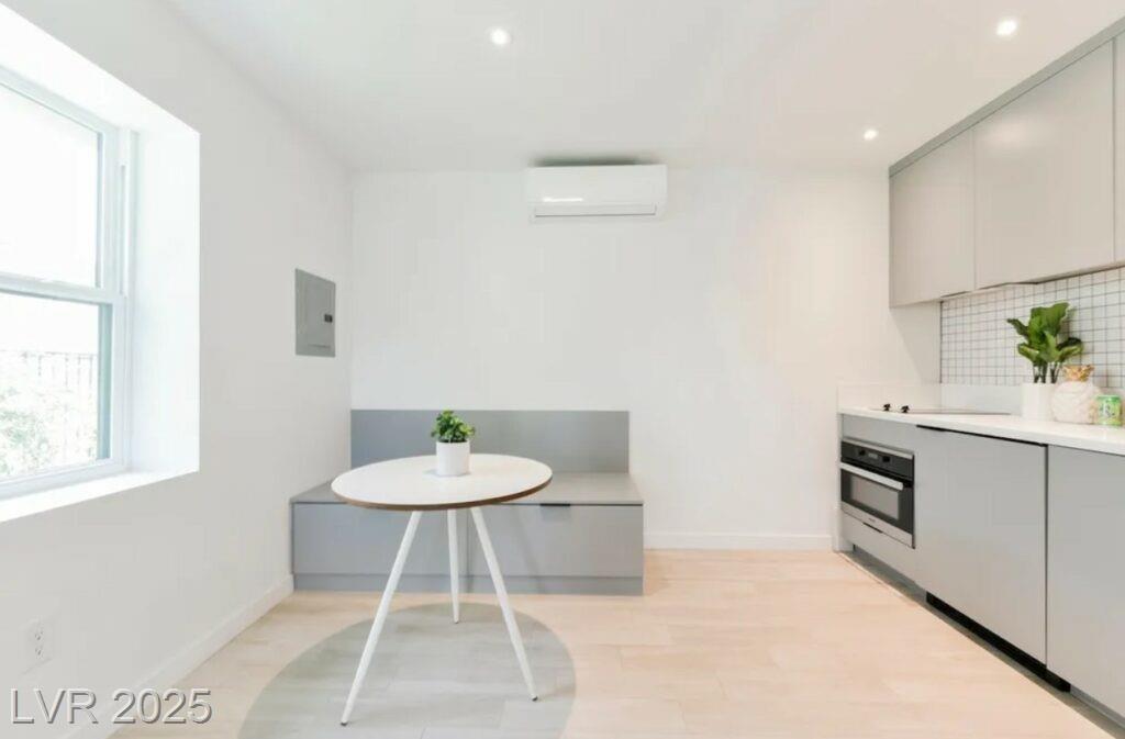 With a 2019 EPIC down-to-the-studs renovation this property is beyond gorgeous. Absolutely Gorgeous MODERN Studio Apartment in the Best location Downtown. All utilities Included! The unit itself has unreal air conditioning and heating, custom kitchens with state-of-the-art appliances (designed by Italian Designer Gennaro Fattore), furnished, gorgeous showers, all tile floors for easy and clean. Metal roof – no leaks! Too much to describe. Easily the nicest studio apartment in Downtown by far. With only 12 apartments total in this boutique community, do not miss the chance to live on the best street Downtown Vegas. With an 87-point WALK score, you can walk right out of your front door to Eclipse movies, Le Pho, Greens and Proteins, First Friday and so much more. ALL UTILITIES INCLUDED with WiFi. Mini-fridge, combination microwave/conventional oven, 2-burner stove. 50" TV, Double bed, booth & table. Mini-split cooling & heating, & shared laundry. Pets: Yes, small.
