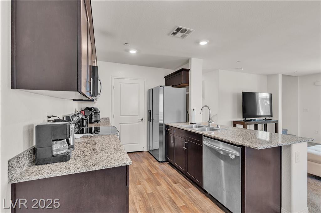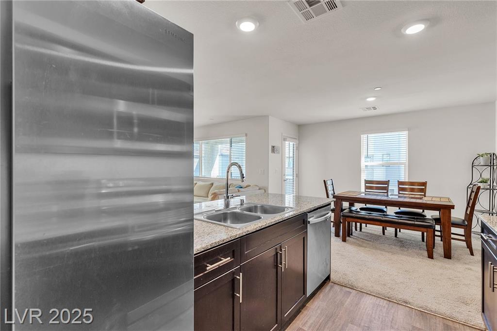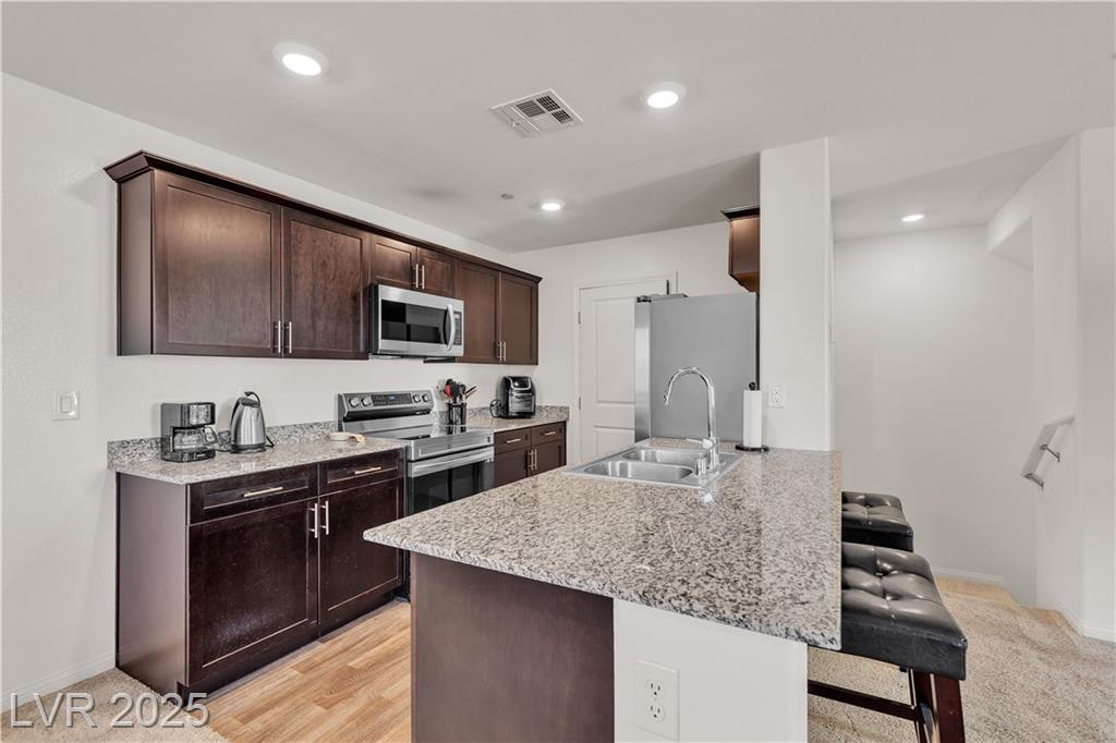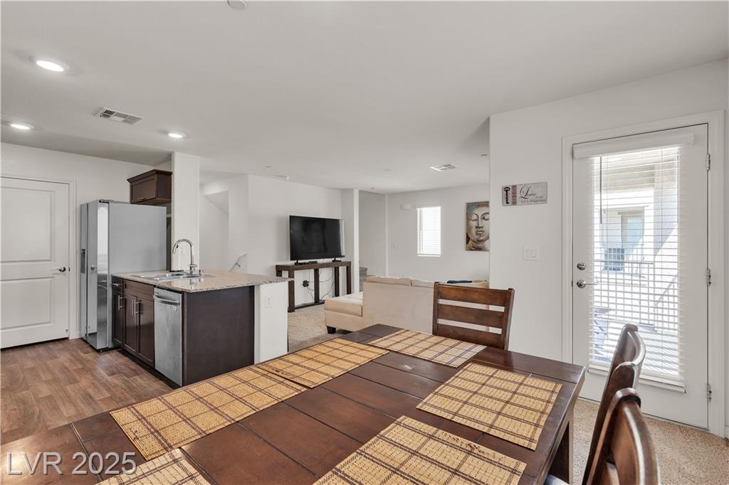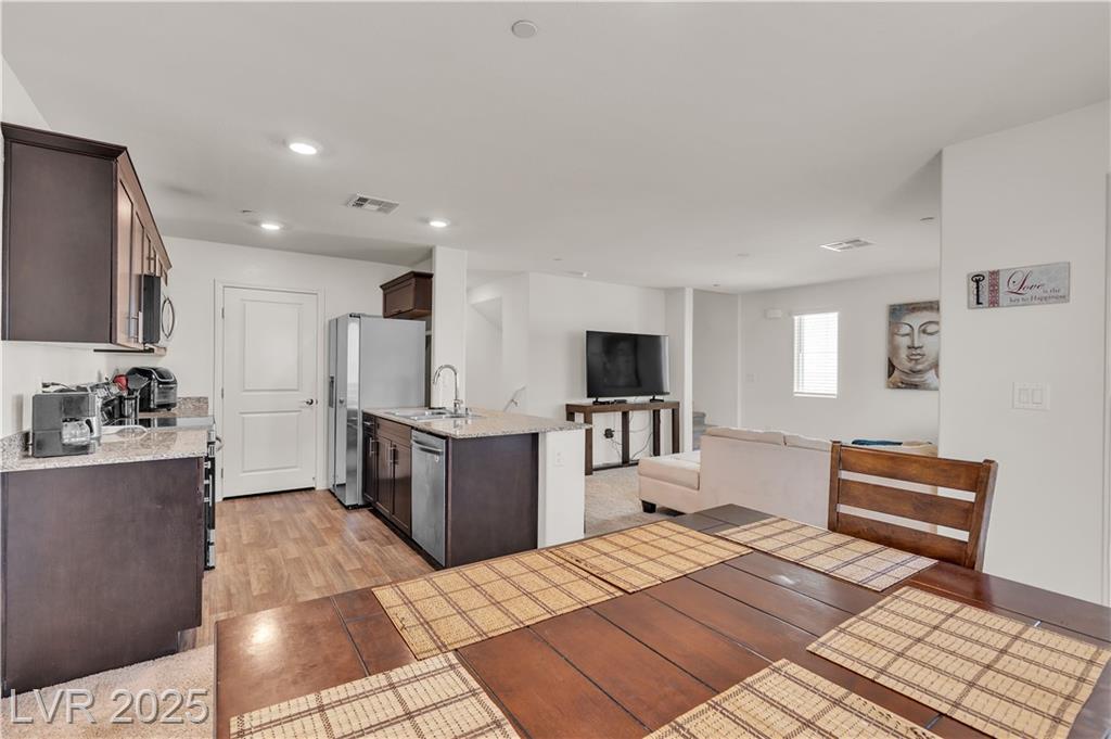 Welcome to 7007 Crimson Shadow, a stylish 3-level townhome nestled in the gated Watercolor community of North Las Vegas. This 1,266 sq ft residence offers 2 spacious bedrooms and 2 full baths, and large loft, ideal for comfortable living or a savvy investment. The modern kitchen features granite countertops, rich dark cabinetry, stainless steel appliances, and wood laminate flooring that continues into both bathrooms for a cohesive look. Each bath is upgraded with granite surfaces, adding a touch of luxury. And the mid-level balcony provides mountain views and place to relax during the cool fall evenings. Enjoy resort-style amenities including a sparkling pool and spa, basketball court, park, playground, and BBQ picnic area—perfect for relaxing or entertaining. With easy access to the freeway, commuting is a breeze. Whether you're a first-time buyer or looking to downsize, this home combines convenience, comfort, and community charm. Don’t miss your chance to own in Watercolor!