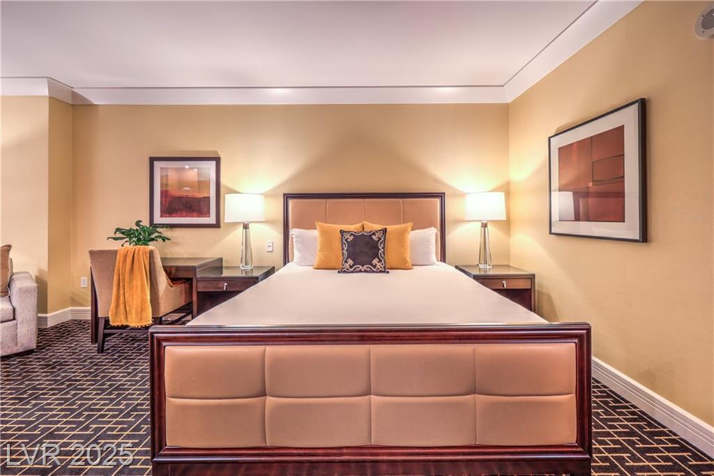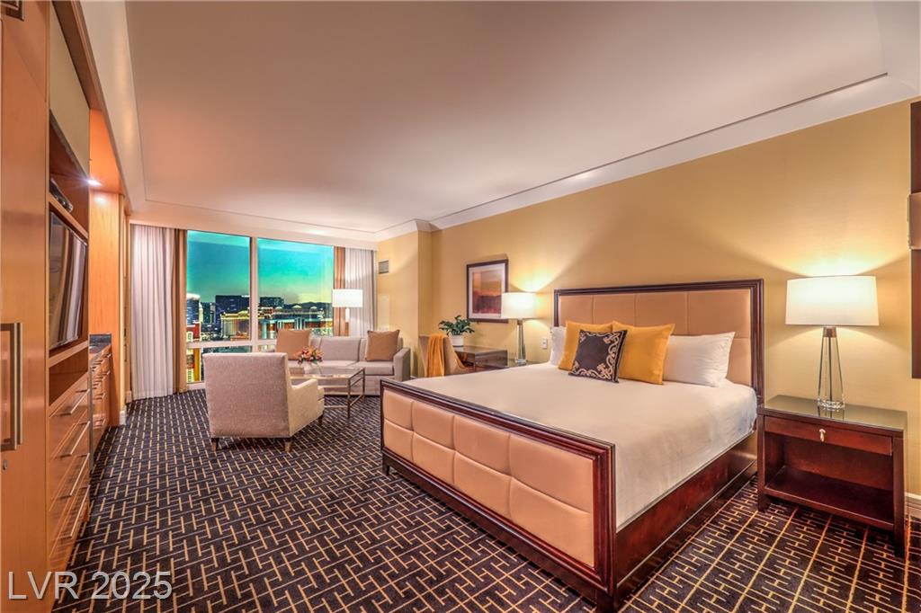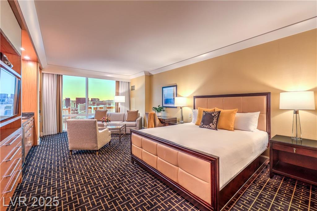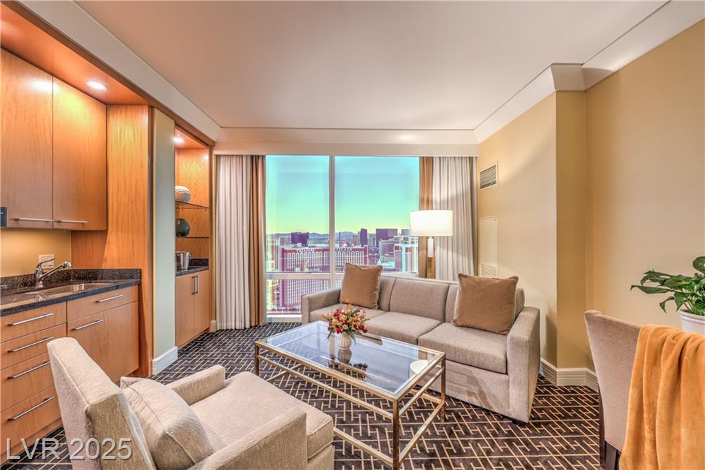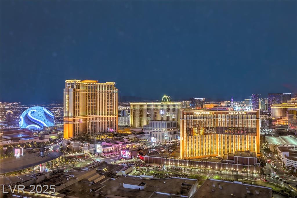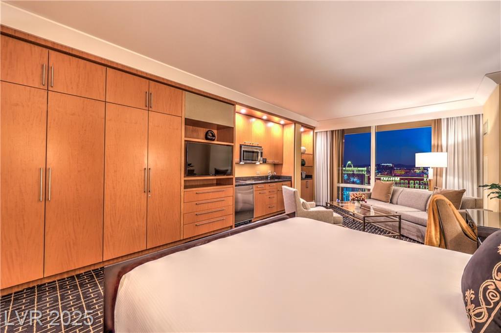 Experience the height of luxury living in Las Vegas with this sophisticated 534-square-foot studio condo, located on the 47th floor and boasting stunning panoramic views of the Las Vegas Strip, the iconic Sphere, and the resort-style pool below. This beautifully appointed unit features upscale touches including crown molding, a plush king-sized bed, custom cabinetry, and a kitchenette. The spa-inspired marble bathroom offers a dual-sink vanity and a generous six-foot soaking tub—ideal for relaxing in style. Blending elegance and comfort, this high-rise sanctuary embodies the essence of resort living right in the center of the city. Own your own slice of Las Vegas luxury today.