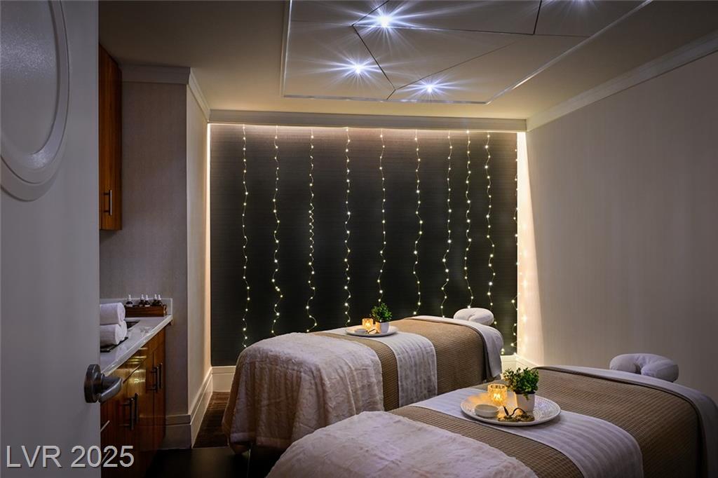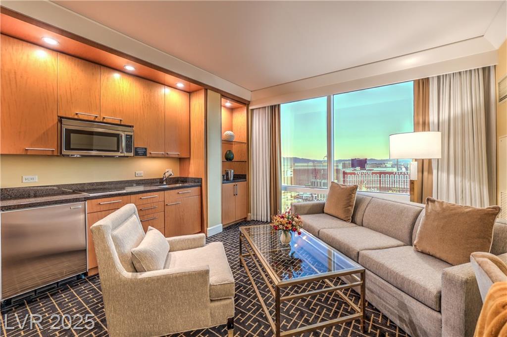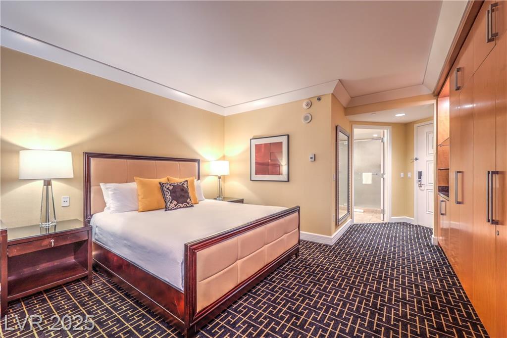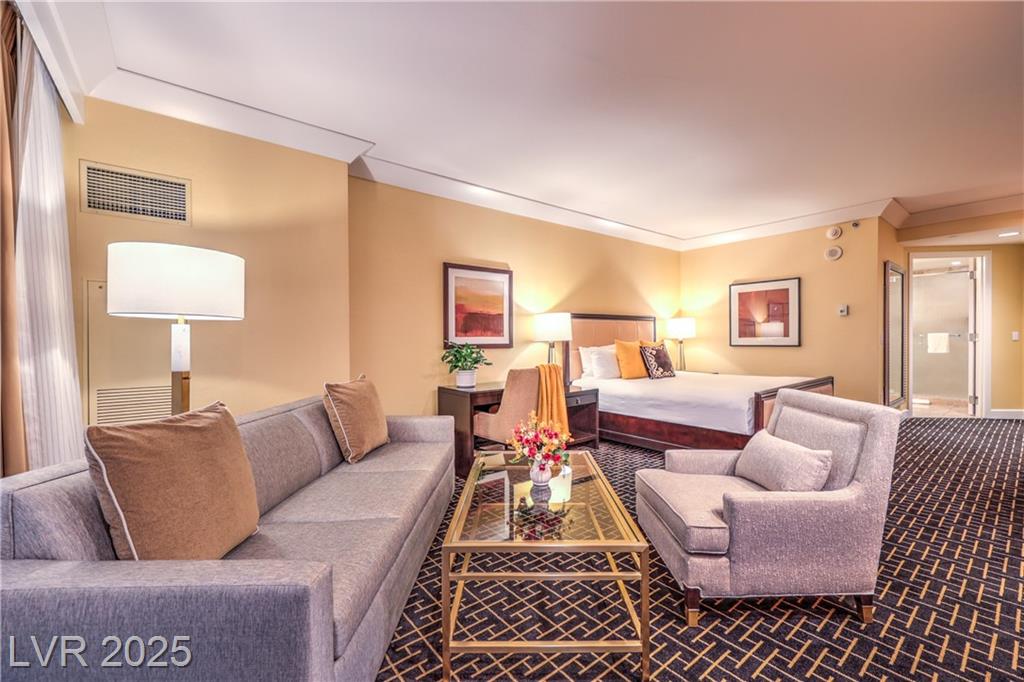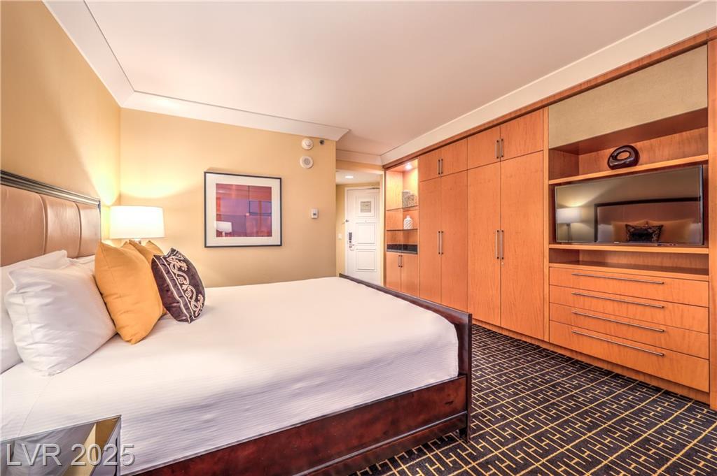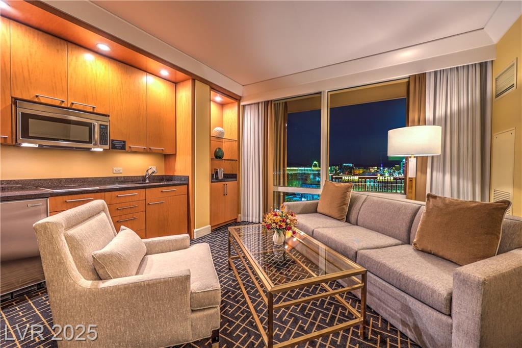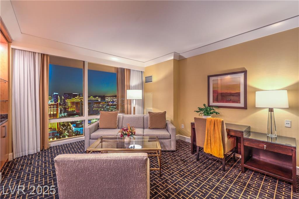 Experience the height of luxury living in Las Vegas with this sophisticated 534-square-foot studio condo, located on the 47th floor and boasting stunning panoramic views of the Las Vegas Strip, the iconic Sphere, and the resort-style pool below. This beautifully appointed unit features upscale touches including crown molding, a plush king-sized bed, custom cabinetry, and a kitchenette. The spa-inspired marble bathroom offers a dual-sink vanity and a generous six-foot soaking tub—ideal for relaxing in style. Blending elegance and comfort, this high-rise sanctuary embodies the essence of resort living right in the center of the city. Own your own slice of Las Vegas luxury today.