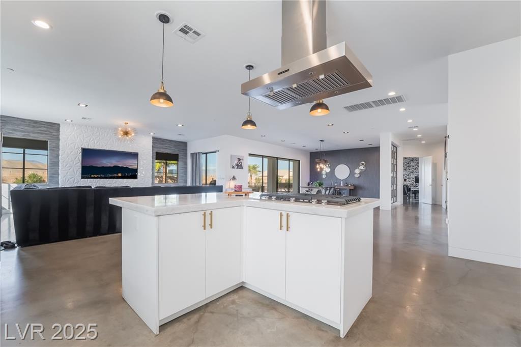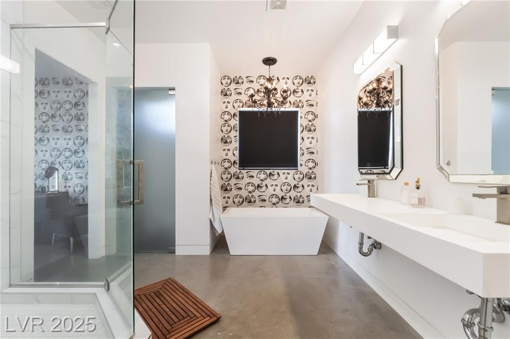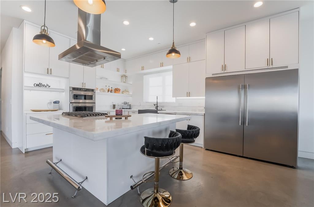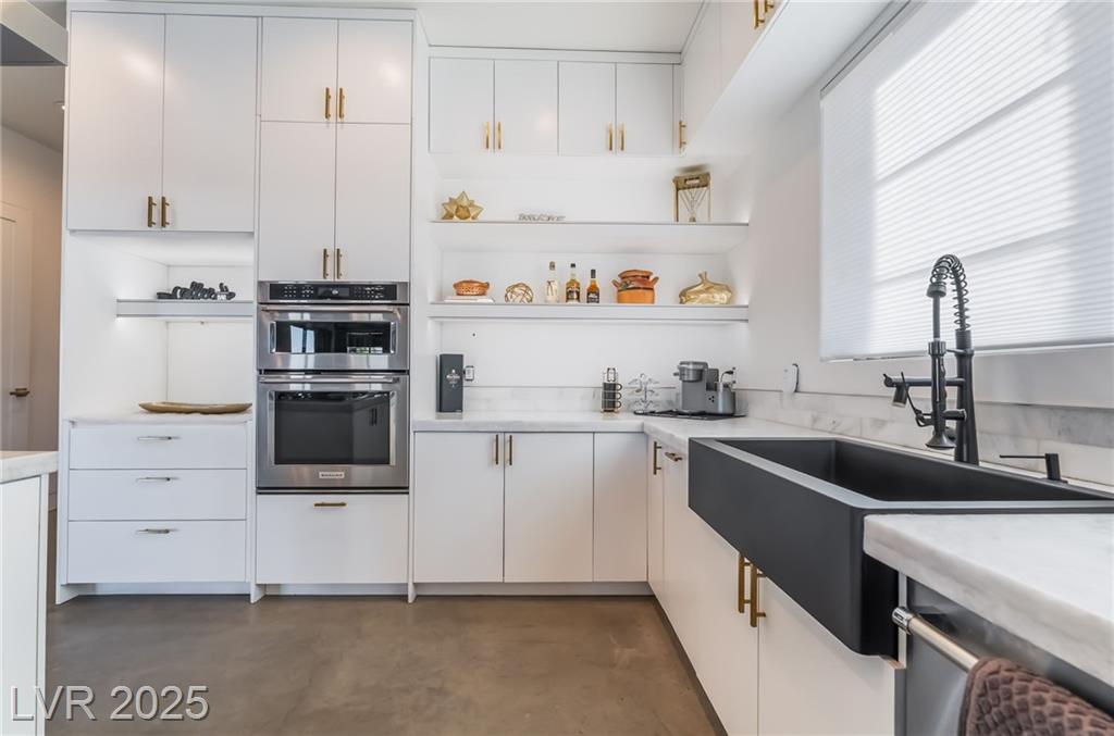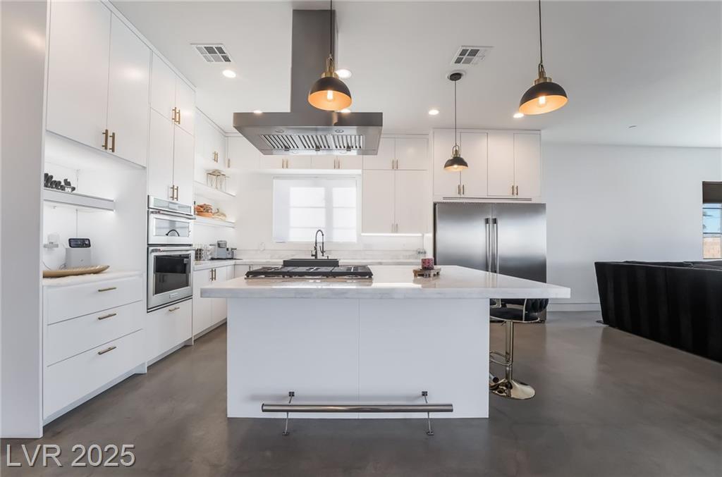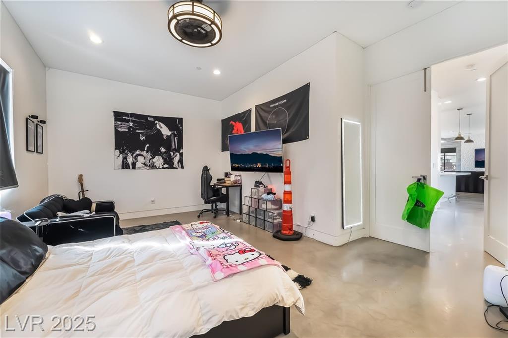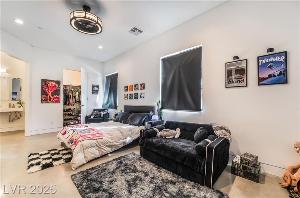 Modern luxury meets functionality in this stunning single-story home set on just under a half-acre with paved and gated RV parking. The open-concept layout showcases polished concrete floors, designer lighting, and sleek finishes throughout. The chef’s kitchen features an oversized stainless steel refrigerator, double ovens, and a waterfall island perfect for entertaining. The spacious great room highlights a statement fireplace wall and panoramic sliding doors leading to a covered patio with mountain views. Retreat to the spa-like primary suite with a rainfall shower and elegant finishes. Enjoy endless possibilities in the expansive backyard with room for a pool or casita. Don’t miss your chance to own this stylish modern retreat in a prime location—schedule your private showing today!