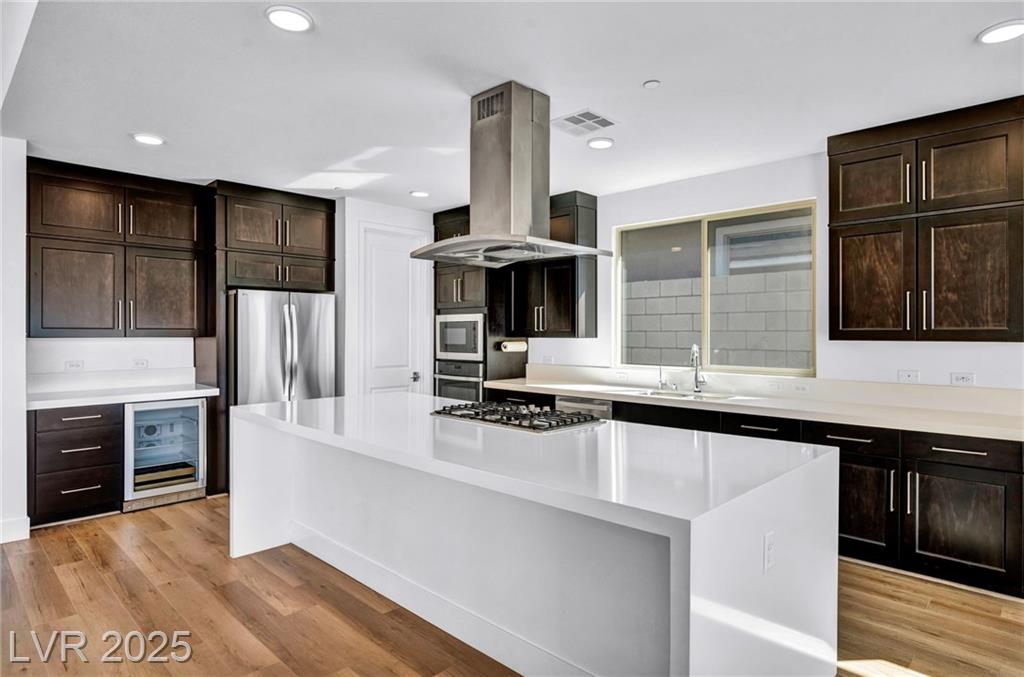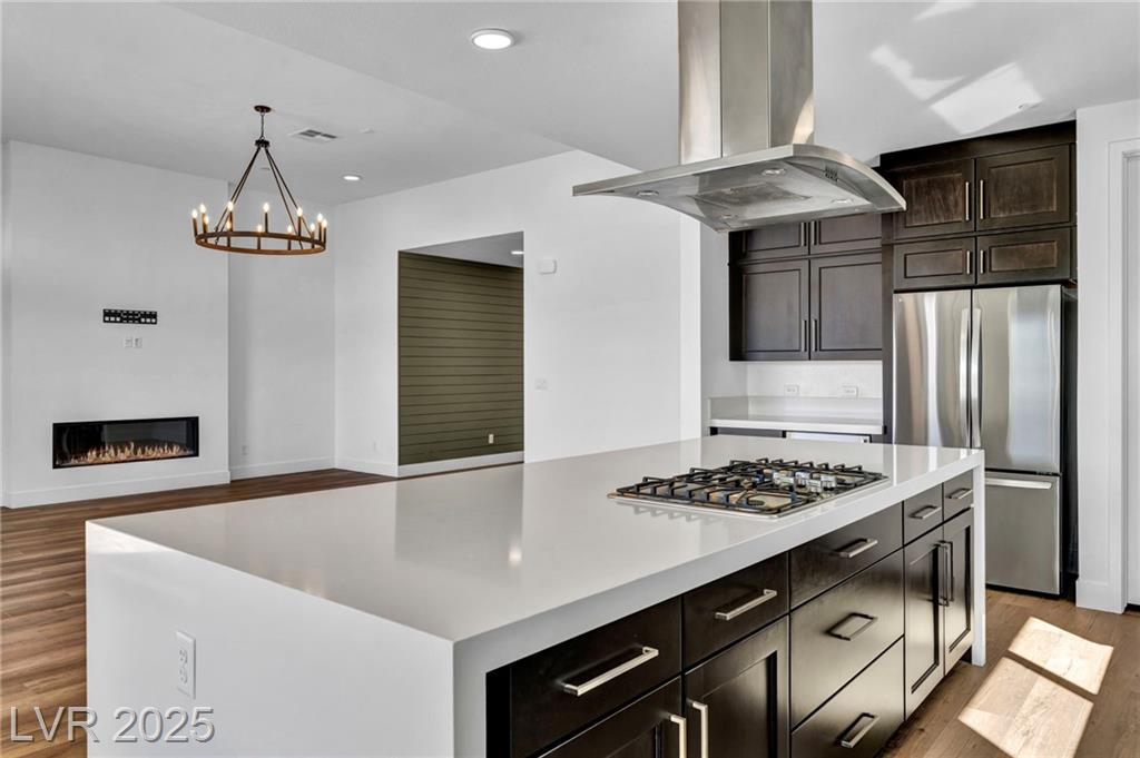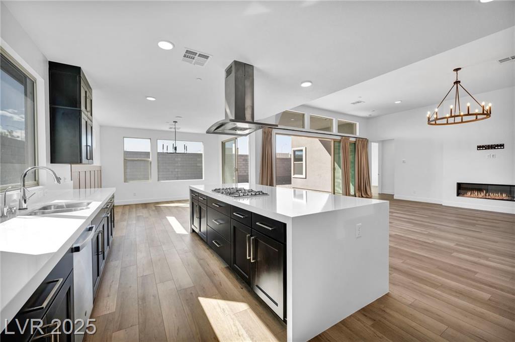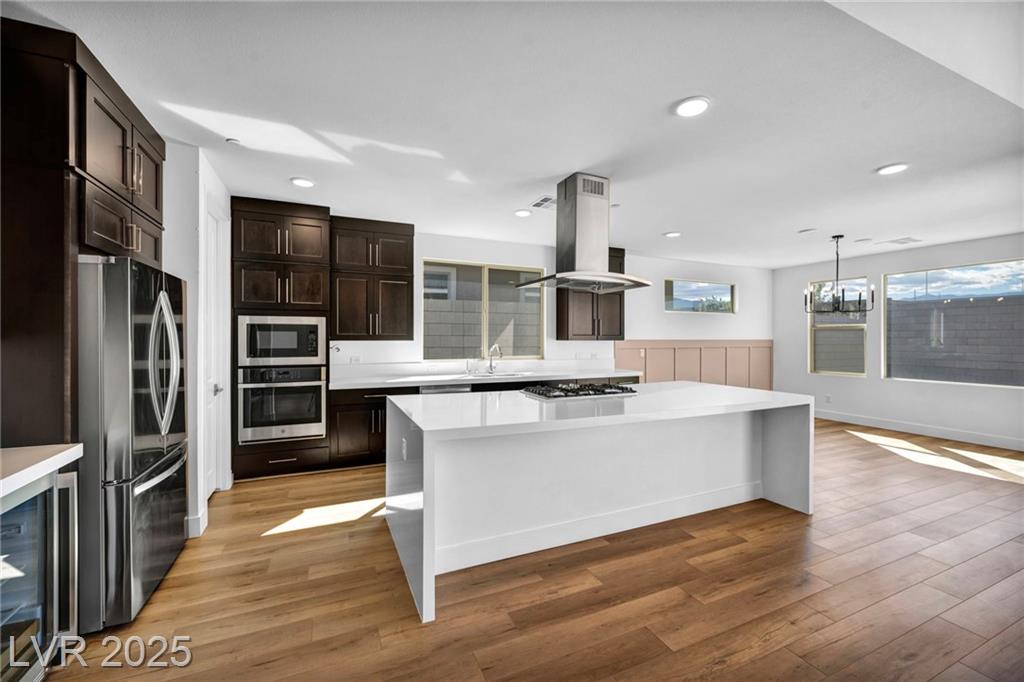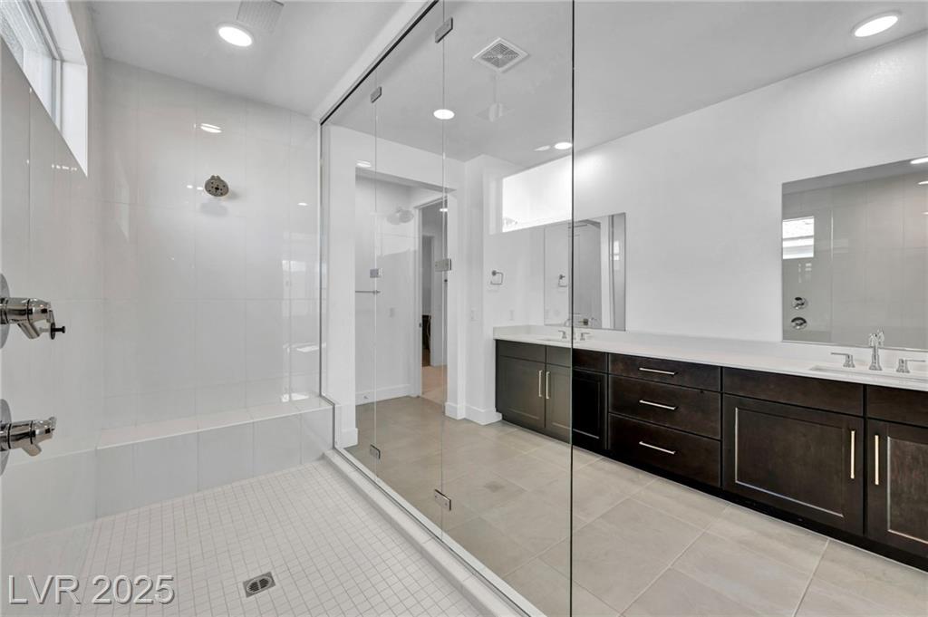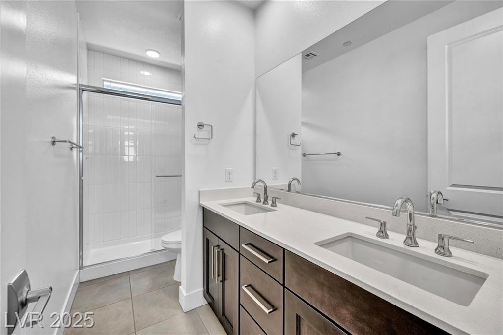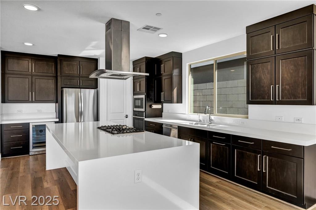 Welcome to this barely lived-in Tripointe home in the gated Alpine Ridge community at Kyle Pointe! Completed in June 2024, this largest Plan 3 model sits within a single-story community at Kyle Pointe and boasts over $126,000 in sleek modern upgrades. Enjoy 10’ ceilings, a sliding stacking door for seamless indoor/outdoor living, and a gated entry courtyard. The chef’s kitchen features double-stacked espresso cabinets, a waterfall quartz island, chef’s hood, wine fridge, and walk-in pantry. The luxurious primary suite offers vaulted ceilings, an oversized spa-style shower, and a massive walk-in closet connected to the laundry room. 3 additional bedrooms, two full baths, and a versatile den occupy a separate wing for added privacy. Additional highlights include a 3-car tandem garage with EV plug, full home water filtration system, and tankless water heater. Set on a pool-sized lot with backyard views of Mt. Charleston, just minutes from the 95 freeway! 2 parks in community.