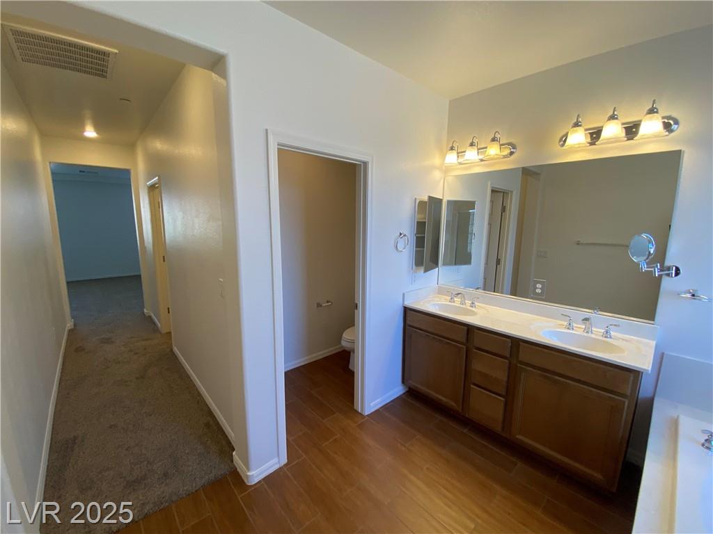 NEW paint + NEW carpet in the heart of Summerlin! This townhome is located in the center of the community, directly across the way from the community pool. Upon entering the neighborhood, you will be greeted by a huge grassy park. This unit features a downstairs patio, one bedroom/bath down, attached two car garage, and two bedrooms upstairs. The primary en suite provides a large walk in closet, dual sinks, and a separate/tub shower. Each bedroom upstairs has it's own private bath. Apply online today!