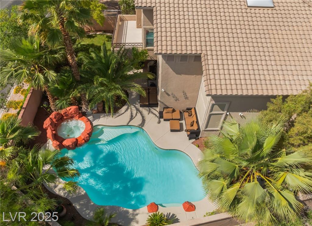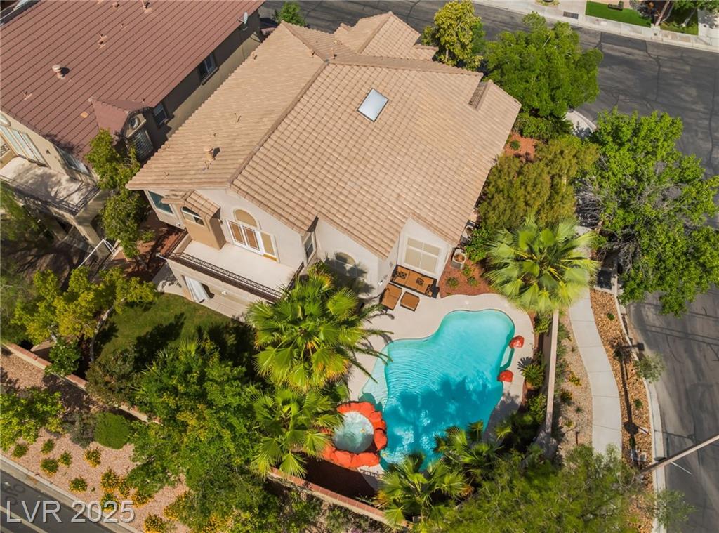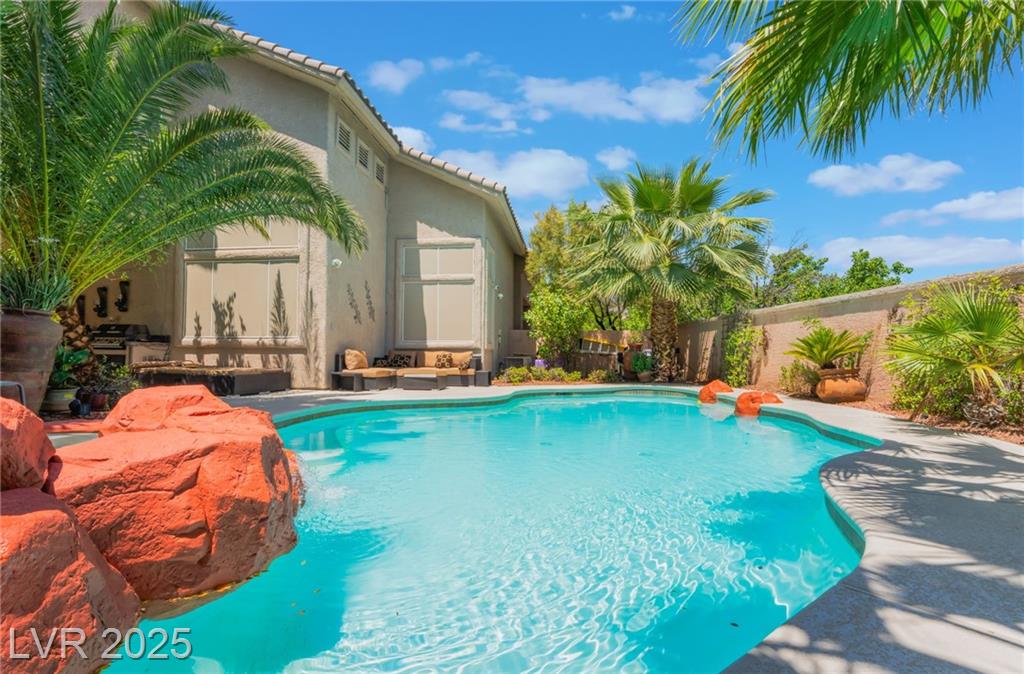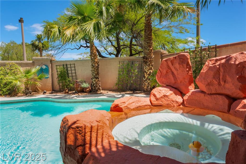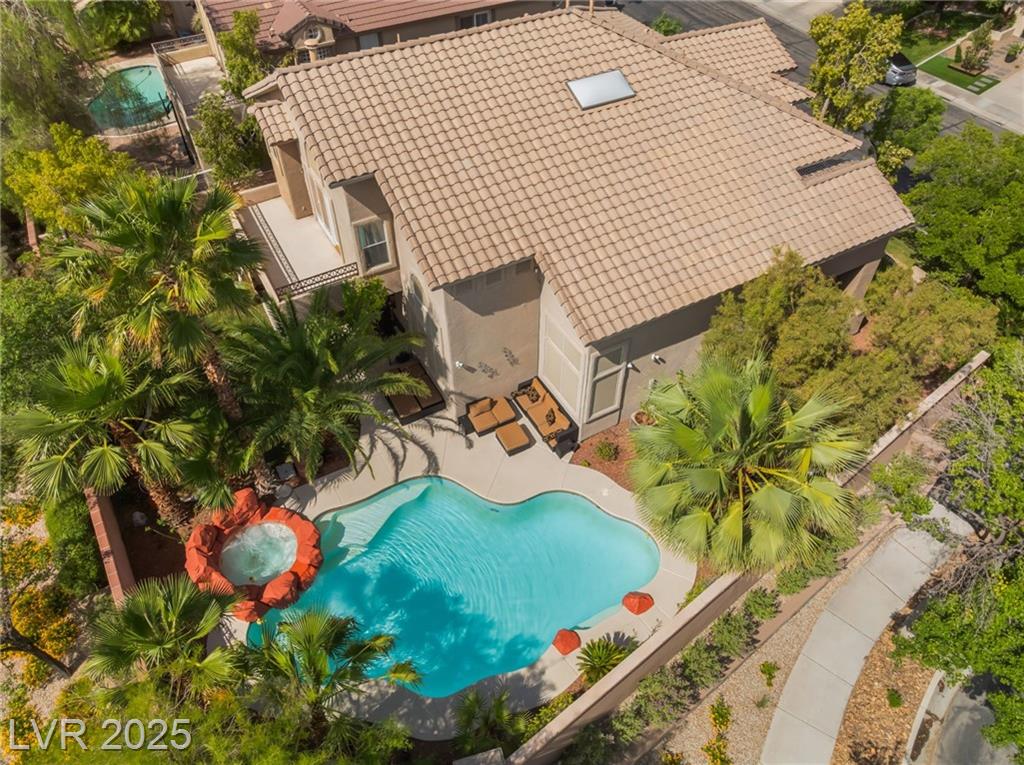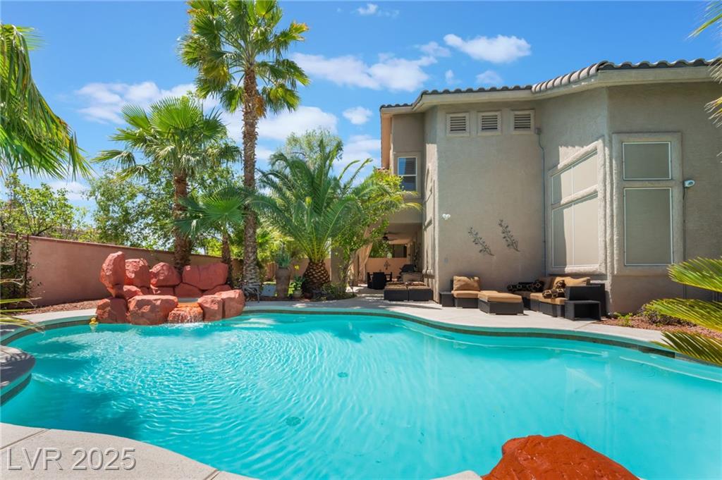 Amazing location in the upscale community of gated Canyon Oaks in Summerlin! This luxurious 3200 sq ft home has 5 bed, 3 baths and a large office space. Step inside to grand cathedral ceilings in the formal living & dining rooms, dual entry staircase w/1 bed & bath d/s. D/s features porcelain tile, upstairs is engineered dark wood, fresh interior paint, spacious family rm w/built in media ctr w/fireplace. Gourmet kitchen features granite counters, island, bfast area, & ample cabinets. Office w/hardwood floor has custom built-ins. Outside is your private backyard oasis w/sparkling pool, spa, lush tropical mature landscaping, grill w/mini fridge, & covered patio w/cabana curtains. Retreat upstairs to your luxurious primary suite, spacious balcony w/scenic mountain views, fireplace, & his/hers walk-in closets. En-suite bath w/travertine flooring, soaking tub, shower & vanity. 3-car garage w/epoxy flooring & built in cabinetry. Freshly painted driveway & pool deck.