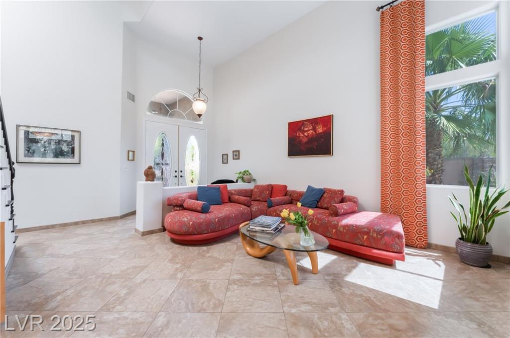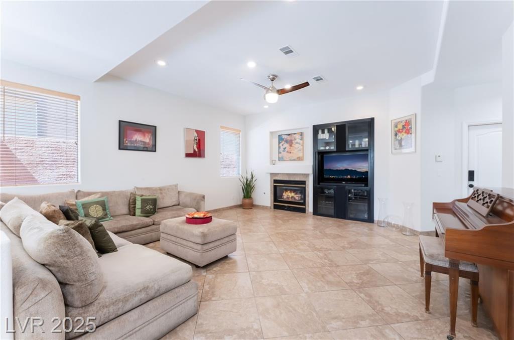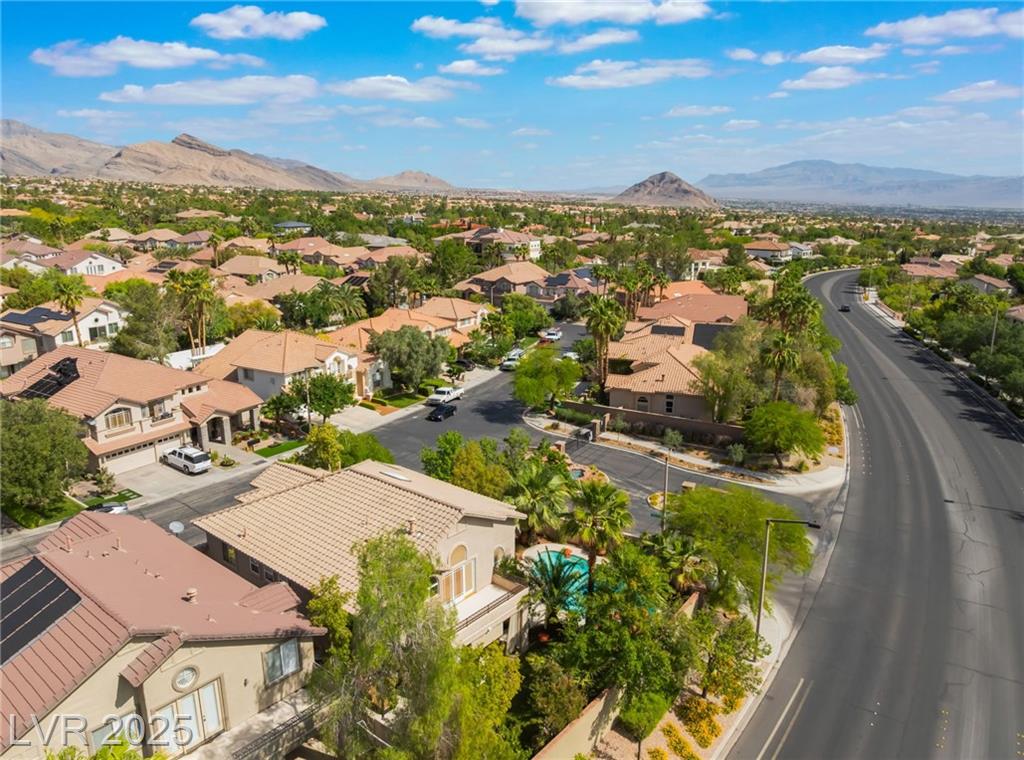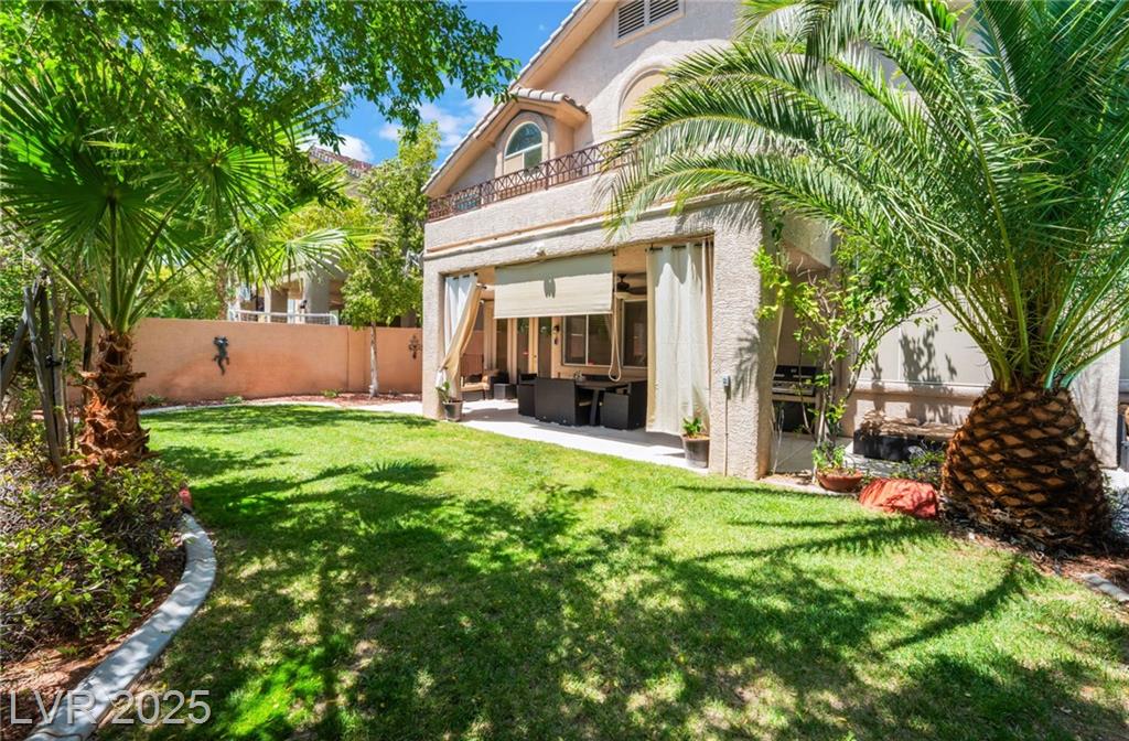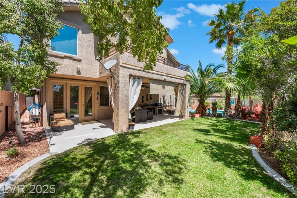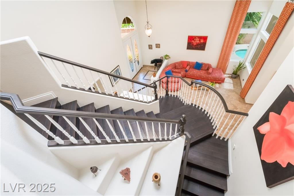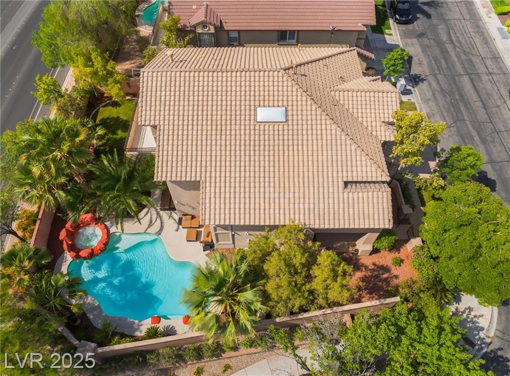 Amazing location in the upscale community of gated Canyon Oaks in Summerlin! This luxurious 3200 sq ft home has 5 bed, 3 baths and a large office space. Step inside to grand cathedral ceilings in the formal living & dining rooms, dual entry staircase w/1 bed & bath d/s. D/s features porcelain tile, upstairs is engineered dark wood, fresh interior paint, spacious family rm w/built in media ctr w/fireplace. Gourmet kitchen features granite counters, island, bfast area, & ample cabinets. Office w/hardwood floor has custom built-ins. Outside is your private backyard oasis w/sparkling pool, spa, lush tropical mature landscaping, grill w/mini fridge, & covered patio w/cabana curtains. Retreat upstairs to your luxurious primary suite, spacious balcony w/scenic mountain views, fireplace, & his/hers walk-in closets. En-suite bath w/travertine flooring, soaking tub, shower & vanity. 3-car garage w/epoxy flooring & built in cabinetry. Freshly painted driveway & pool deck.
