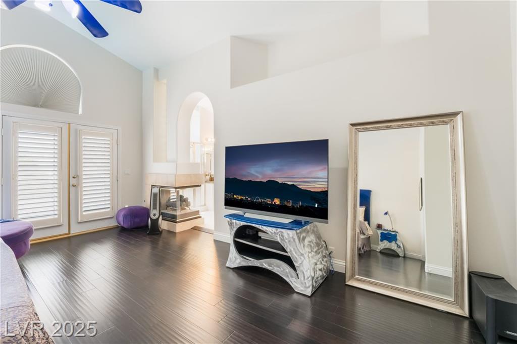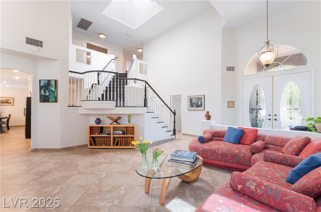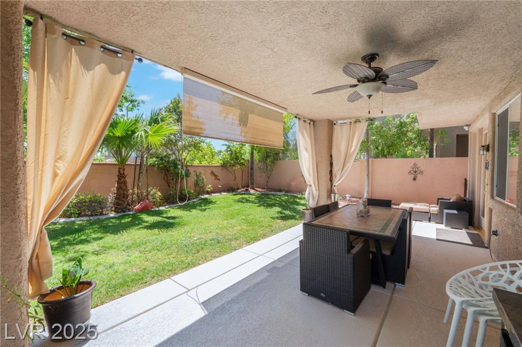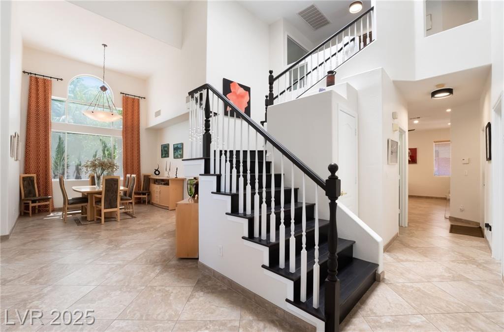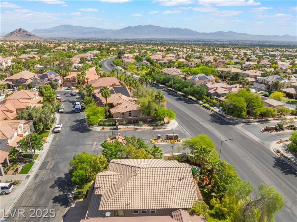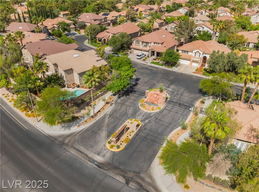 Amazing location in the upscale community of gated Canyon Oaks in Summerlin! This luxurious 3200 sq ft home has 5 bed, 3 baths and a large office space. Step inside to grand cathedral ceilings in the formal living & dining rooms, dual entry staircase w/1 bed & bath d/s. D/s features porcelain tile, upstairs is engineered dark wood, fresh interior paint, spacious family rm w/built in media ctr w/fireplace. Gourmet kitchen features granite counters, island, bfast area, & ample cabinets. Office w/hardwood floor has custom built-ins. Outside is your private backyard oasis w/sparkling pool, spa, lush tropical mature landscaping, grill w/mini fridge, & covered patio w/cabana curtains. Retreat upstairs to your luxurious primary suite, spacious balcony w/scenic mountain views, fireplace, & his/hers walk-in closets. En-suite bath w/travertine flooring, soaking tub, shower & vanity. 3-car garage w/epoxy flooring & built in cabinetry. Freshly painted driveway & pool deck.