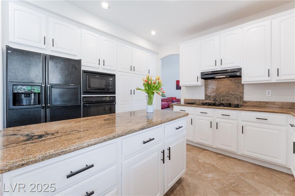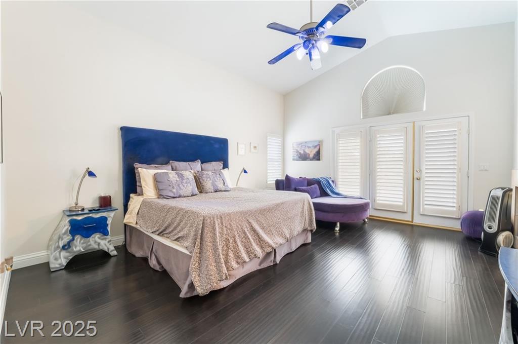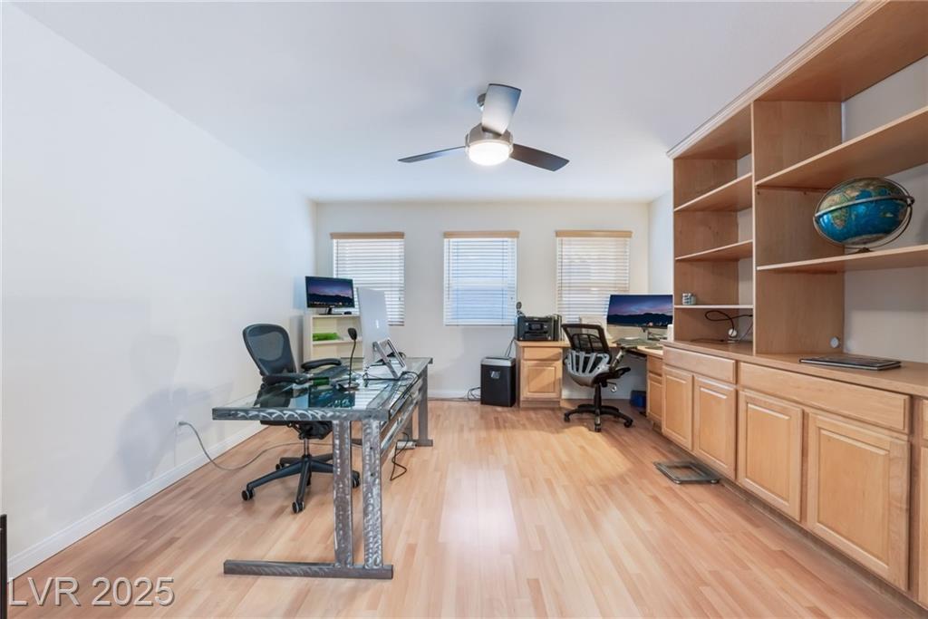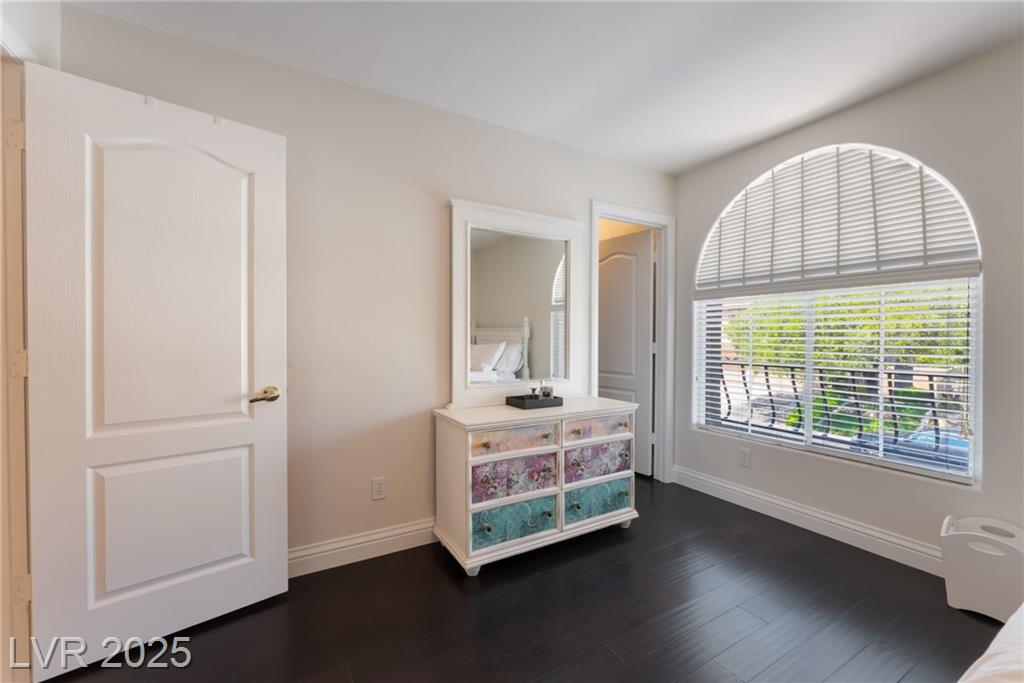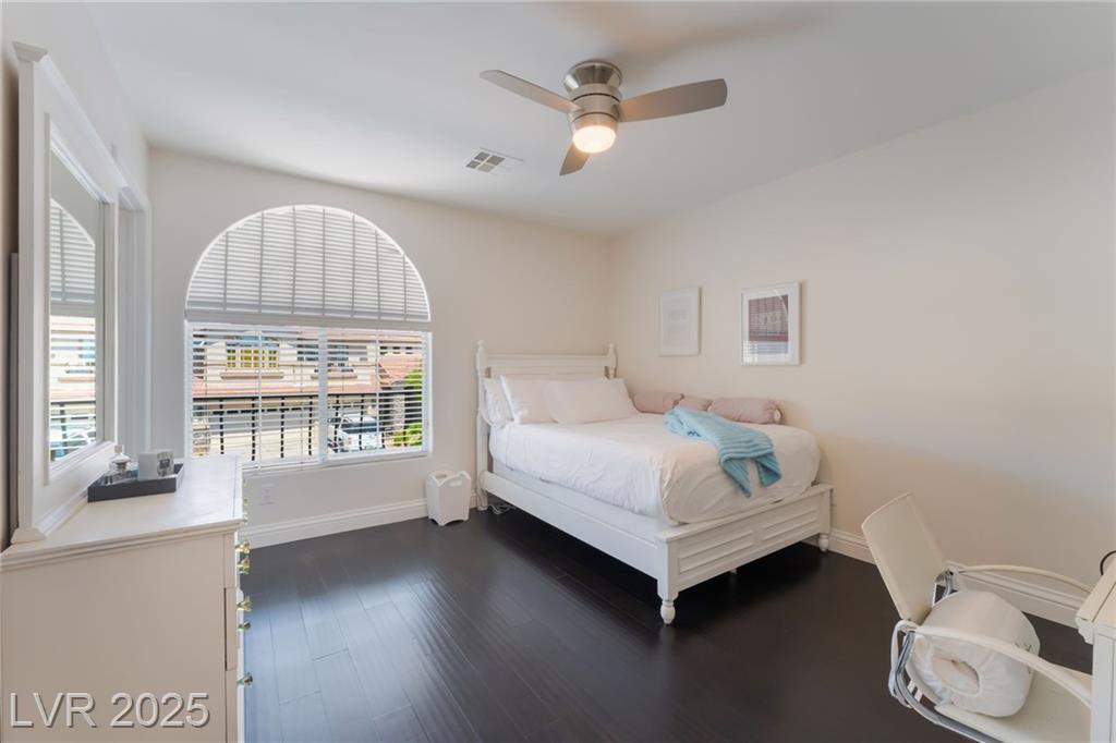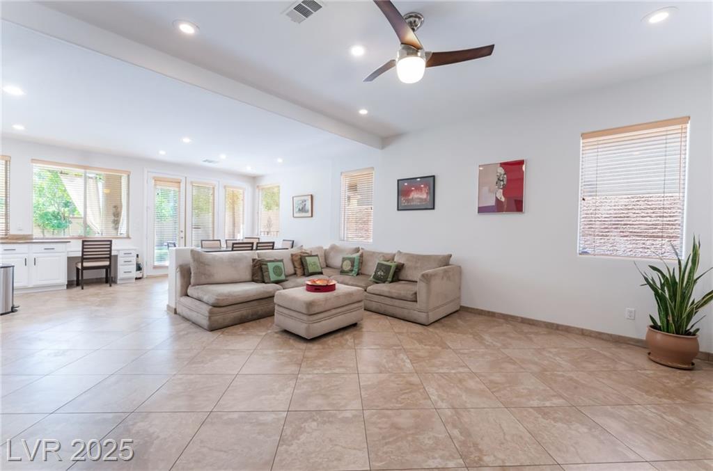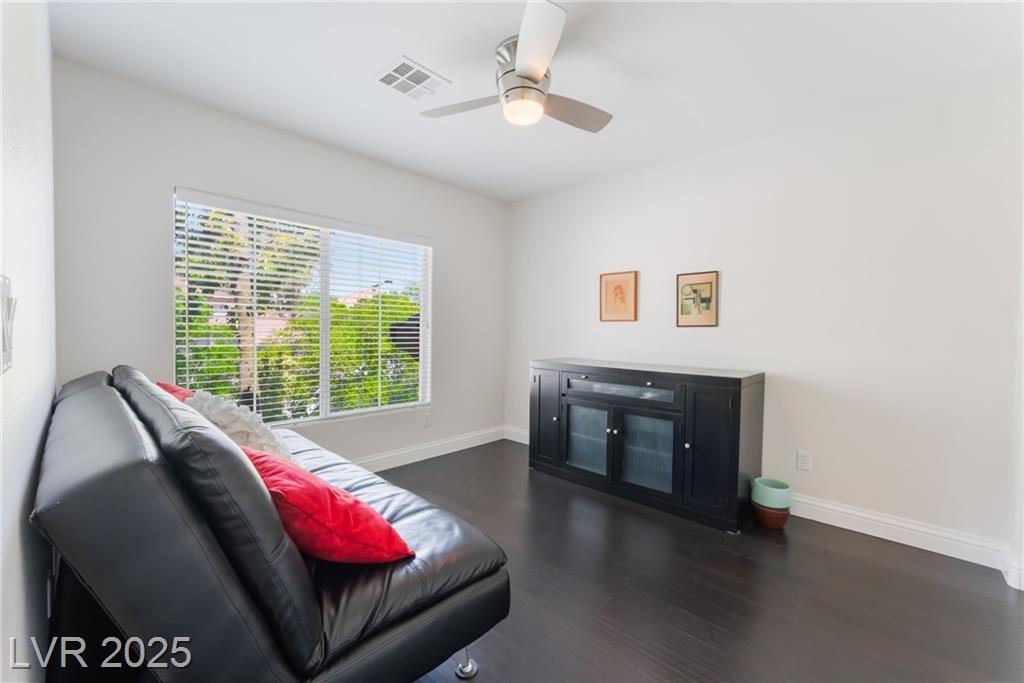 Amazing location in the upscale community of gated Canyon Oaks in Summerlin! This luxurious 3200 sq ft home has 5 bed, 3 baths and a large office space. Step inside to grand cathedral ceilings in the formal living & dining rooms, dual entry staircase w/1 bed & bath d/s. D/s features porcelain tile, upstairs is engineered dark wood, fresh interior paint, spacious family rm w/built in media ctr w/fireplace. Gourmet kitchen features granite counters, island, bfast area, & ample cabinets. Office w/hardwood floor has custom built-ins. Outside is your private backyard oasis w/sparkling pool, spa, lush tropical mature landscaping, grill w/mini fridge, & covered patio w/cabana curtains. Retreat upstairs to your luxurious primary suite, spacious balcony w/scenic mountain views, fireplace, & his/hers walk-in closets. En-suite bath w/travertine flooring, soaking tub, shower & vanity. 3-car garage w/epoxy flooring & built in cabinetry. Freshly painted driveway & pool deck.