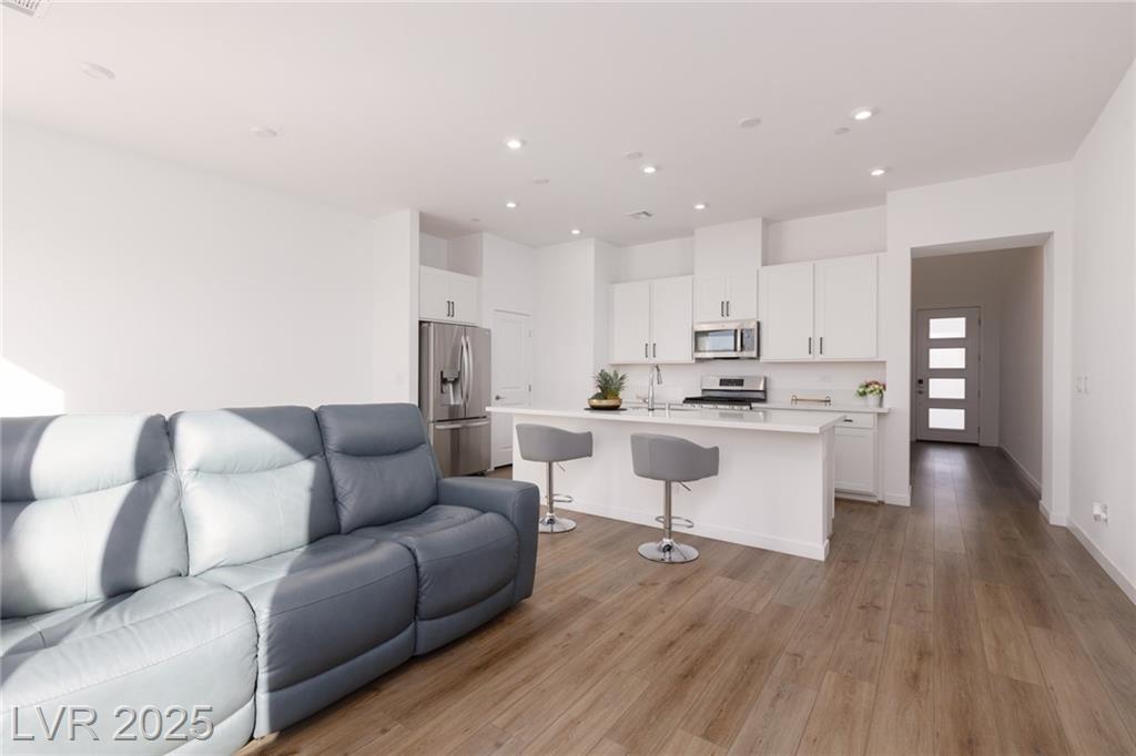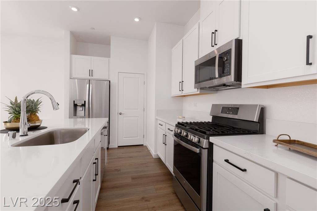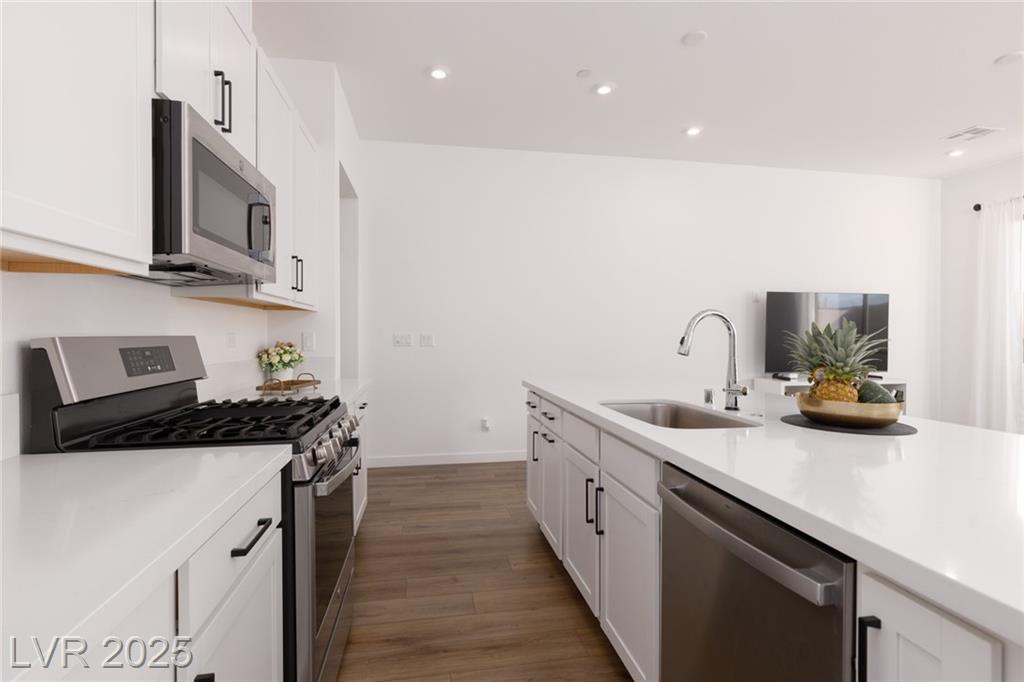 Discover the perfect blend of style and convenience in this stunning NEW two-story townhome in Southridge Point. Why WAIT to build when you can have this completed masterpiece. Featuring dual master suites and large loft, this home offers space and versatility for modern living. The dramatic entry foyer welcomes you into an open floor plan, where the kitchen shines with an oversized island perfect for morning coffee or culinary adventures. The living and dining areas flow seamlessly, with sliders opening to a private backyard ideal for outdoor dining. Upstairs, the spacious loft adapts to your needs—whether as a home office, workout space, or optional third bedroom. Thoughtful touches include luxury vinyl plank flooring on the main level, and a finished garage with epoxy flooring and a tankless water heater. Enjoy the community pool and pet park, all just 2 minutes from I-15, SouthPoint Casino, and endless shopping and dining options. This home comes fully equipped with all appliances!