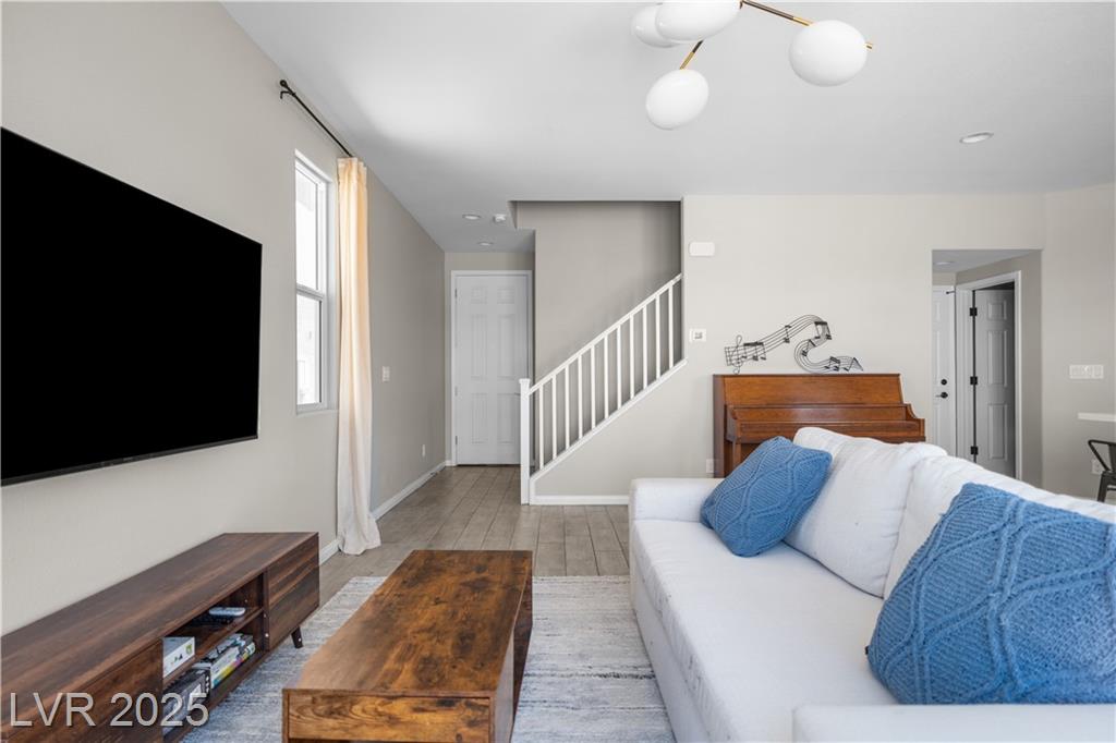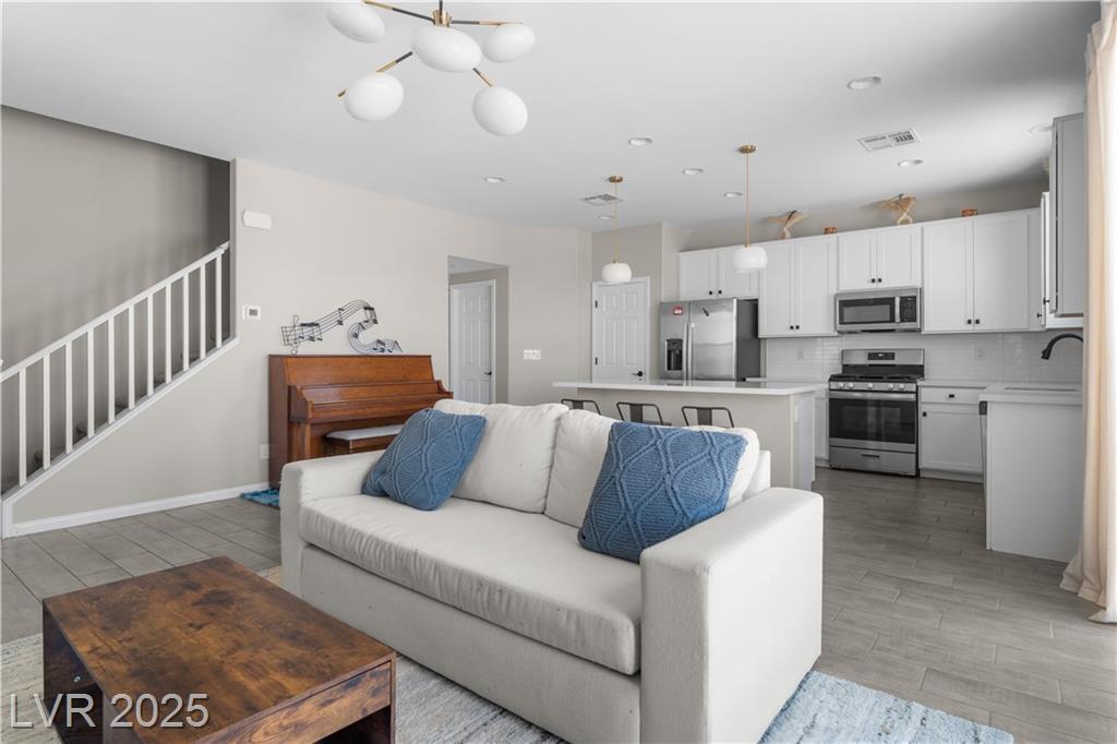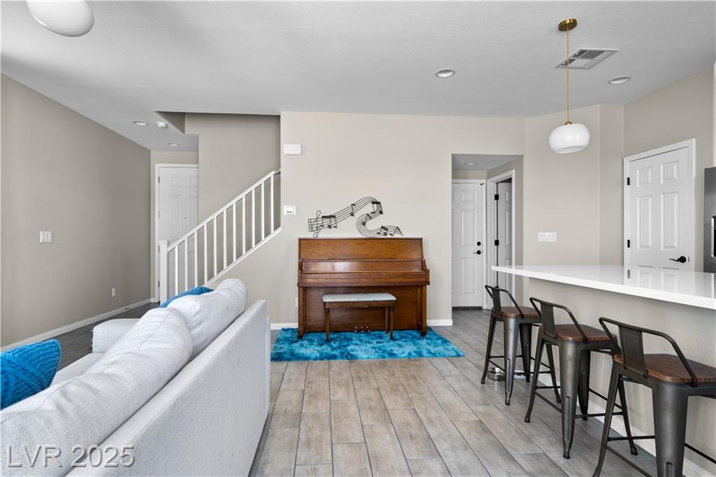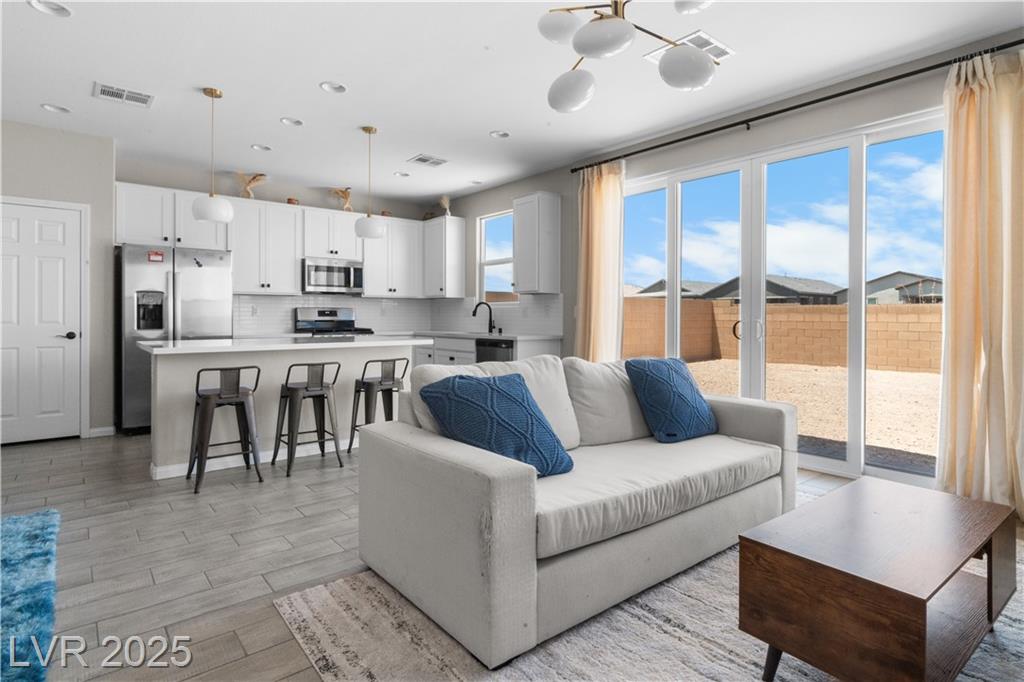 Home has paver driveway and covered front porch. Enter home to entryway which leads to the living room. Living room has a light fixture and center meeting sliding patio doors. Living room opens to kitchen. Kitchen has quartz countertops, island with breakfast bar, 42" upper cabinets, stainless steel appliances (fridge, stove, dishwasher), tile backsplash, and pantry. Downstairs has a powder bathroom. The stairs have mission style stair rails. Go upstairs for primary bedroom, primary bathroom, guest bathroom, and laundry closet. Primary bedroom is separate from guest bedrooms. Primary bathroom has a walk-in closet, shower with tile enclosure, and dual vanity with quartz countertop and combination shower and tub. One of the guest bedrooms has a walk-in closet. Laundry closet has a washer and dryer. Garage has a soft water loop. Backyard has a BBQ stub and rock landscaping.