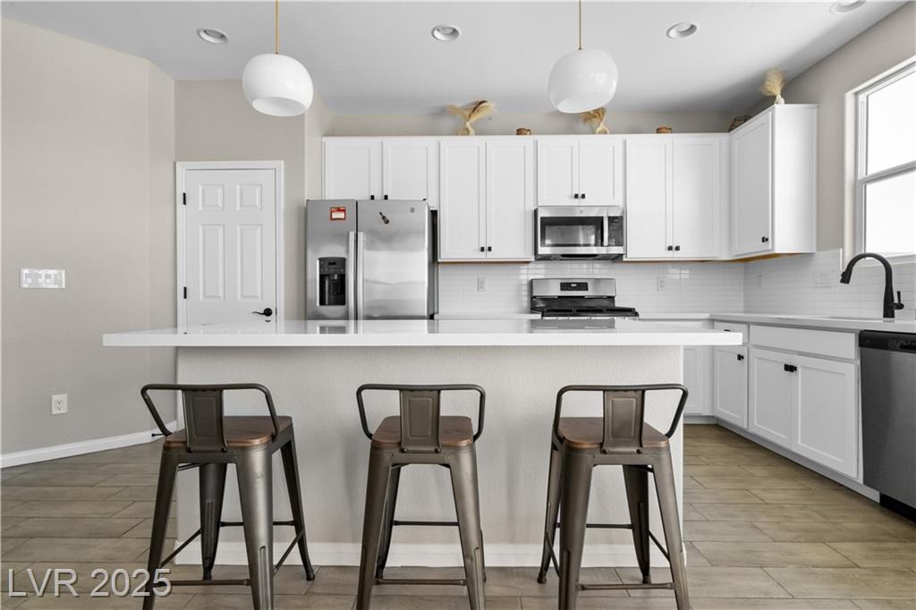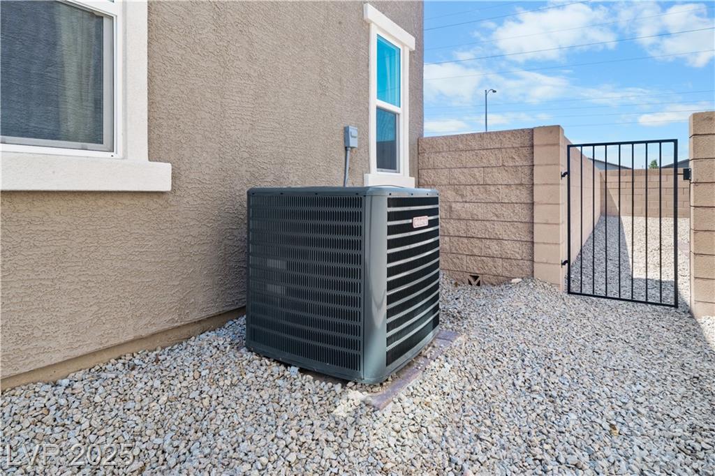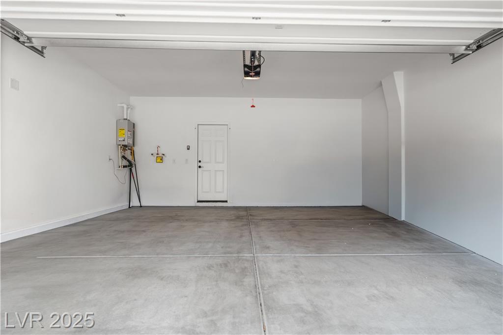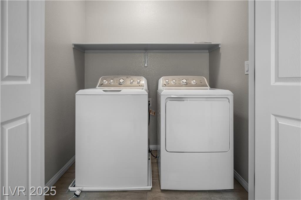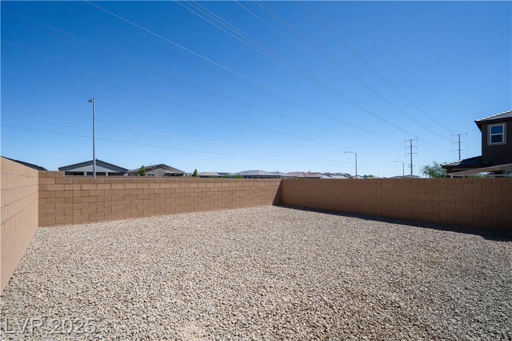 Home has paver driveway and covered front porch. Enter home to entryway which leads to the living room. Living room has a light fixture and center meeting sliding patio doors. Living room opens to kitchen. Kitchen has quartz countertops, island with breakfast bar, 42" upper cabinets, stainless steel appliances (fridge, stove, dishwasher), tile backsplash, and pantry. Downstairs has a powder bathroom. The stairs have mission style stair rails. Go upstairs for primary bedroom, primary bathroom, guest bathroom, and laundry closet. Primary bedroom is separate from guest bedrooms. Primary bathroom has a walk-in closet, shower with tile enclosure, and dual vanity with quartz countertop and combination shower and tub. One of the guest bedrooms has a walk-in closet. Laundry closet has a washer and dryer. Garage has a soft water loop. Backyard has a BBQ stub and rock landscaping.