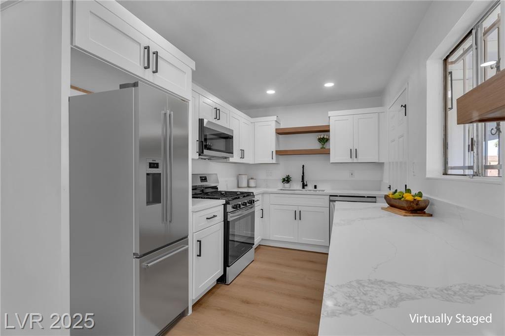 This stunning single-story residence offers 4 spacious bedrooms and 2 full bathrooms, perfectly blending style, comfort, and convenience. Step into an open-concept layout featuring custom luxury vinyl plank flooring and elegant designer paint throughout. The oversized family room welcomes you with a cozy fireplace and charming wood beam accents—ideal for relaxing or entertaining. The chef’s kitchen is a true highlight, showcasing stainless steel appliances, Level 3 polished quartz countertops, and 42" flat-panel shaker cabinets for a sleek, modern finish. The expansive primary suite offers a spa-like retreat, while three additional bedrooms provide flexibility for guests, a home office, or creative space. The private backyard is perfect for hosting gatherings or enjoying quiet moments outdoors. This move-in ready home checks every box! Schedule your showing today and make it yours!