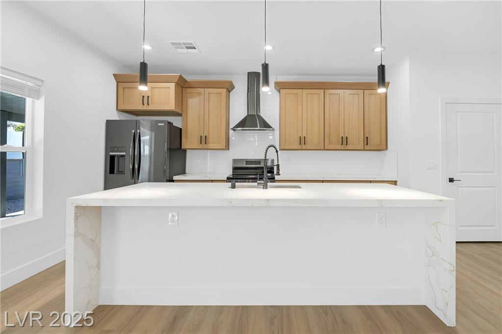 Brand New Home. 2025. Never lived-in. No HOA. This single story home features 4 ample size bedrooms, 2 bathrooms, and a 2 car garage. Some of the upgrades selected are kitchen with 42' tall cabinetry with dramatic crown moldings, all black stainless steel appliances, calacatta gold quartz countertops with island and waterfall edges, pendant lights, and full tiled backsplash. Luxury Vinyl Plank flooring throughout, ceiling fans in every bedroom and main living area, all blinds included, laundry room with washer and dryer are also included. Backyard with extended and oversized patio cover. Garage has epoxy flooring, and garage door opener. A turn key home. Ready to spend holidays in your brand new home? Call to schedule a showing.