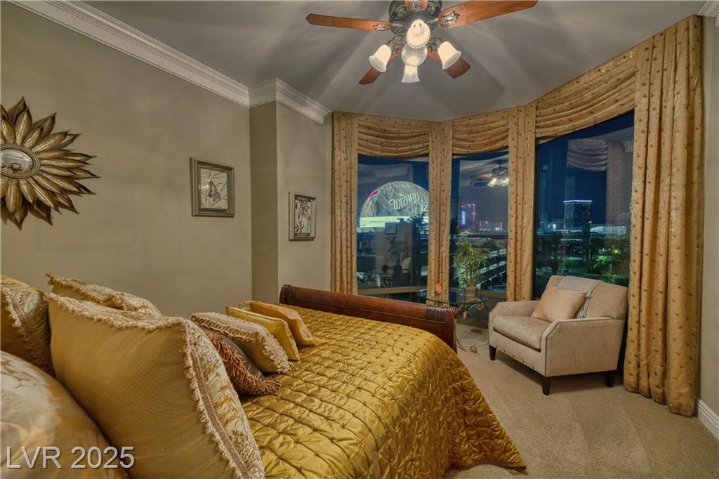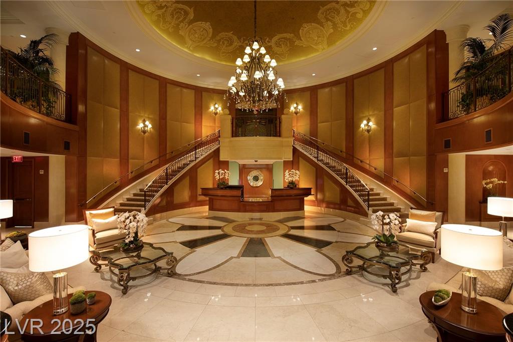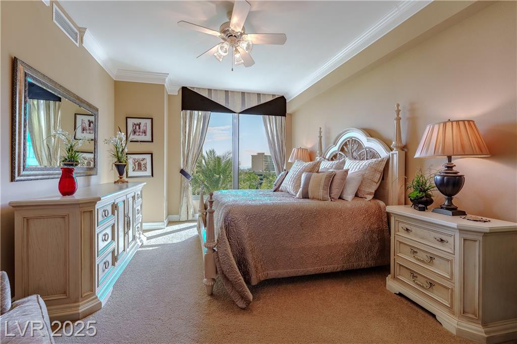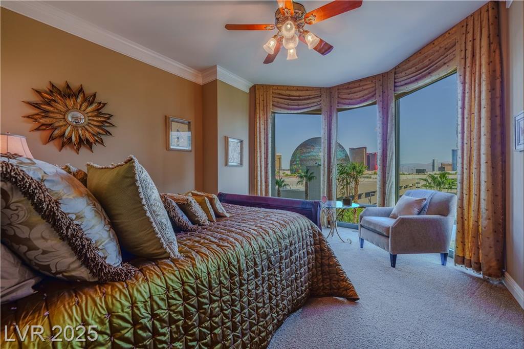 Elegant 3 bedroom 3.5 bath, Park Towers 4th floor unit w/ Sphere & Strip views. Grand Foyer w/Inlaid Mosaic marble floors, Great room features floor to ceiling windows w/remote shades Crestron system, access to terrace. Island kitchen absolute granite,GE Monogram appliances. Gas 6 burner cooktop w/griddle. Sub Zero wine fridge, 2 ovens. Access to terrace. Primary bedroom features a terrace w/Sphere view, fan, LG organized w-in closet, jetted tub, sep shower, bidet, all marble baths. 2nd & 3rd bedroom have fans & own baths. LG laundry room w/sink. Guest bath, neutral decor. Will sell furnished some exclusions. amenities include theatre rm/card rm/wine cellar/billard rm/fitness and spa center/ pool/spa/cabanas, BBQ area, tennis, business center