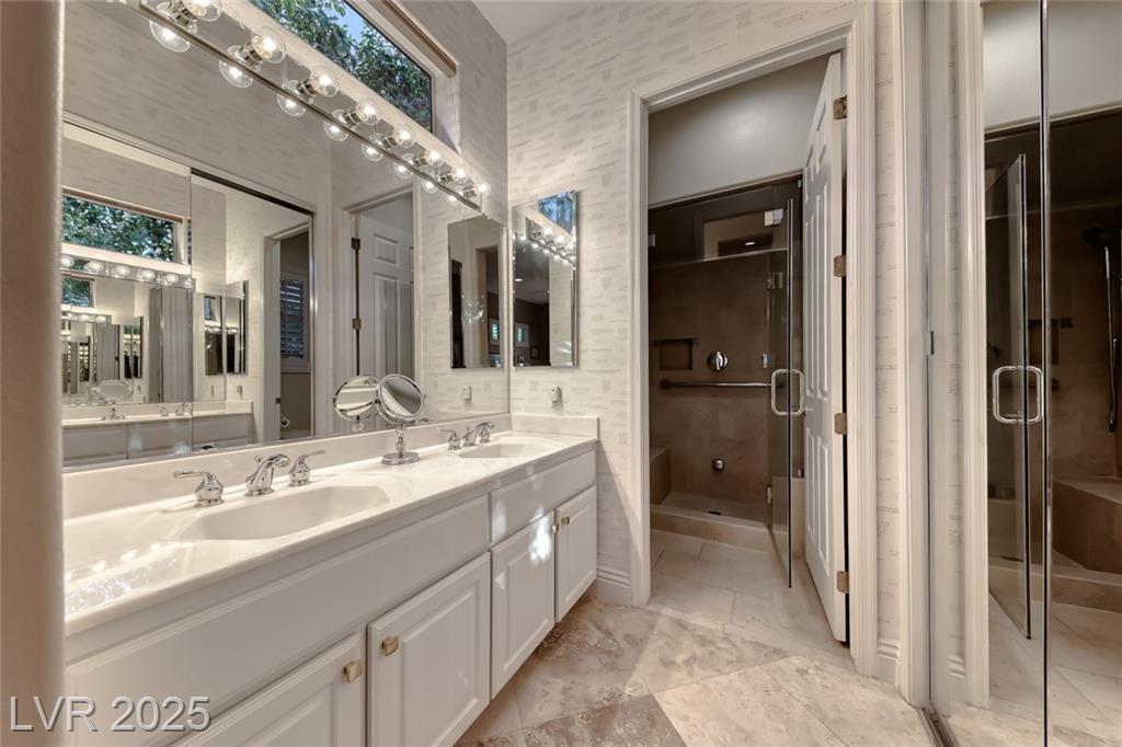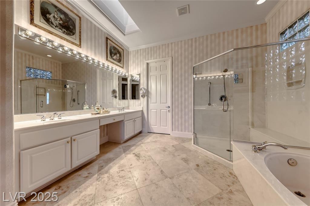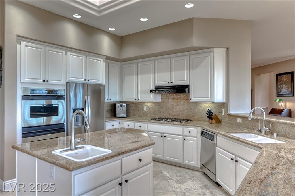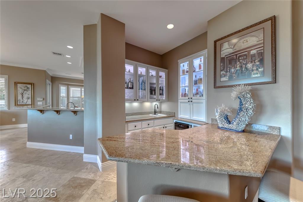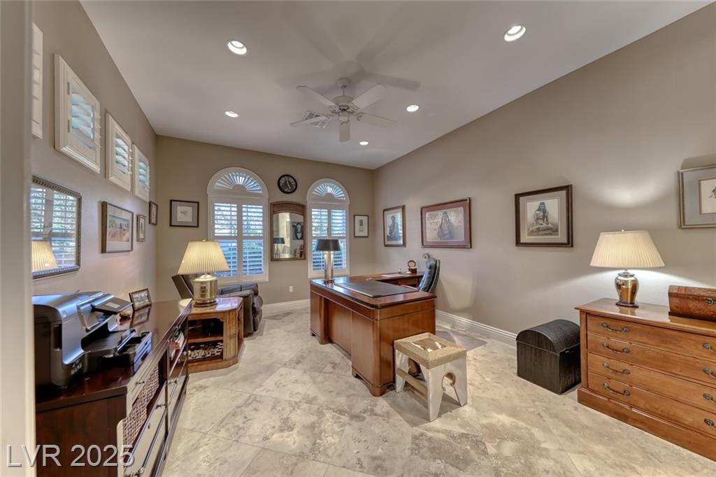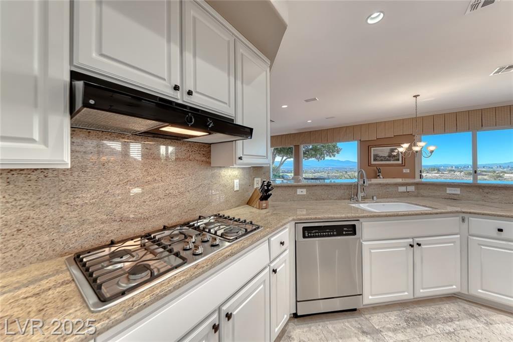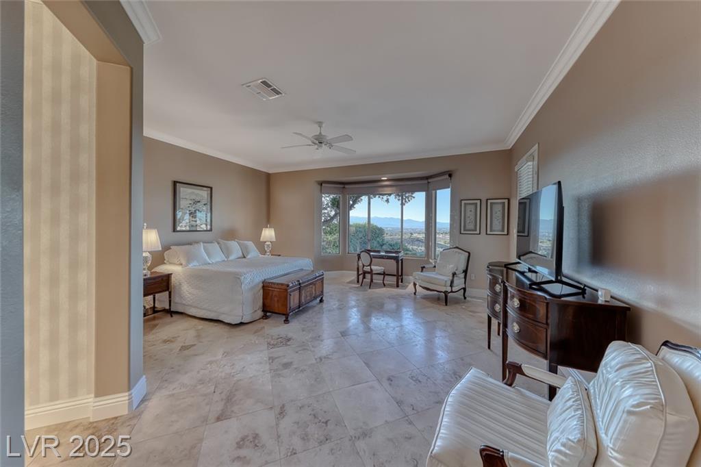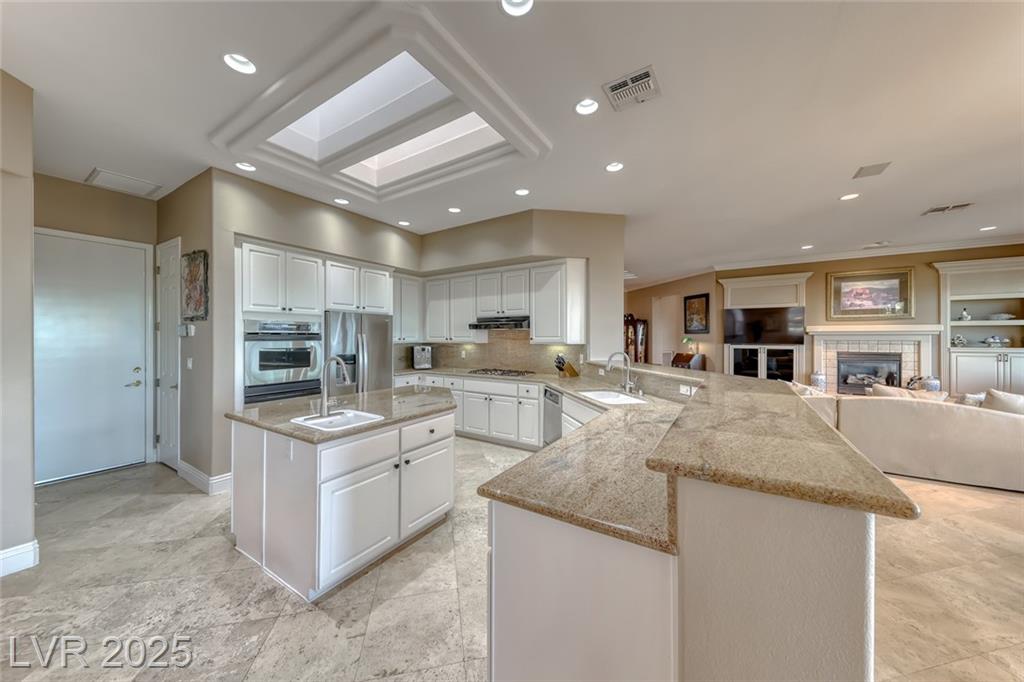 Unparalleled luxury with the best views Sun City Anthem has to offer. This highly upgraded Concord model offers unmatched panoramic views of the entire Las Vegas Strip, Golf Course, and Mountains. Exceptional curb appeal with custom iron gates & professional landscaping set the stage. Inside, travertine flooring, plantation shutters, and skylights enhance the bright, open layout. The gourmet kitchen features granite countertops, stainless appliances, and large breakfast bar. Enjoy a wet bar, cozy fireplace, and elegant finishes. The spacious primary suite has a bay window with valley views, TOTO toilet, and luxury bath. Guest suite includes dual sinks & custom steam shower. Step into your private backyard oasis with outdoor kitchen, BBQ, Traeger smoker, granite counters, and inground spa all showcasing million-dollar views. Fully fenced for privacy & pets. Prime location in Model Village just steps to the main clubhouse. This is true resort-style living at its finest!