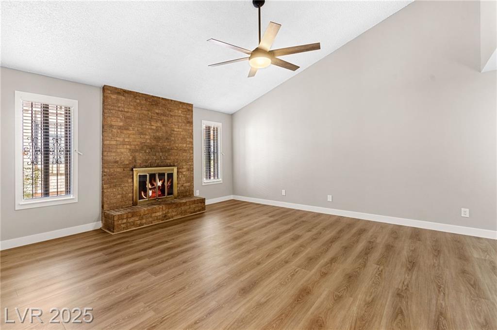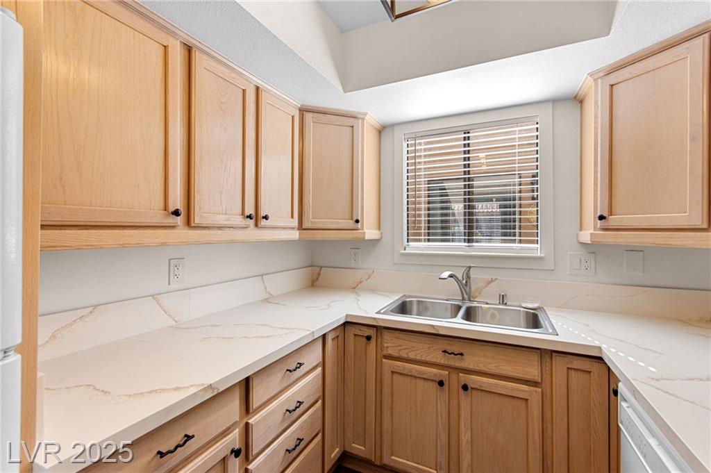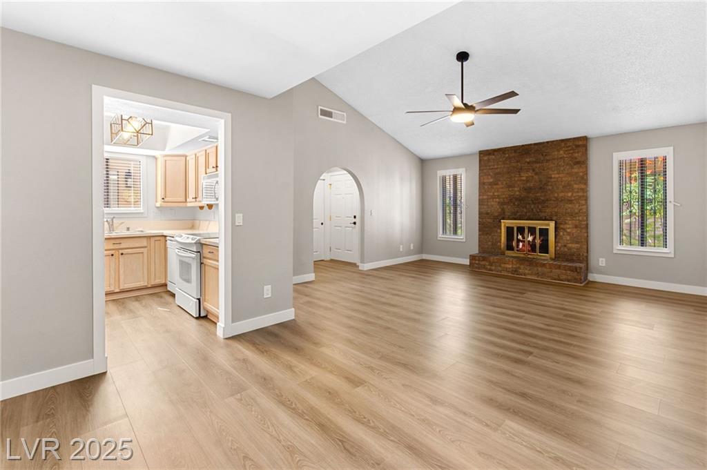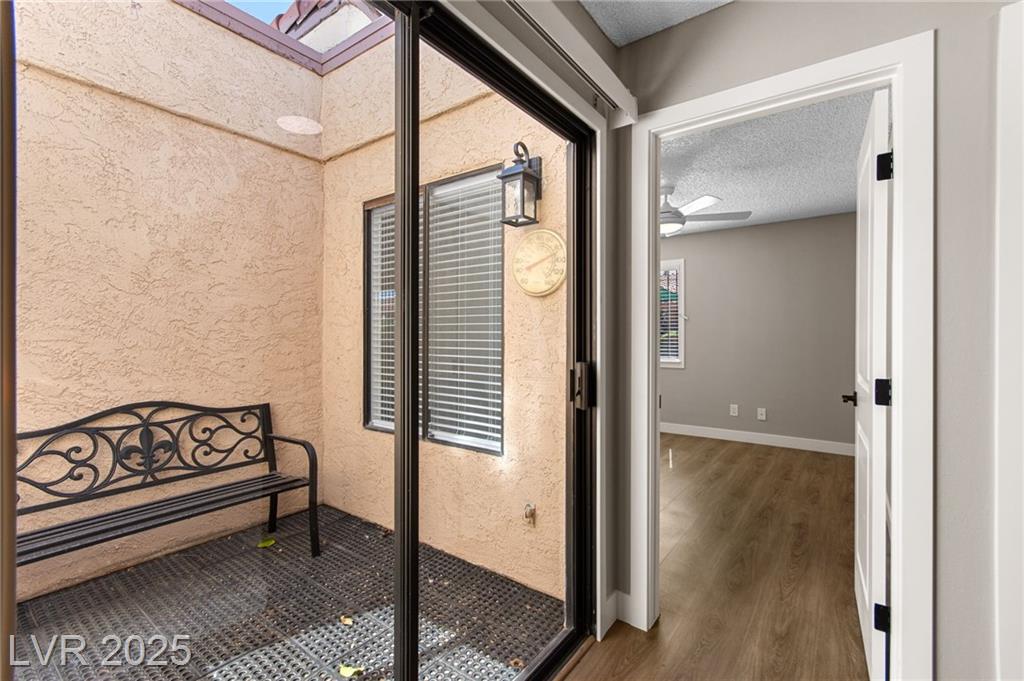 Charming one-story townhome with 2 bedrooms, 2 baths, and a versatile den that can function as an office or a third bedroom (door included, no closet). Enjoy an attached 2-car garage and a cozy enclosed atrium/patio. The primary suite has a private entry, and the open living area features vaulted ceilings and a striking stone fireplace. Thoughtful upgrades throughout include luxury vinyl plank flooring, quartz countertops, and ceiling fans. Residents enjoy access to a community pool and tennis courts. Conveniently located just minutes from the Strip, Airport, and UNLV.