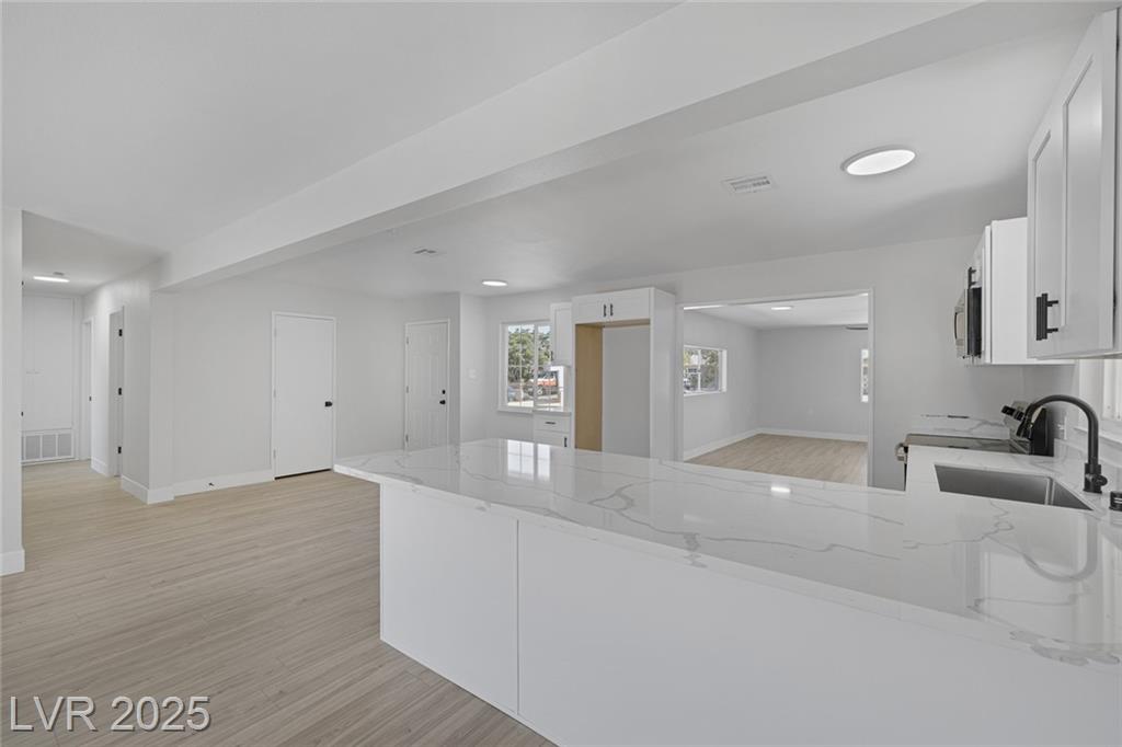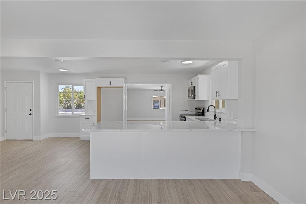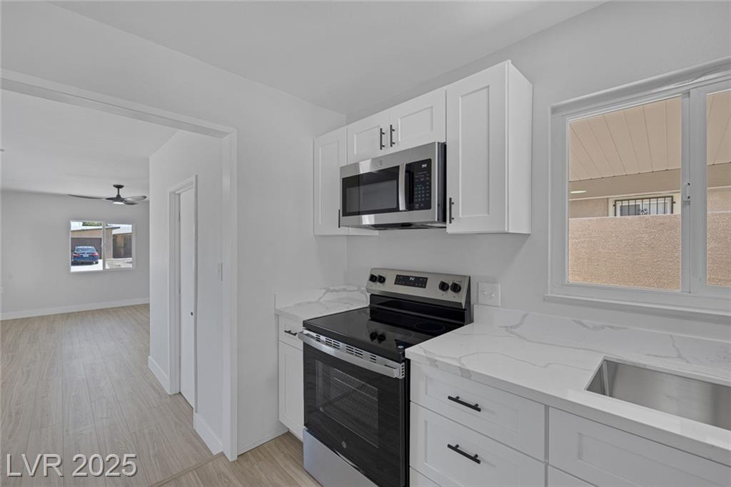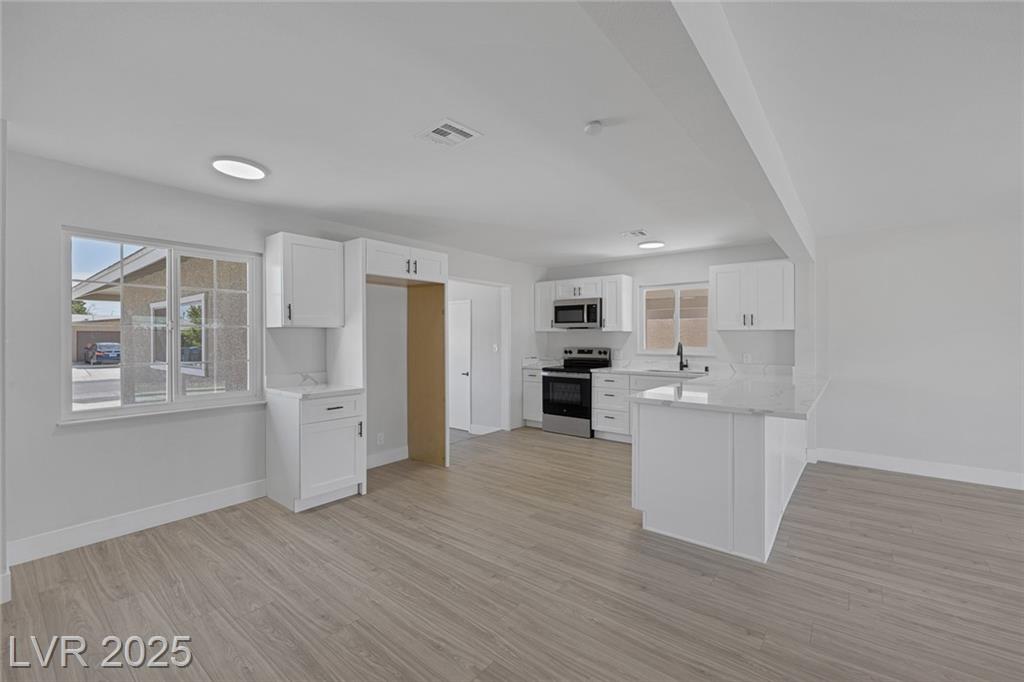 This exceptional single-story home in Las Vegas offers a perfect blend of comfort and style. The front yard has great curb appeal with desert landscaping and mature palm trees. Interior features an open floor plan with NEW luxury vinyl flooring that adds both beauty and durability. Kitchen with NEW shaker cabinets, NEW quartz countertops, and NEW stainless steel appliances that provide a sleek and functional space for cooking and entertaining! The home features a spacious garage conversion, perfect for a home office, playroom, or entertainment area. Both the primary and secondary bedrooms are generously sized, ensuring ample space for relaxation. With new windows enhancing natural light and energy efficiency, along with freshly painted interiors and exteriors, this home is truly move-in ready. Whether you’re enjoying the serene outdoor space or the beautifully designed interior, this property is a perfect retreat in the heart of Las Vegas. Don’t miss your chance to make it your own!