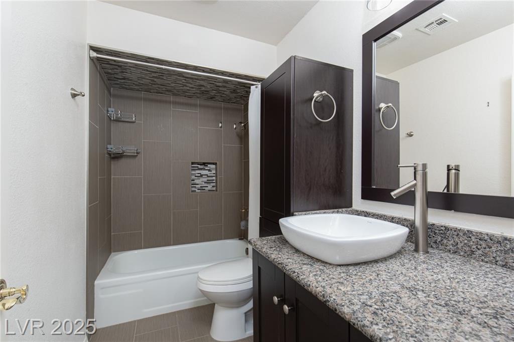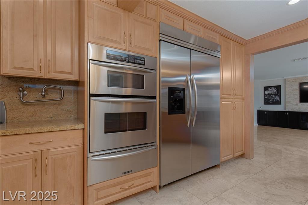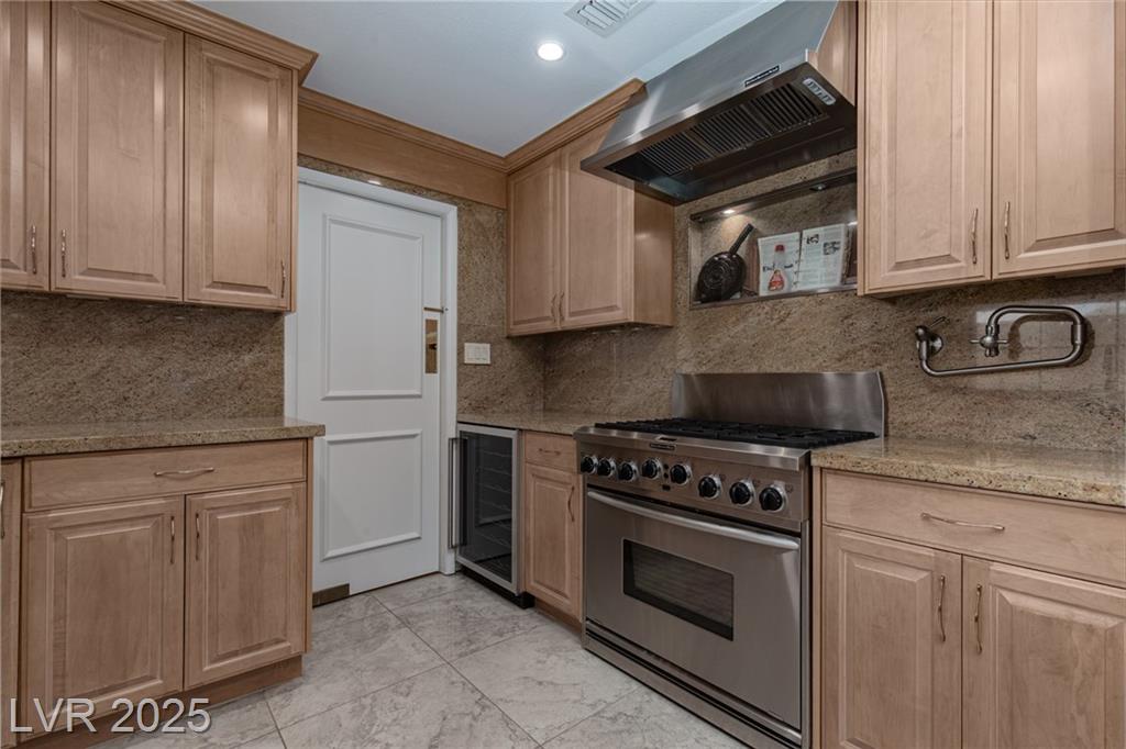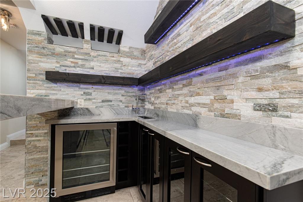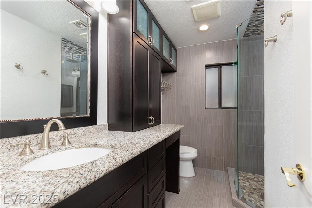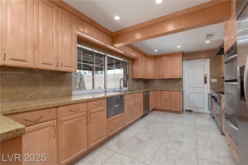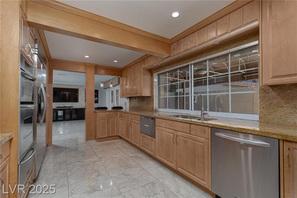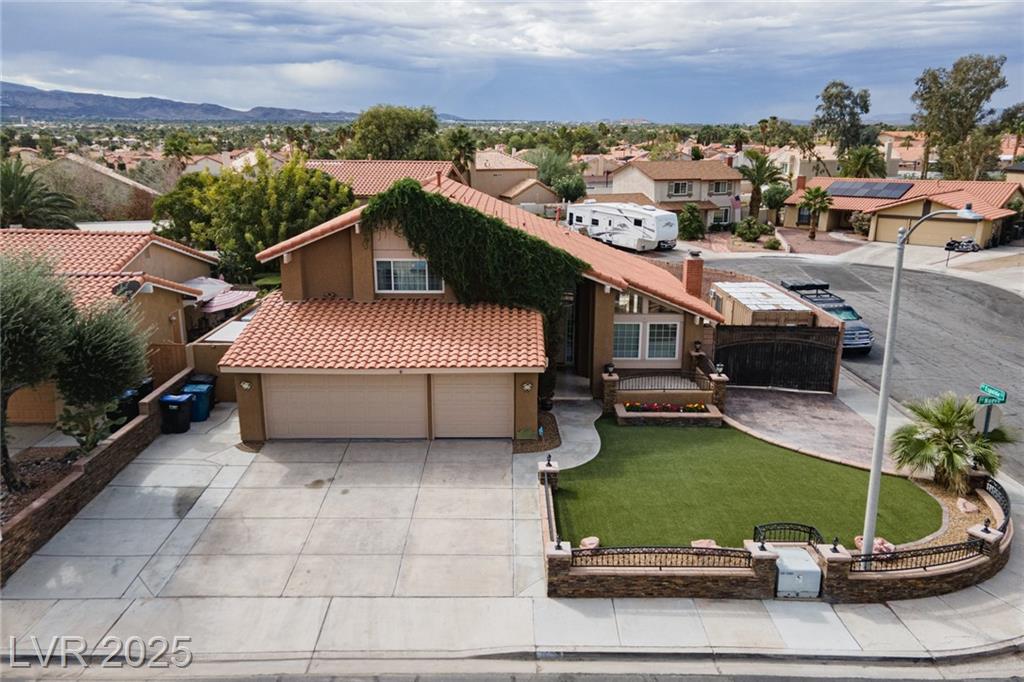 *NO HOA Immaculate 5-bed, 3-bath Henderson home on a corner lot with 3-car garage, 5-car off-street parking, and full RV/boat parking with 50-amp & 30-amp hookups*Resort-style backyard features a heated pool with wet deck, fire pit, built-in BBQ, misters, patio heater, outdoor TV, and no-maintenance landscaping*Inside, enjoy a custom kitchen with KitchenAid appliances—6-burner gas stove, wall oven with warming drawer, convection microwave, oversized fridge, 2 dishwashers, pot filler, granite counters & walls, pull-out cabinets, lazy susan trash bins, wine fridge, and serve-through window to the patio* Entertain with a custom waterfall wet bar and beverage fridge* Downstairs guest room, blackout den curtains, laundry chute, washer/dryer, and automatic dog door add convenience* Corner lot, no HOA, close to parks, shopping, and freeway access*A rare mix of comfort, space, and luxury,move in ready and built for everyday enjoyment*