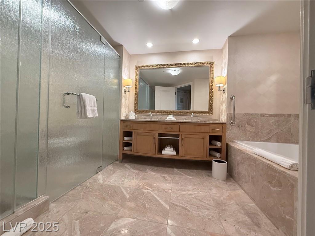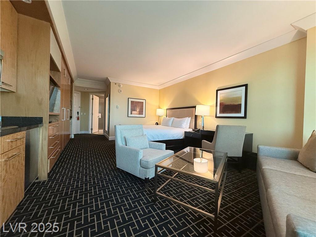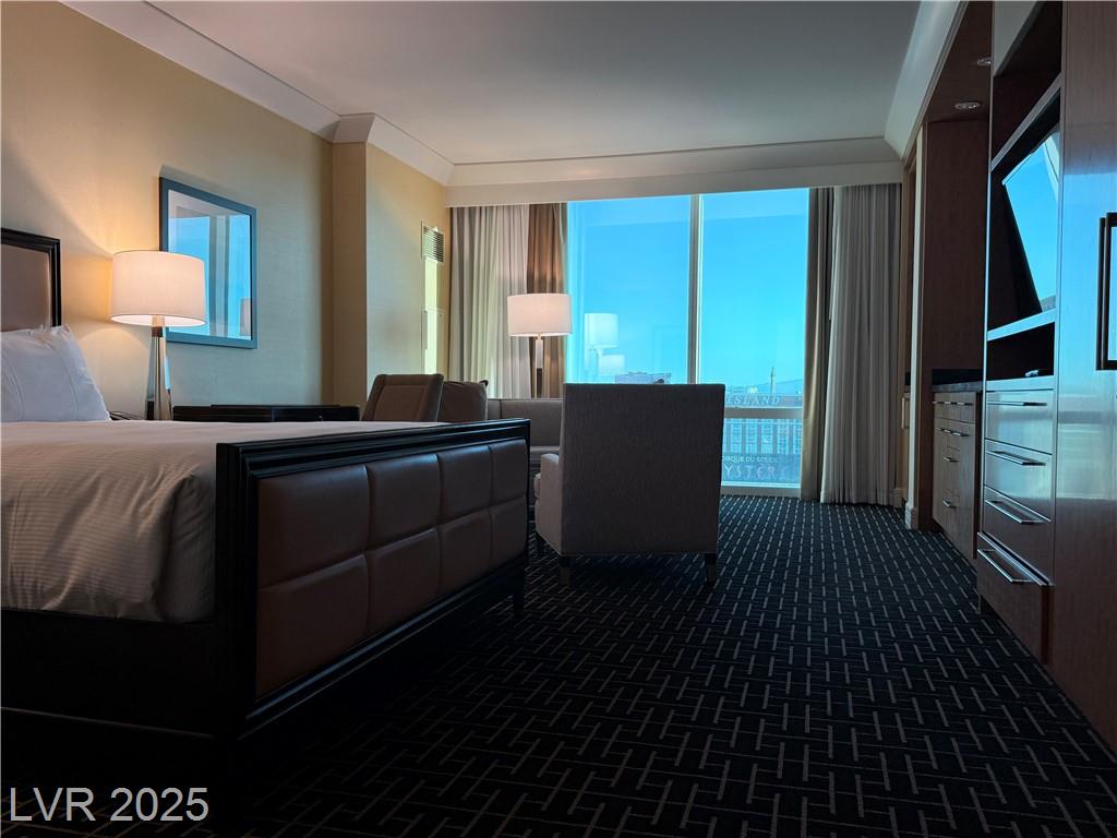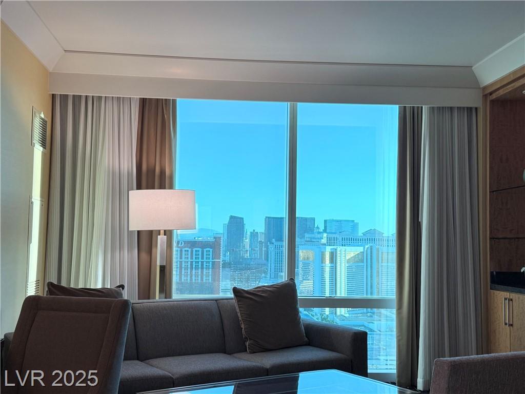 Experience refined elegance at the iconic Trump International Hotel Las Vegas. This beautifully designed studio residence blends sophistication with comfort, offering 534 square feet of stylish living space and captivating Strip views from towering floor-to-ceiling windows. The interior exudes warmth and modern luxury, featuring custom cabinetry, granite surfaces, and a sleek kitchenette for effortless convenience. Relax in the king-sized bed surrounded by rich finishes, or unwind in the lavish marble bathroom with its deep soaking tub and separate shower. Perfect as a private retreat or an exceptional investment opportunity, this residence delivers the ultimate Las Vegas lifestyle—luxury, service, and glamour at your doorstep.