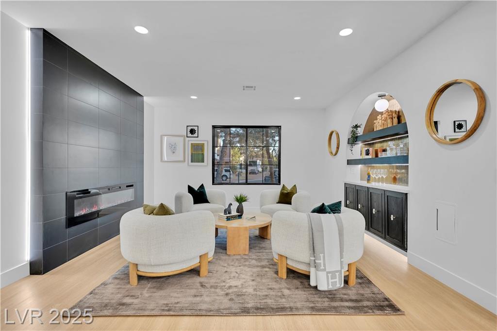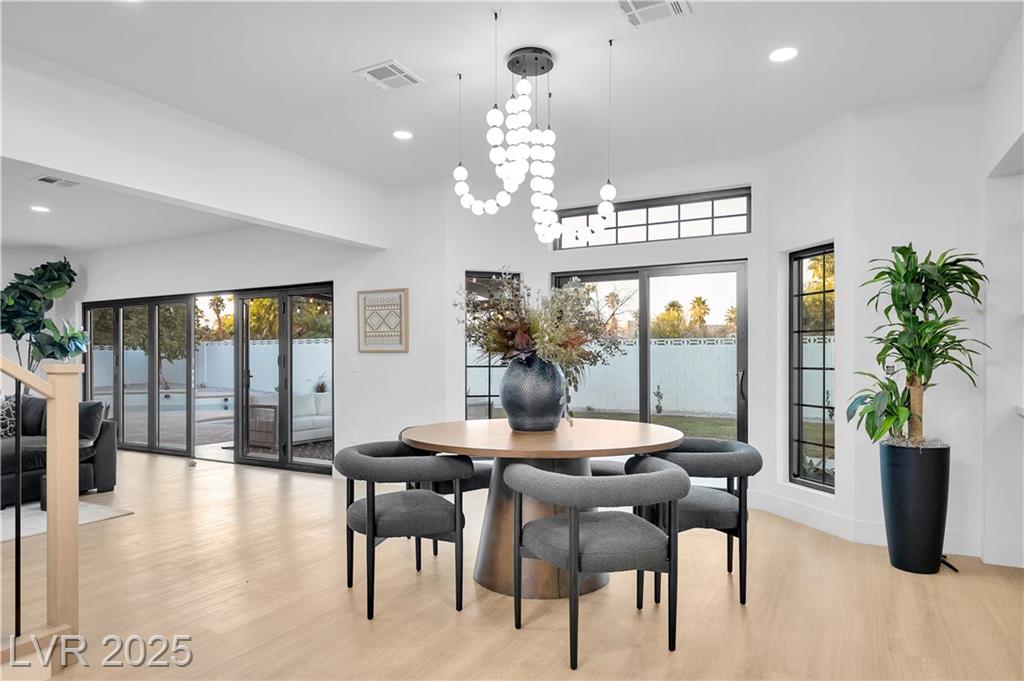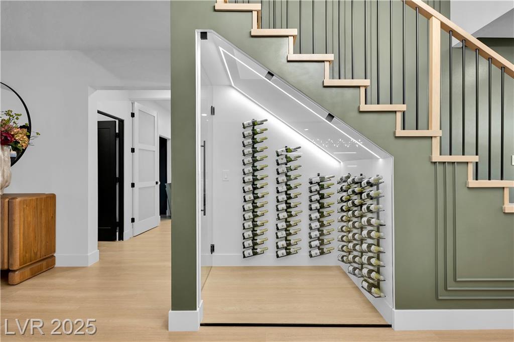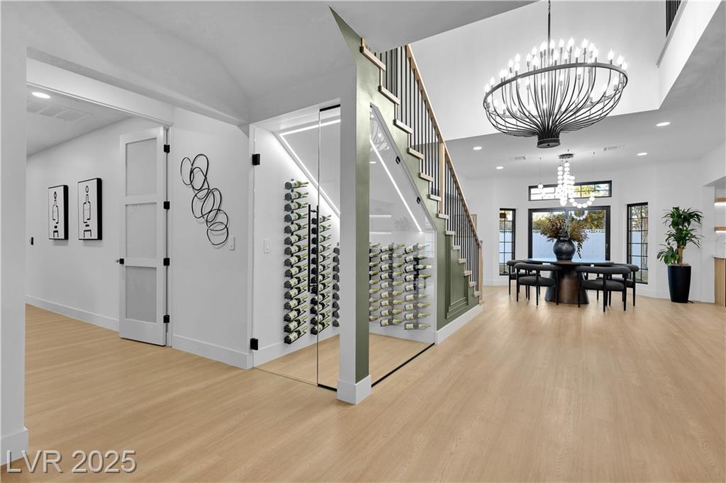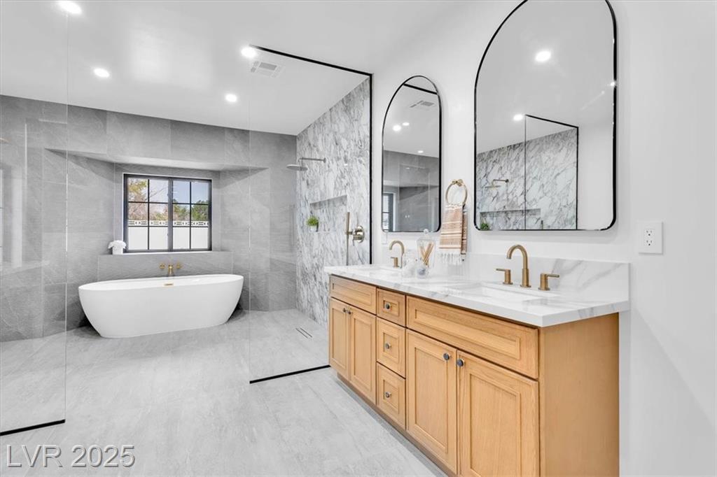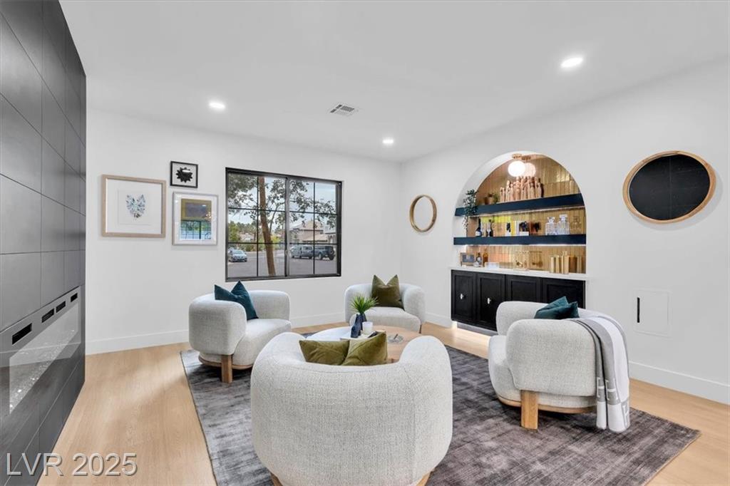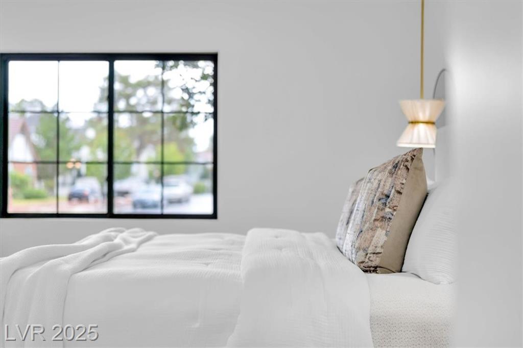Luxury Residence in Prestigious Section 10, known for its sprawling estates, oversized lots, and timeless prestige. This fully renovated 6-bedroom, 5.5-bath luxury residence offers over 5,400 sqft of living space, including a versatile 1,100 sqft basement or next-gen suite. Highlights include a chef’s kitchen with quartz waterfall island, hidden prep kitchen with butler’s pantry, with Z-Line appliances. Expansive glass sliders open to a resort-style pool & spa, pickleball, basketball courts 4-hole mini golf, RV parking with full hookups, & lush desert landscaping. The spa-inspired primary suite boasts dual showers, freestanding soaking tub, walk-in closet, vanity, & private washer/dryer. Additional upgrades include wide-plank luxury vinyl flooring, smart home lighting, Tesla charging station, epoxy garage floors, and even a doggie spa. Set on nearly half an acre with no HOA, this estate blends modern glamour with the prestige of Section 10, just minutes from the Strip.
