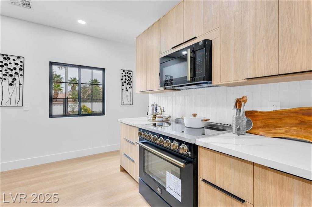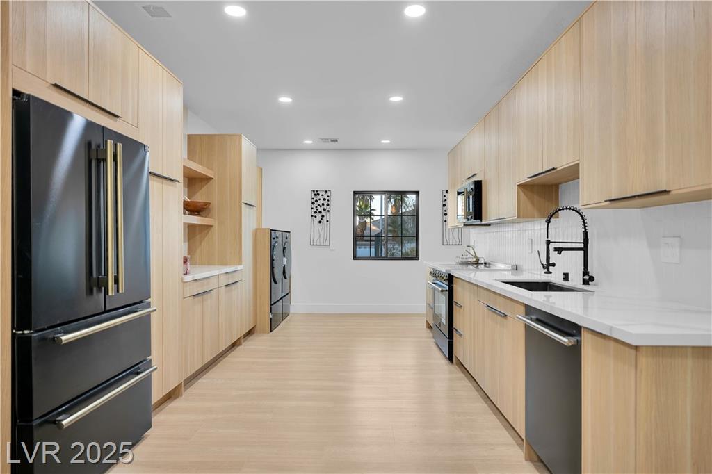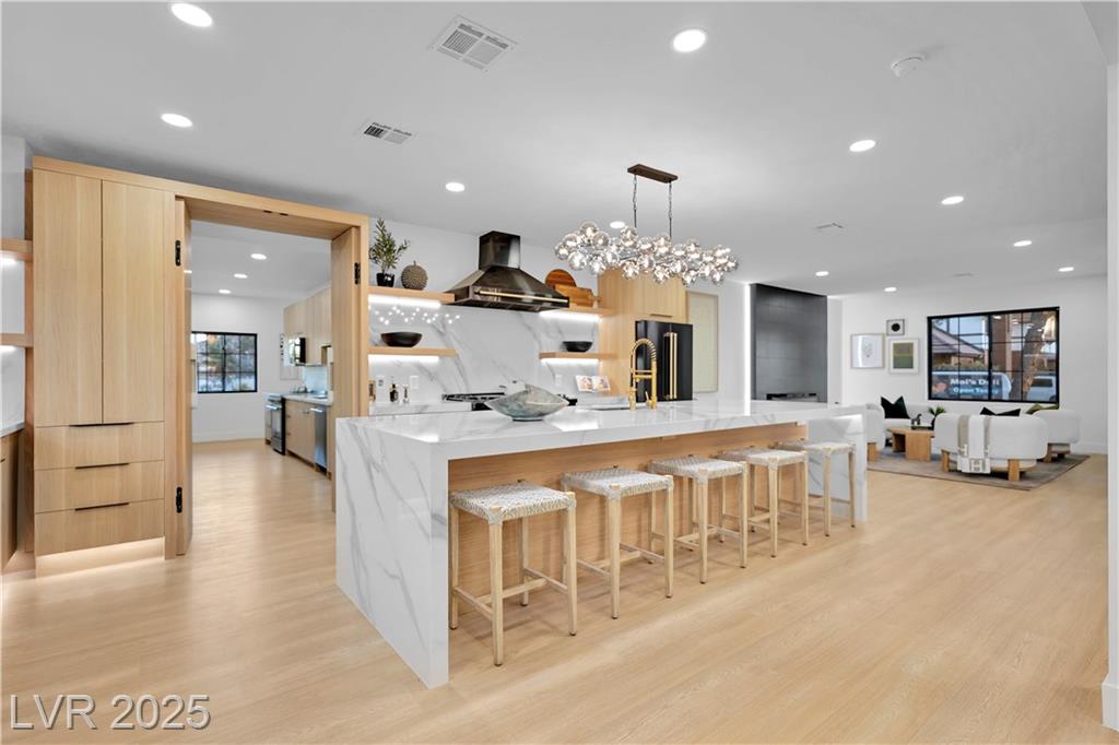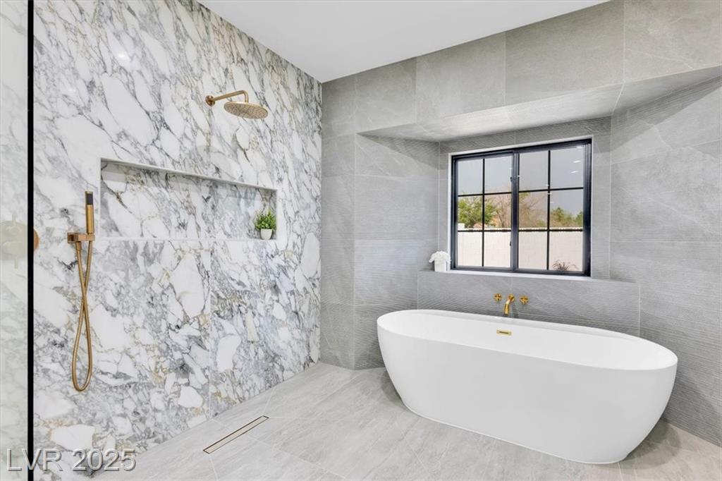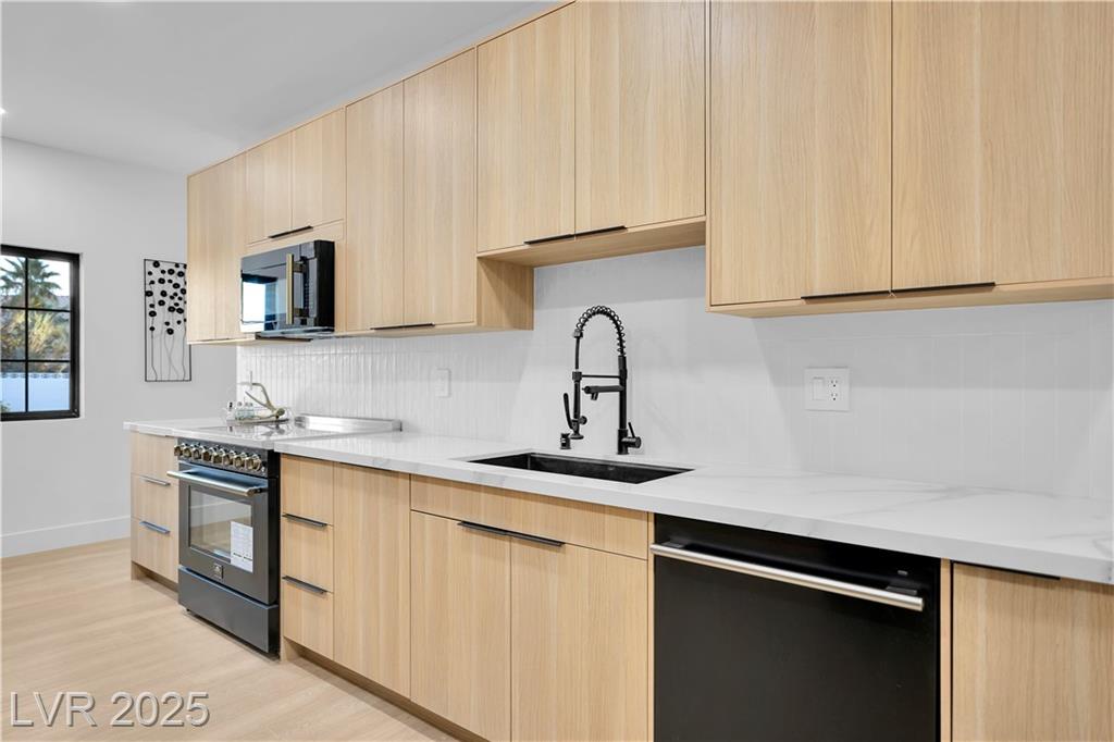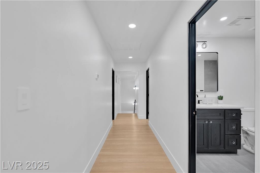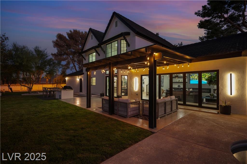 Luxury Residence in Prestigious Section 10, known for its sprawling estates, oversized lots, and timeless prestige. This fully renovated 6-bedroom, 5.5-bath luxury residence offers over 5,400 sqft of living space, including a versatile 1,100 sqft basement or next-gen suite. Highlights include a chef’s kitchen with quartz waterfall island, hidden prep kitchen with butler’s pantry, with Z-Line appliances. Expansive glass sliders open to a resort-style pool & spa, pickleball, basketball courts 4-hole mini golf, RV parking with full hookups, & lush desert landscaping. The spa-inspired primary suite boasts dual showers, freestanding soaking tub, walk-in closet, vanity, & private washer/dryer. Additional upgrades include wide-plank luxury vinyl flooring, smart home lighting, Tesla charging station, epoxy garage floors, and even a doggie spa. Set on nearly half an acre with no HOA, this estate blends modern glamour with the prestige of Section 10, just minutes from the Strip.