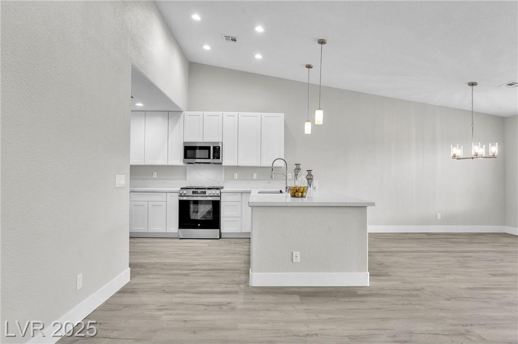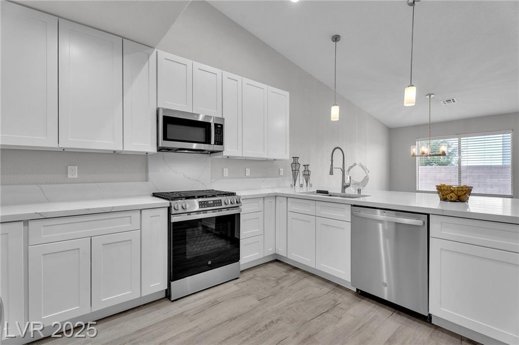 Completely renovated home in Whitney Ranch with a redesigned kitchen featuring shaker cabinets & all-new GE stainless steel appliances (refrigerator, range/oven, microwave & dishwasher). New stainless sink with Kohler faucet. The living space is enhanced by a 9-foot breakfast bar and 12-foot vaulted ceilings in both the kitchen & living room, creating an open, airy feel. All bedrooms have walk-in closets & are equipped with new Hunter ceiling fans & 2-inch blinds. The home also includes new interior doors, switches, outlets, light fixtures, & flooring throughout. Both baths have been updated with Kohler & Moen fixtures. The 20' x 18' finished garage provides ample space, & the 42' x 8' patio is ideal for outdoor living. Low-maintenance yards with a pomegranate tree & an eastern view from the back yard offering sunrises & mountain vistas. A new Lennox 3-ton HVAC system was installed in March 2019. Exterior & garage interiors were freshly painted. Please take a look before it is gone!