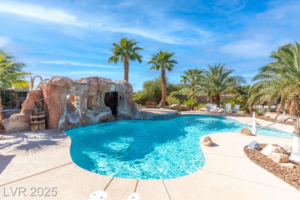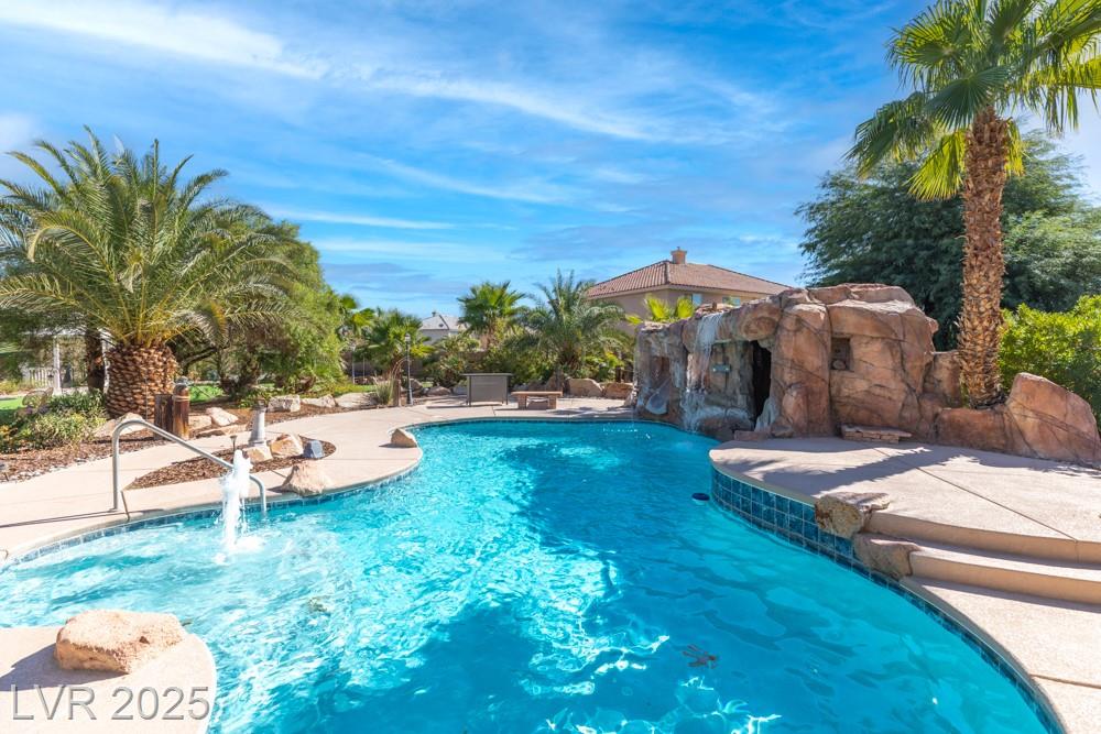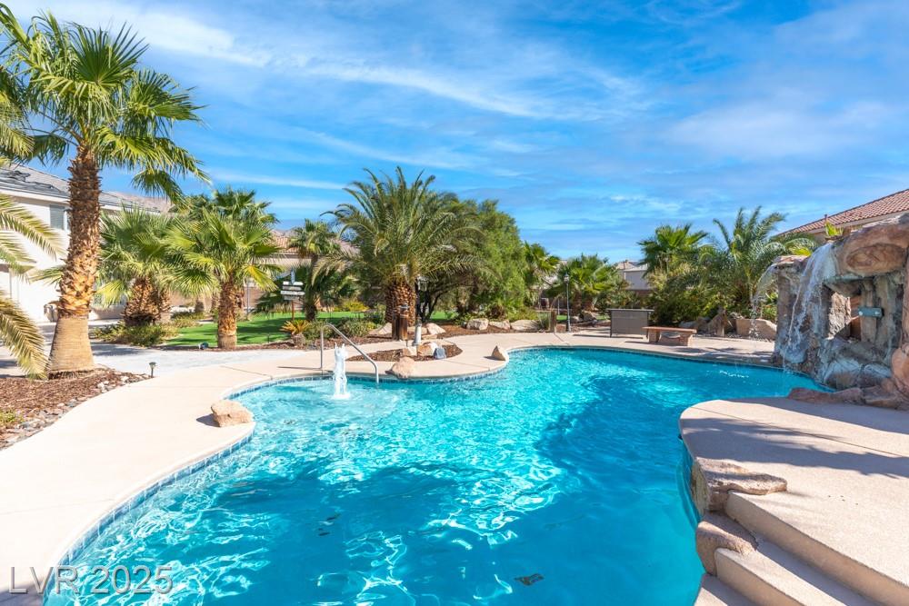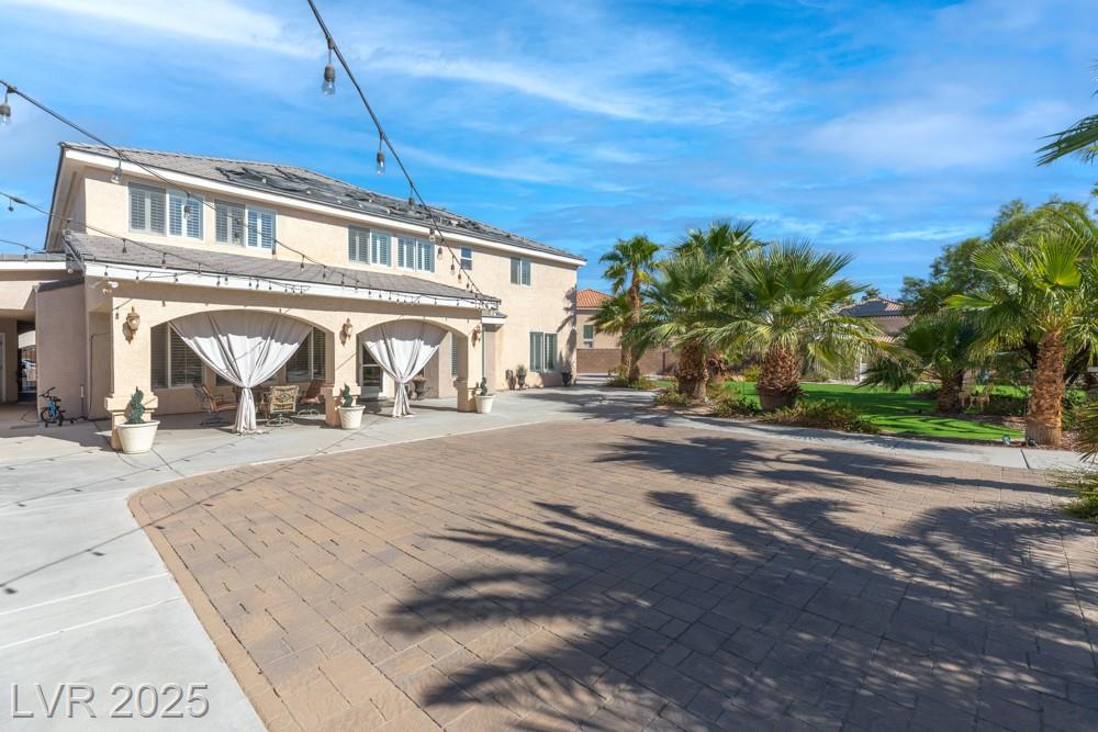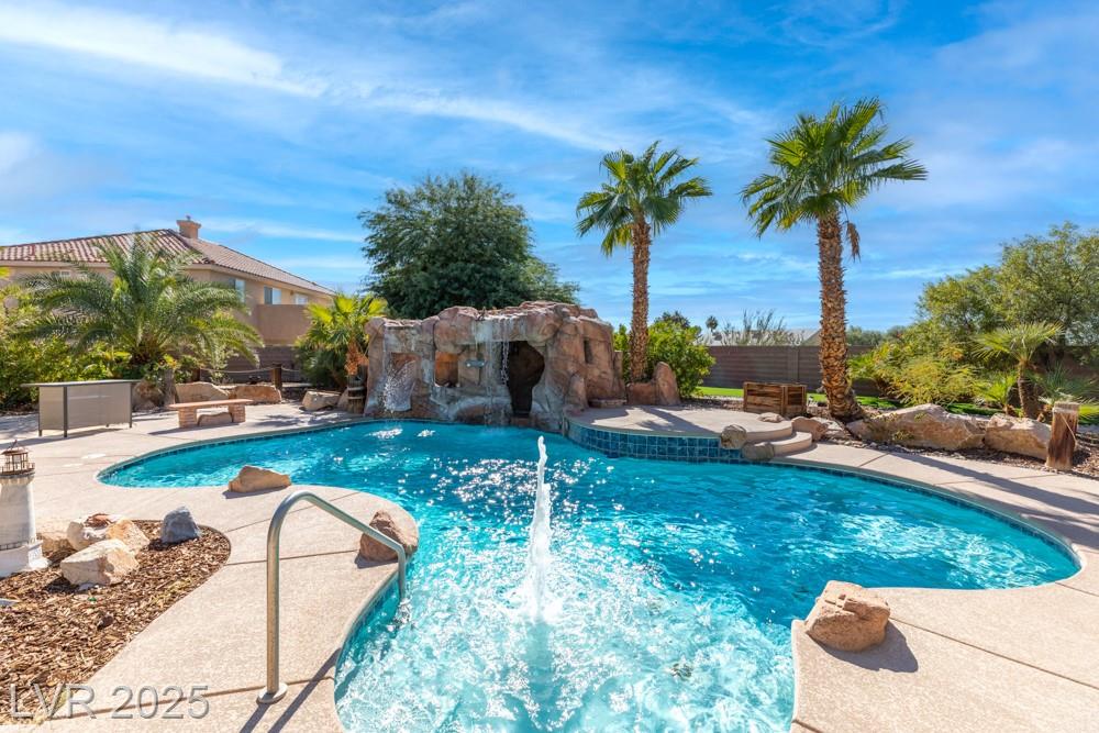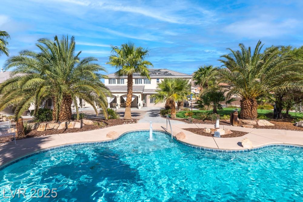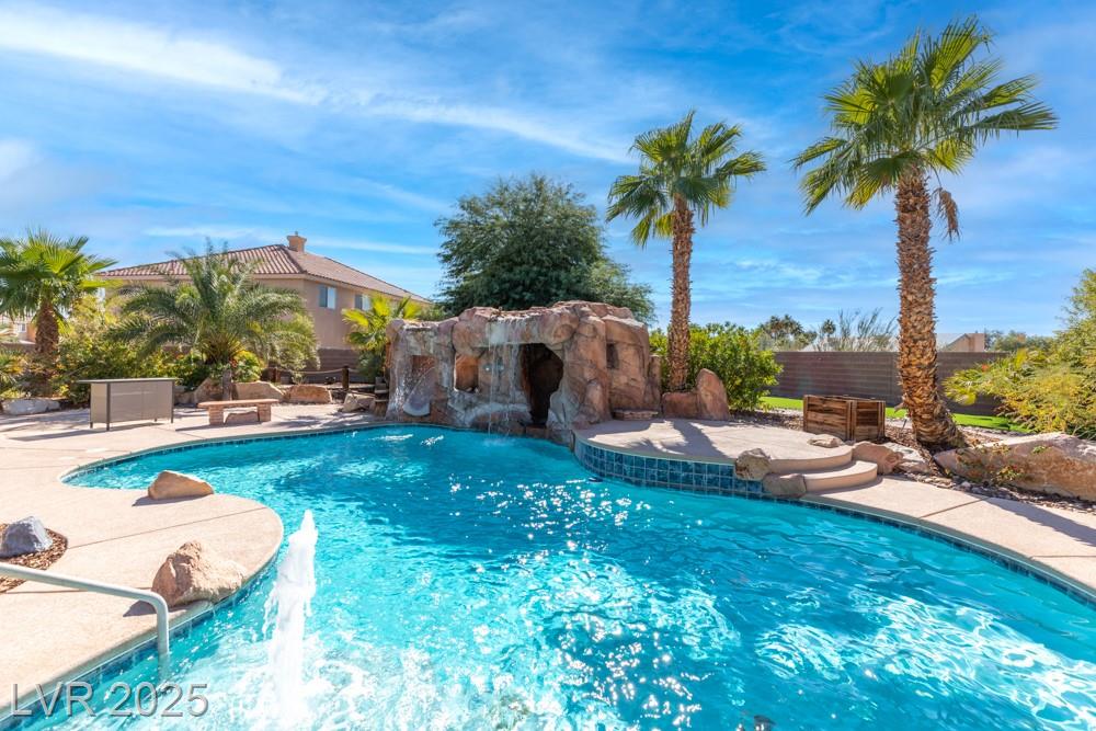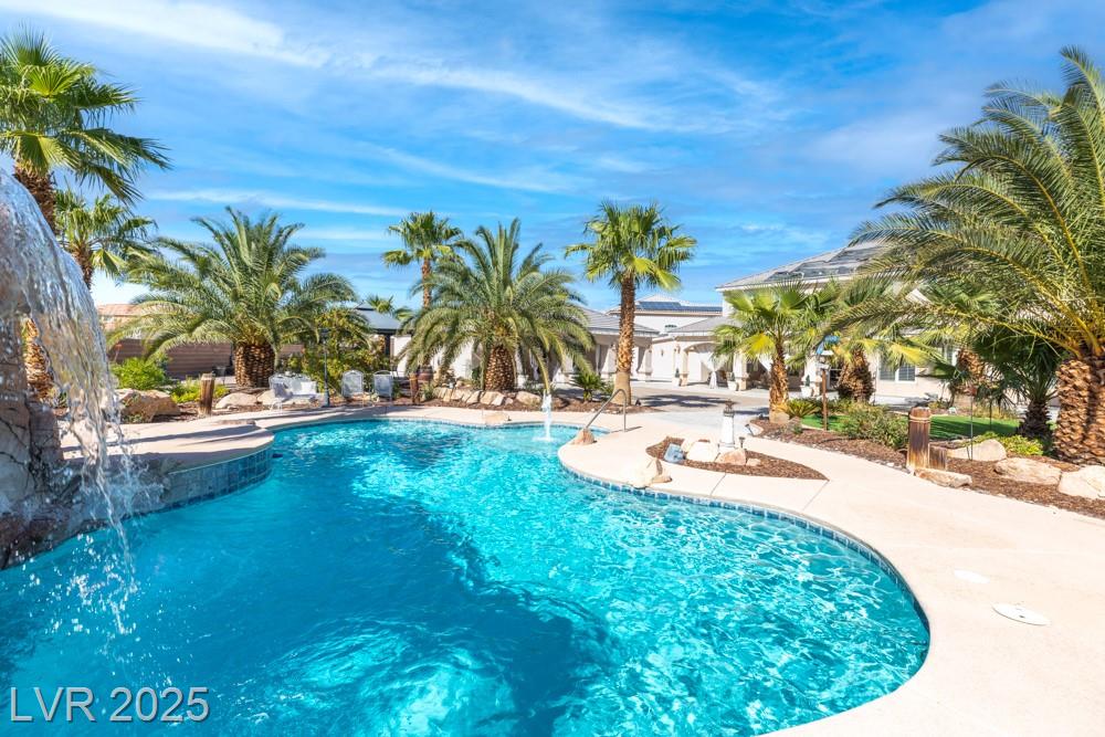 Rare near-1 acre lot with incredible Strip and city views. This property sits on a an oversized pie-shaped corner lot (the largest in the subdivision) and offers everything for true entertaining living. The main house features 6 bedrooms, an open floor plan, plantation shutters, stainless steel appliances, and a large primary suite with a walk-in shower. The separate full-size guest house is ideal for visitors or a mother-in-law suite and includes its own full kitchen, family room, bedroom, and laundry area. Outside, enjoy huge covered patios, light-up gazebos, and a stunning backyard with a waterfall, private cave, and low-maintenance turf. There’s also a massive 5-car garage, RV and boat parking with plenty of room to spare, and open space for entertaining. Sprawling backyard with low-maintenance good looking turf, multiple sitting areas, pool and spa. Rare combination of modern, newer style construction with a very large lot size. Come make this beautiful estate yours today!