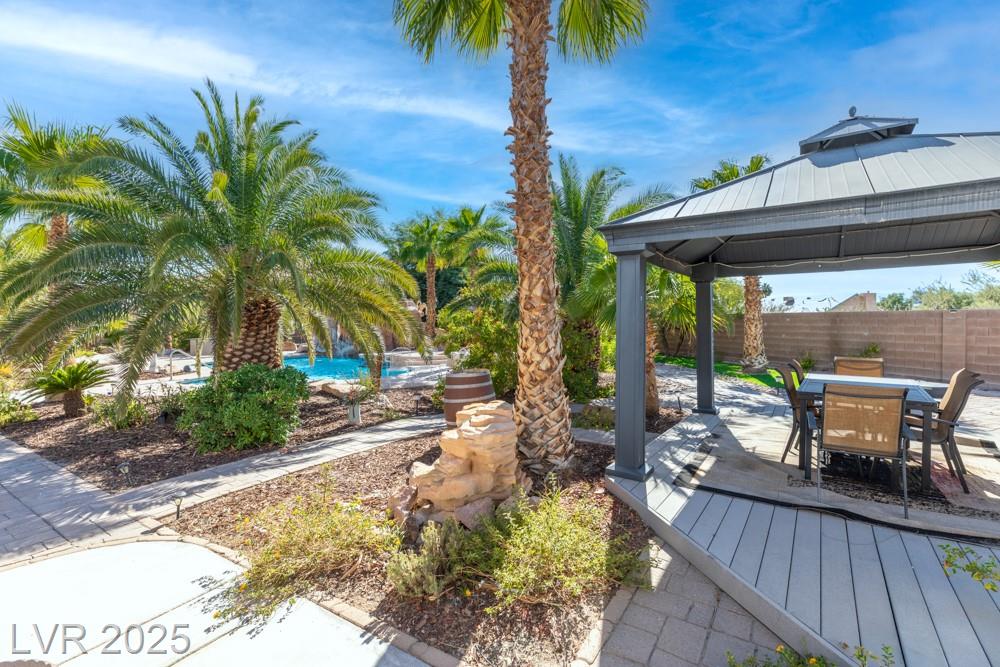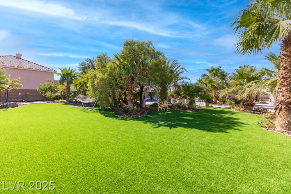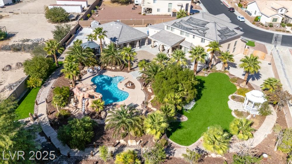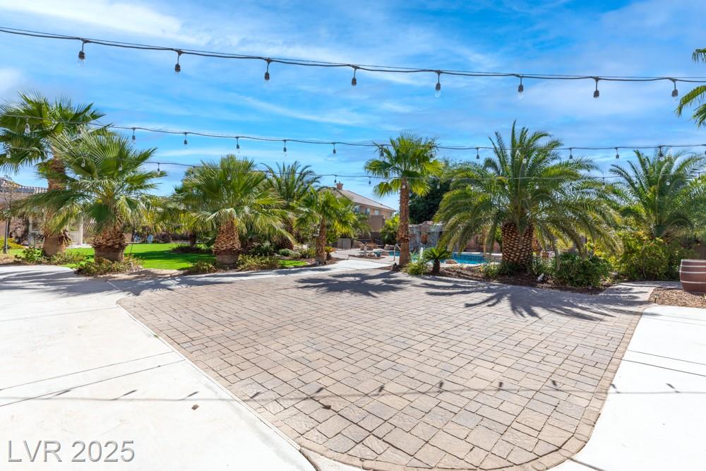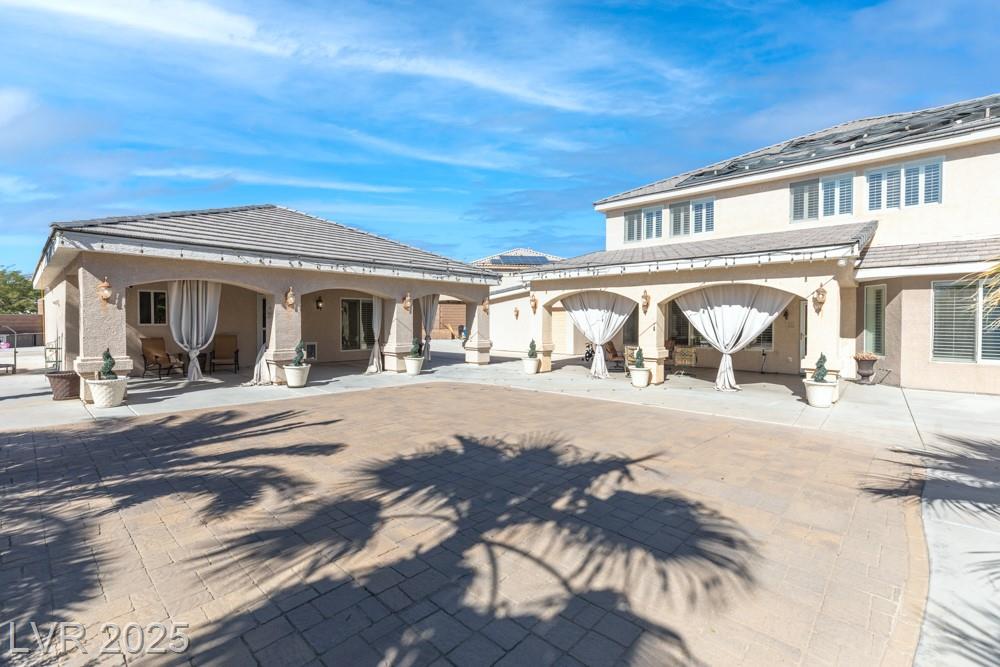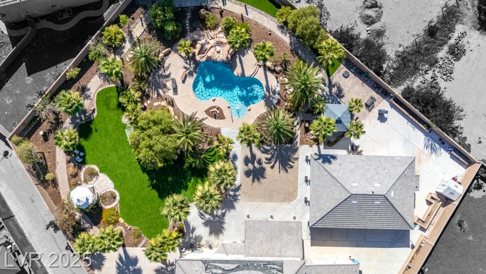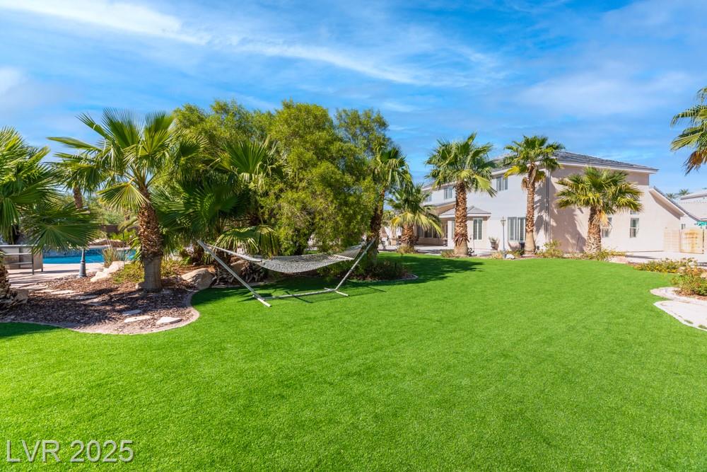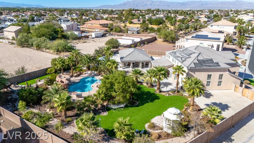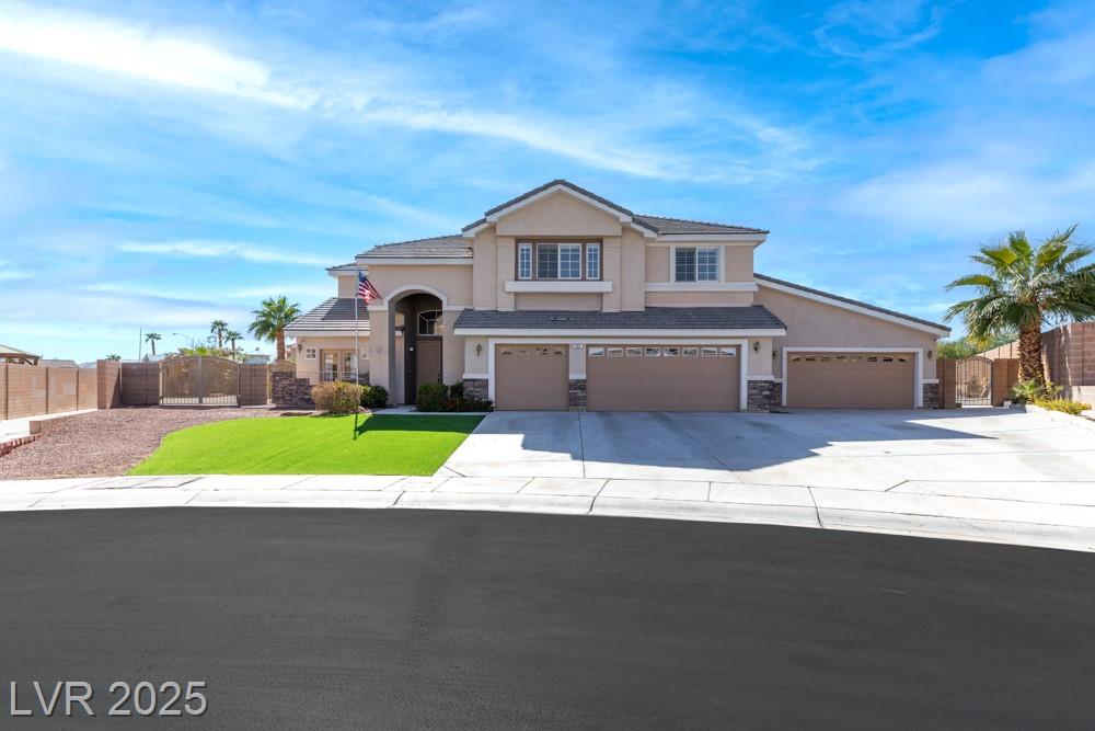 Rare near-1 acre lot with incredible Strip and city views. This property sits on a an oversized pie-shaped corner lot (the largest in the subdivision) and offers everything for true entertaining living. The main house features 6 bedrooms, an open floor plan, plantation shutters, stainless steel appliances, and a large primary suite with a walk-in shower. The separate full-size guest house is ideal for visitors or a mother-in-law suite and includes its own full kitchen, family room, bedroom, and laundry area. Outside, enjoy huge covered patios, light-up gazebos, and a stunning backyard with a waterfall, private cave, and low-maintenance turf. There’s also a massive 5-car garage, RV and boat parking with plenty of room to spare, and open space for entertaining. Sprawling backyard with low-maintenance good looking turf, multiple sitting areas, pool and spa. Rare combination of modern, newer style construction with a very large lot size. Come make this beautiful estate yours today!