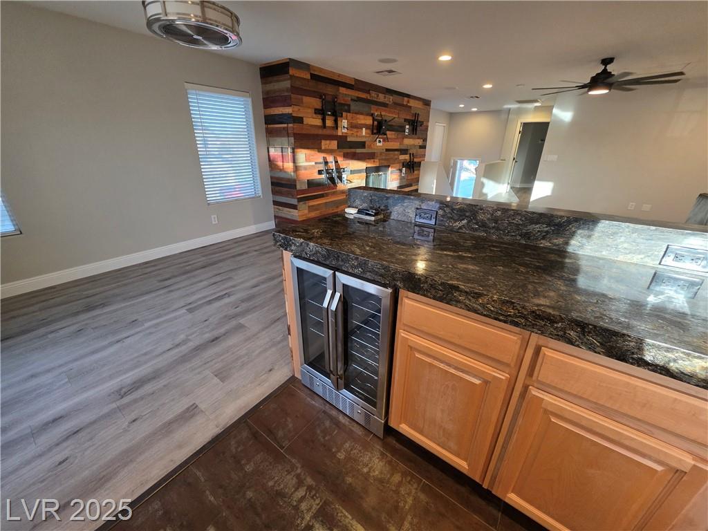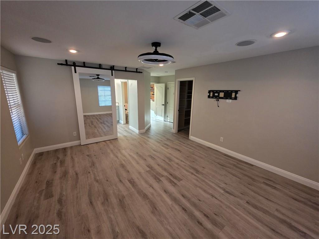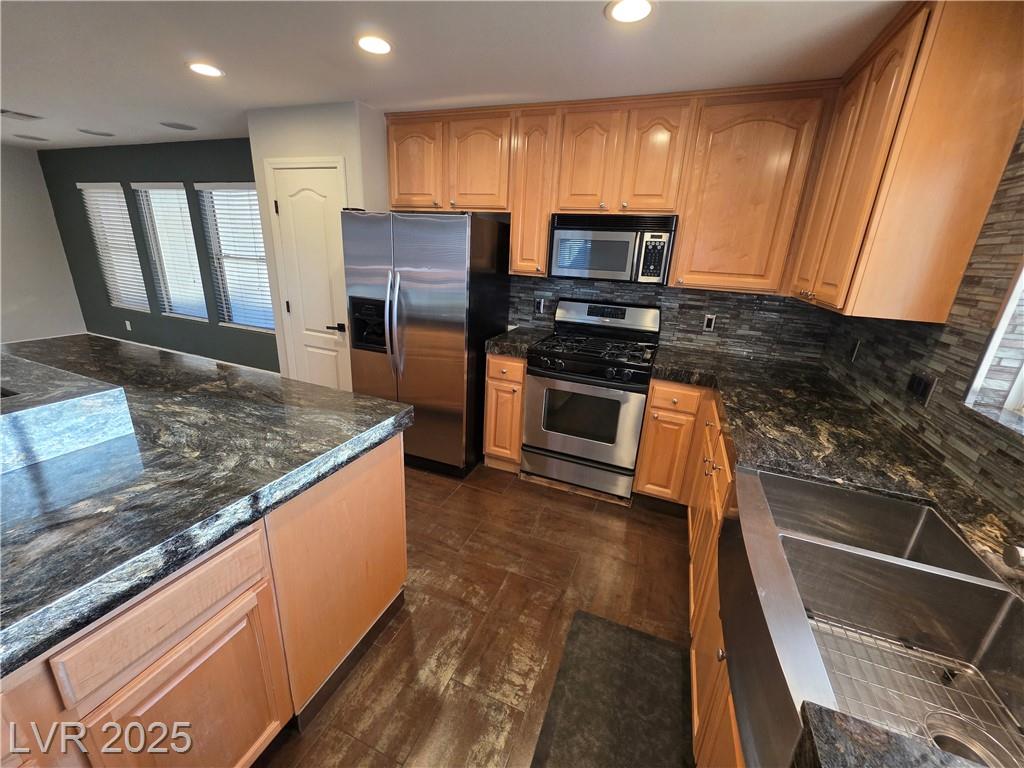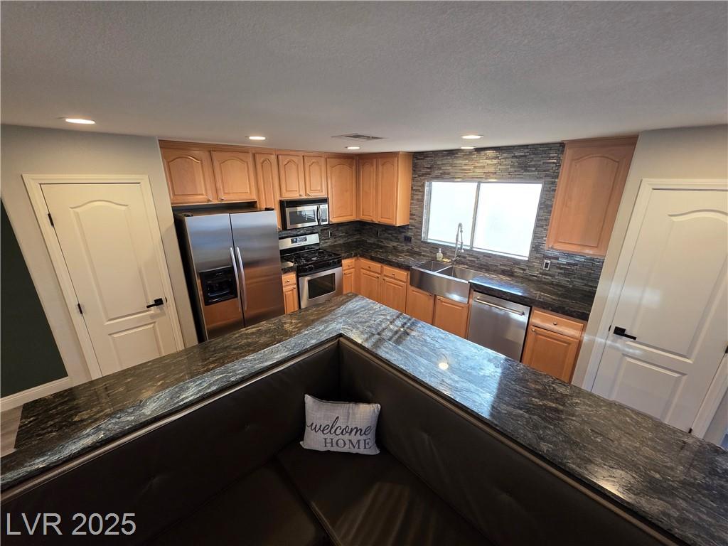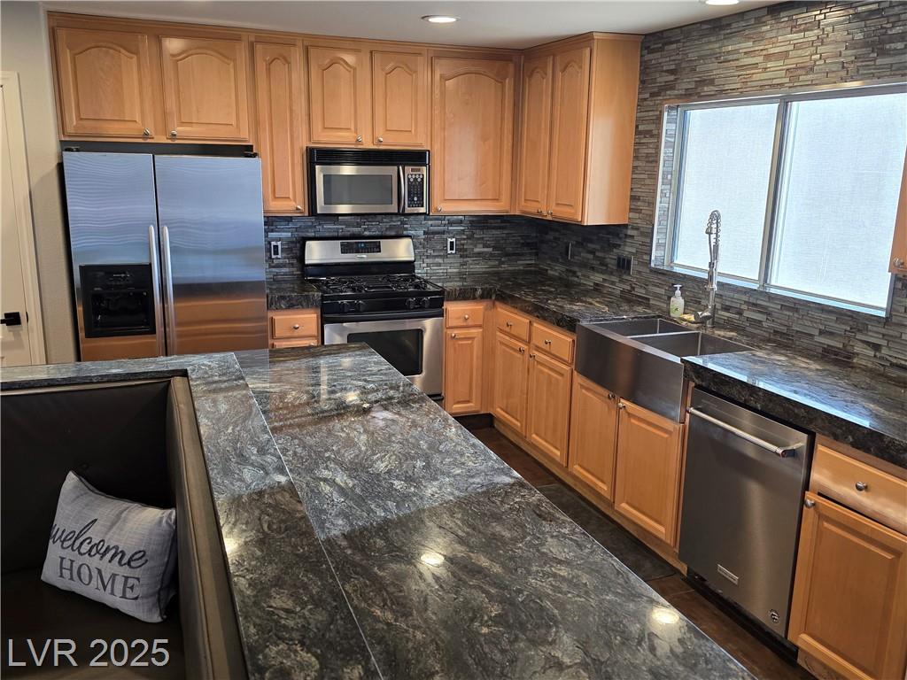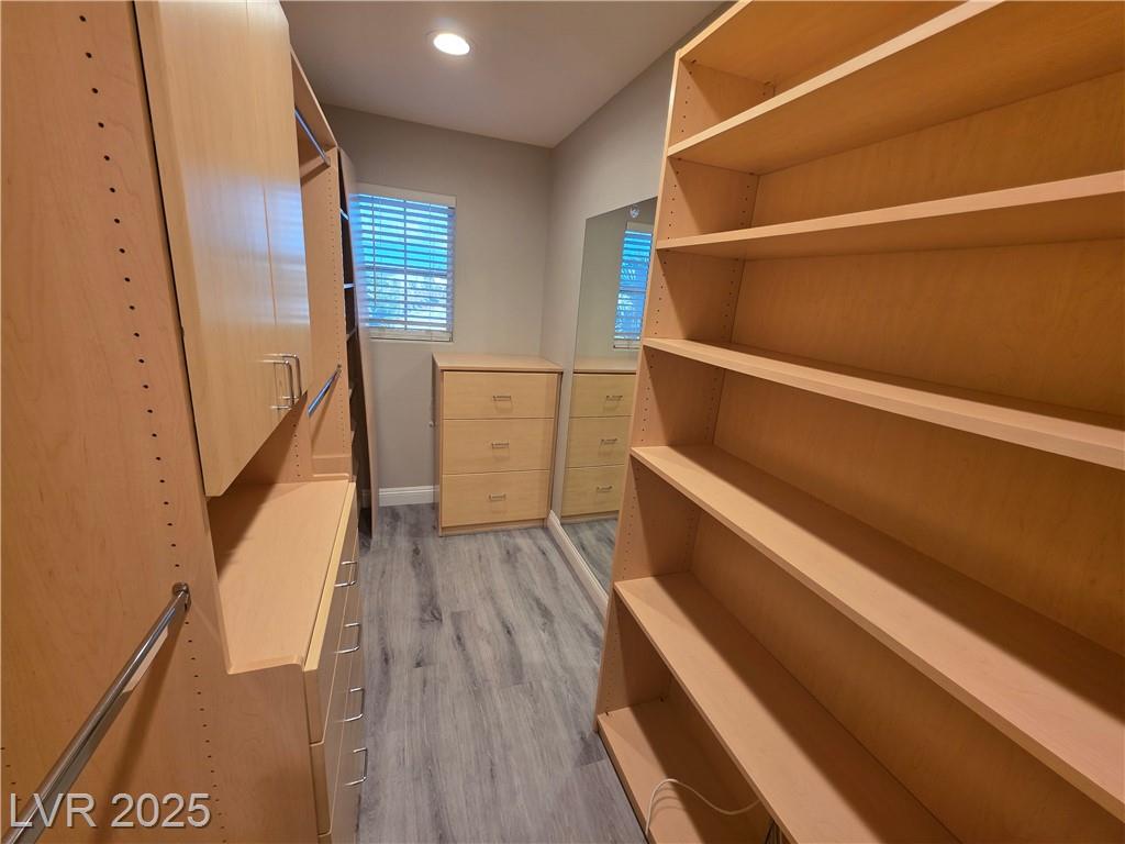 Highly upgraded Henderson/Silverado Ranch area corner lot home offering 4 bedrooms & 2.5 bathrooms. This lovely renovated split-level home offers so many nice options. Beautifully upgraded kitchen offers all stainless steel appliances, extra cabinets in a friendly L-shaped configuration, wine fridge, farm-style sink & added eating area overlooking the huge living area able to accommodate up to 5 tv's. There is even a balcony overlooking the backyard. Rolladen shutters and upgraded ceiling fans throughout ! The huge Primary Bedroom closet has California Closets offering lots of possibilities. The Primary bathroom with farm-style door, separate garden style tub, stunning walk-in shower and dual sinks. Don't miss. Downstairs offers another large family room, 3 nice-sized bedrooms and a great entertaining backyard. Great use of concrete, synthetic grass and desert landscaping highlight the area with a covered patio. Don't miss this stunner. Lots of parking possibilities being on a corner!